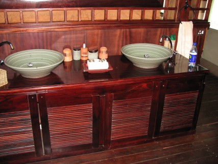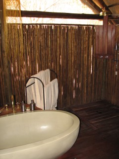 Eventually, after an hour or so, we made our way to Selinda camp. Just on the drive from the airport, we were happy with what we had seen. We had no idea what to expect, but in one hour our expectations had already been exceeded. The camp and the rooms were amazing in terms of décor and amenities. We had a nice double sink, a walk-in shower and massive tub, a desk, and a great view out the front door. The camp had a plunge pool (we never used it), as well as a massive lounge area, dining area, and bar. The view from the lounge area was fantastic, as animals congregated to the spillway. We had tea in the lounge area, then went out on our first game drive.