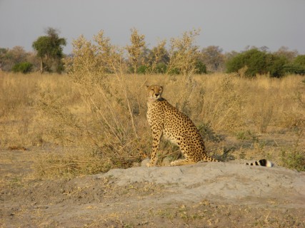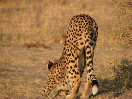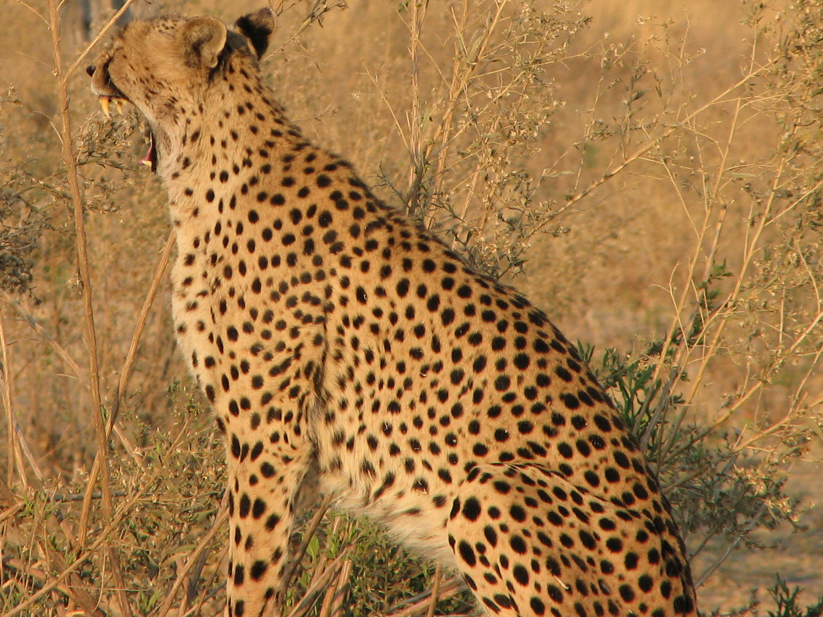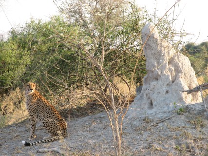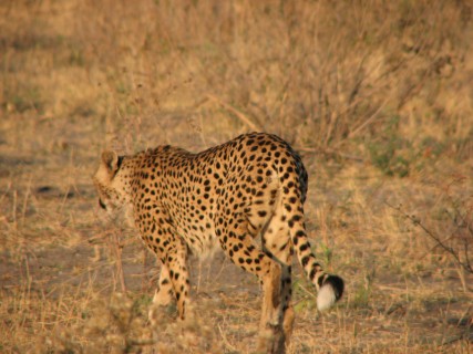 Then we were going along the road, and BB stopped, then went in reverse briefly, and said "Cheetah." We saw nothing, but as we started driving right towards it we could see it lying on a hillside. It had just woken up, and was going through its morning routine – looking left, looking right, looking back at us a couple times, then getting up and stretching and yawning. It basically posed for a long time, not at all concerned that we were there. After checking things out, she walked off and then jogged a bit until she got to another, taller, hill, presumably to use as a lookout for the rest of the morning. BB told us that in addition to this female, there used to be 3 brother cheetahs in the area, but now there are only 2, since one died from a snake bite within the last year. He told us that cheetahs usually run no more than 100 meters, with a maximum of 200 meters, before they have to give up – any more than that and they could die from exhaustion. The white tip on the tail, and black on the back of the ear, is to give off signals to cubs when they are following behind.