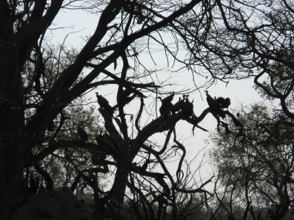 We drove around for awhile without anything of significant interest (more impala and warthogs), when we saw a lone hyena and then a bunch of vultures in the tree. We went to where the vultures were, and 50 or so additional vultures took off from what we quickly discovered was a dead elephant (picture is not graphic). BB surmised this is why the hyenas we saw the day before looked fat – they had already been to chow down. BB guessed that it had been dead about 36 hours, probably from natural causes.
