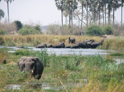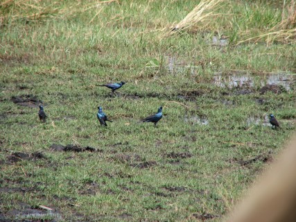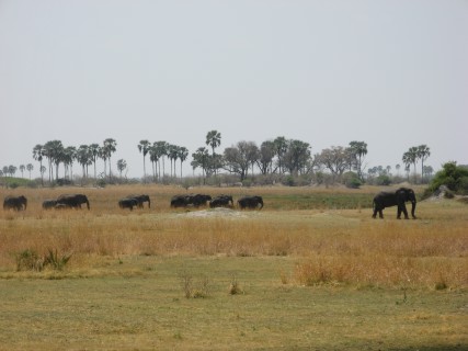 On our way back, we saw a handful of baboons, as well as a parrot chowing down on a Sausage Tree fruit. We also saw more warthogs and more hippos. One of them was eyeing us. Brunch was at 10:30, and people quickly dispersed to their respective tents after brunch. We stayed in the main sitting area, as dozens upon dozens of elephants walked by to graze and drink from the spillway. Later on some lechwe came by as well. A little closer to the main area there was a large group of starlings grazing. We were trying to catch up on the diary, but kept getting pulled away because of the photographic opportunities. We wondered why we were the only ones taking this in. It seemed a little too easy to find everything we were looking for. We worried we may have jinxed ourselves when we said that.