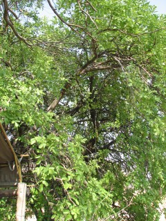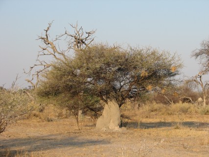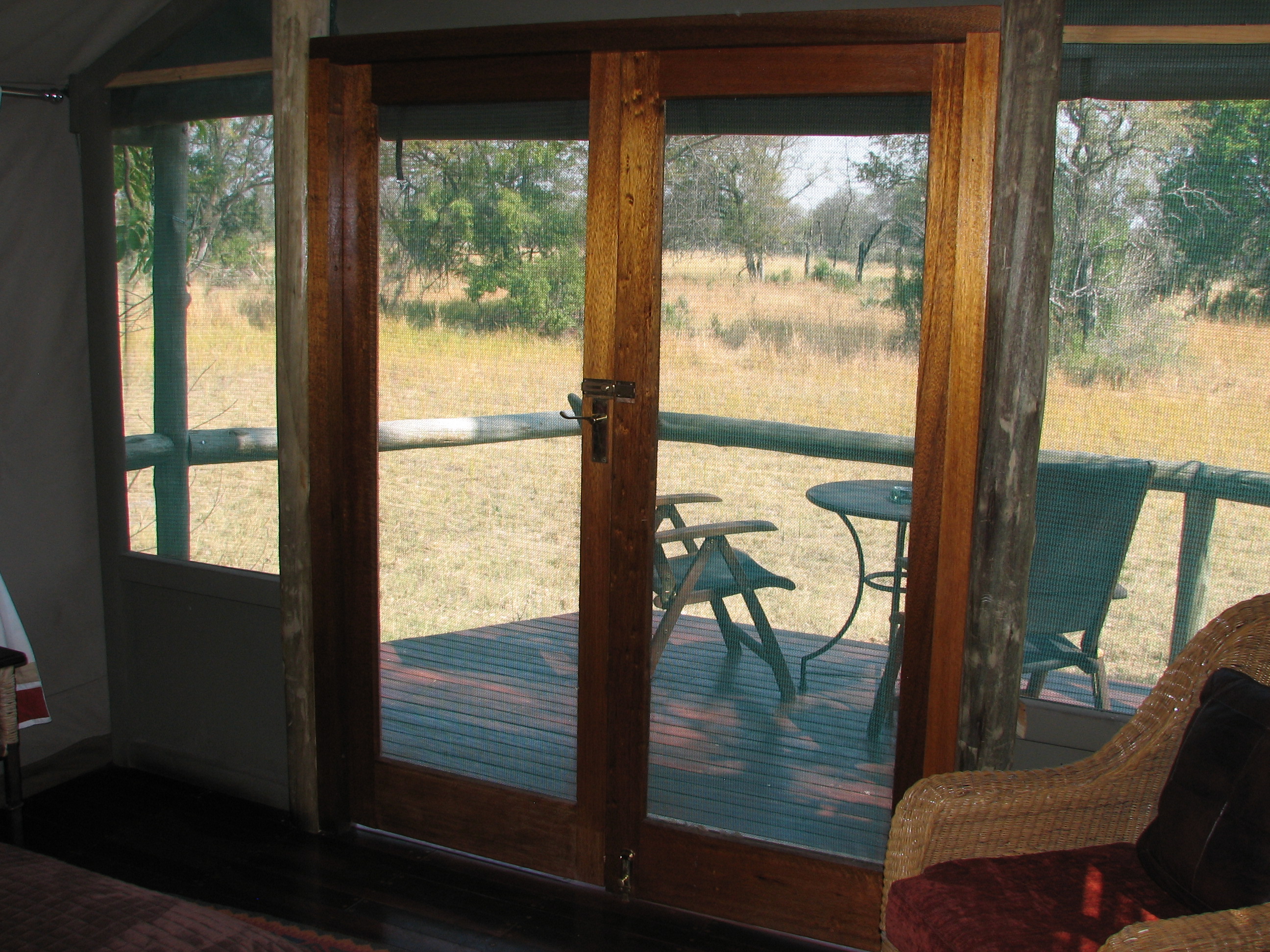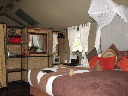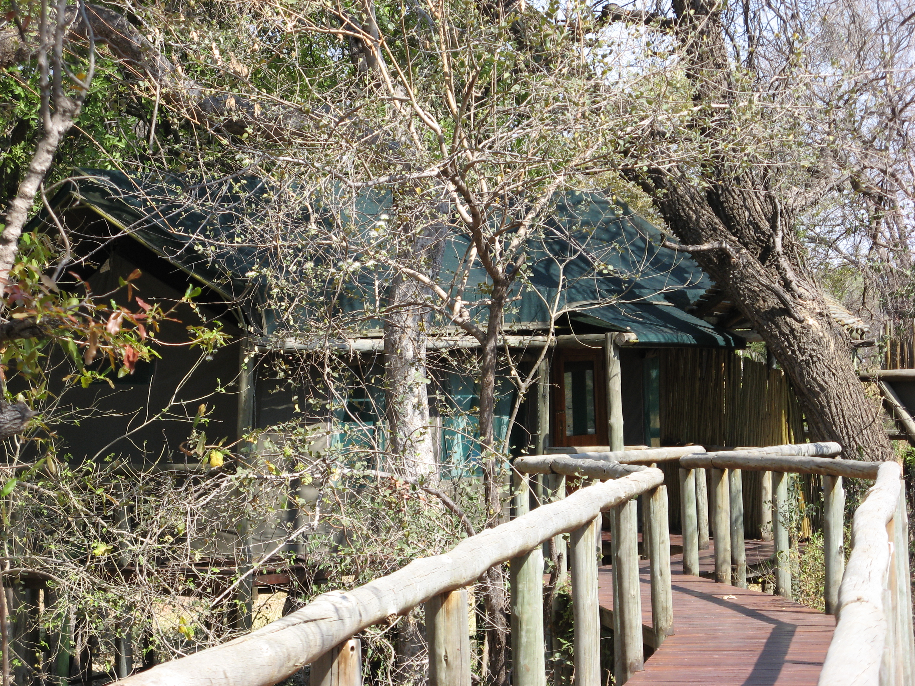 He went over everything with us, and perhaps because this was our second camp, and perhaps because Wilderness Safaris is a much more corporate organization, it seemed more dry and less welcoming. He did show us on the map where everything in the concession was, though, which we appreciated. He also whet our appetite by explaining that we had to keep our doors shut at night because there was a leopard that was always around, including the fact that it had been in camp the night before. Unlike Selinda, the whole camp was on raised walkways, and we were specifically instructed not to walk on the ground. The tent was very nice, but not quite as nice as Selinda, with the bathroom not being separated out like Selinda, and the shower and décor were not nearly as good. The view from the room was nice, but did not appear to have any animals. There was a nice sausage tree right outside the tent. Crystal took a nap, Justin caught up on the diary.