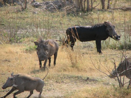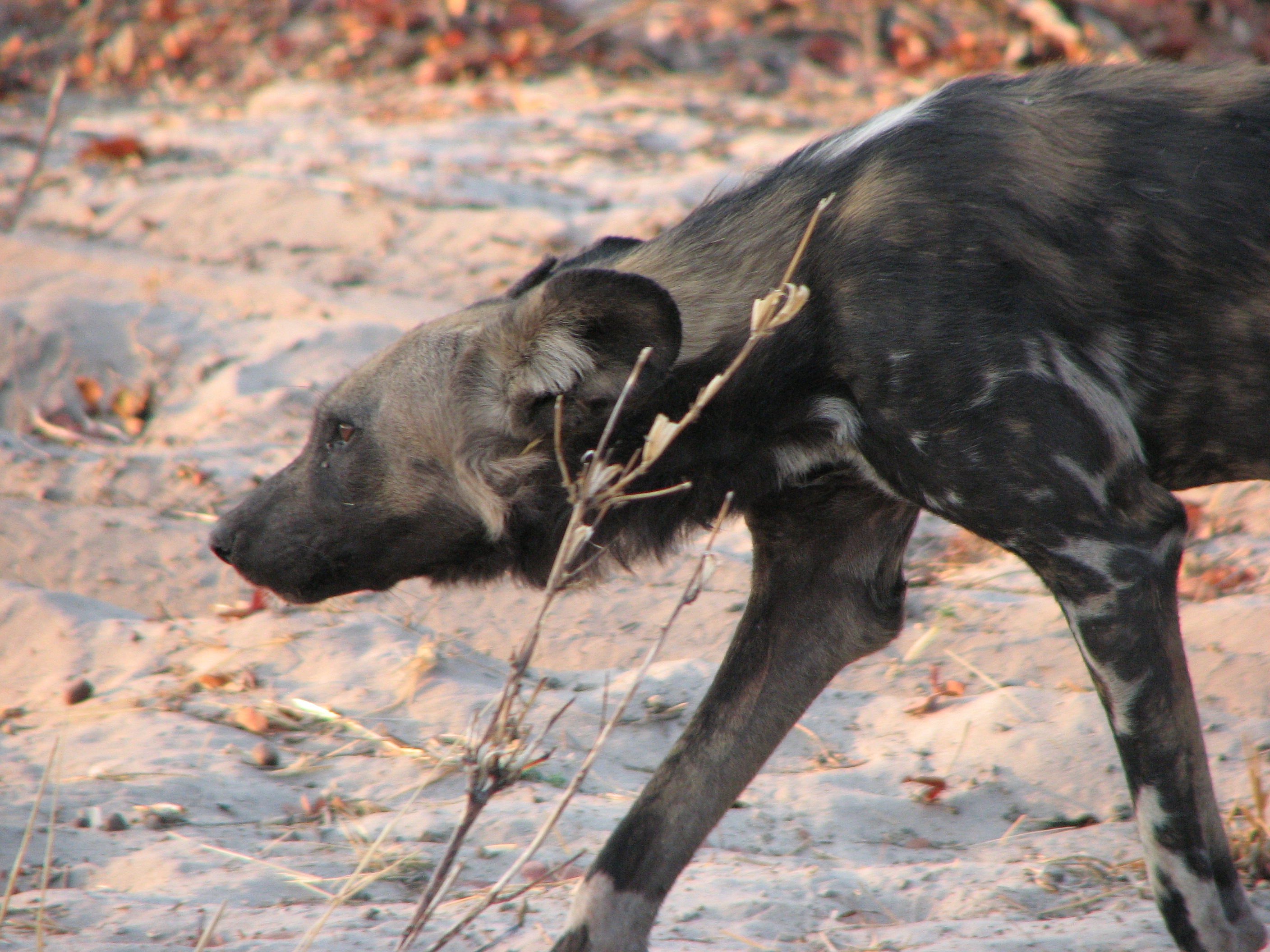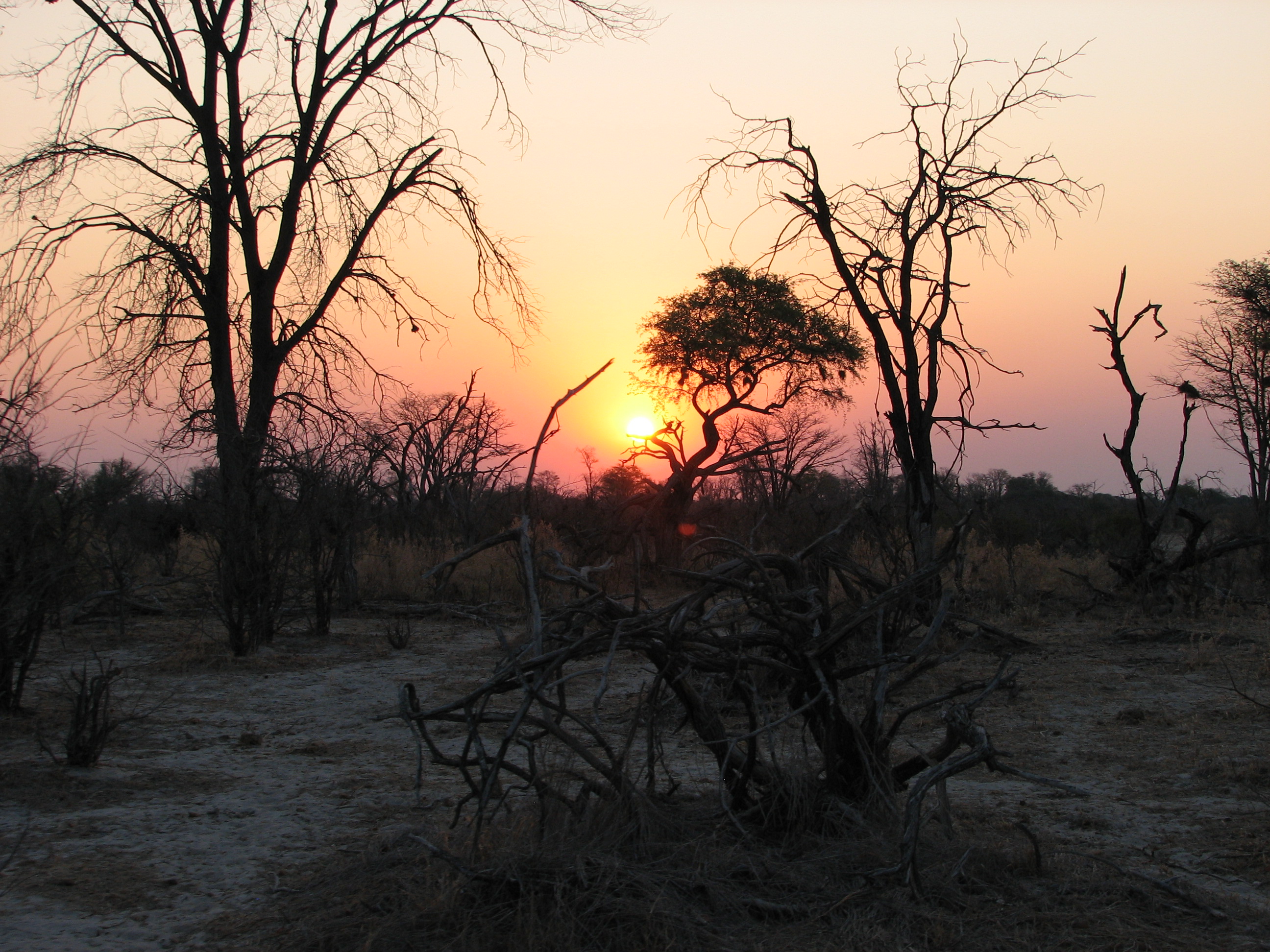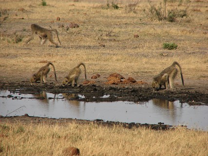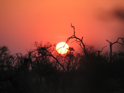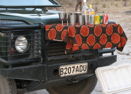 From where the dogs were denning, we went to a nearby open area and had sundowners. The front of the truck bent over to make a bar. It was a very nice sunset again, nicely backlighting all of the scrub. On the way back, we again went very slowly, while Newman drove and Fanie aimed the spotlight around. We saw a bushbaby, the world's smallest primate, who we found out pees on its legs and spreads its scent as it jumps from tree to tree. We noticed there were hot pockets in areas where there were trees, and cold pockets in areas where it was open plains – the difference must have been at least 5 degrees Fahrenheit. We also saw both spring hares and shrub hares. Shrub hares resemble the rabbits we have back home. Spring hares resemble small kangaroos, hopping around on two legs like them. We had dinner in the huta (sp?), in traditional fashion, with the women serving the men. We went to sleep early, as we were exhausted.