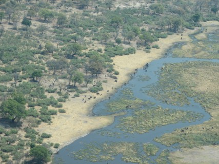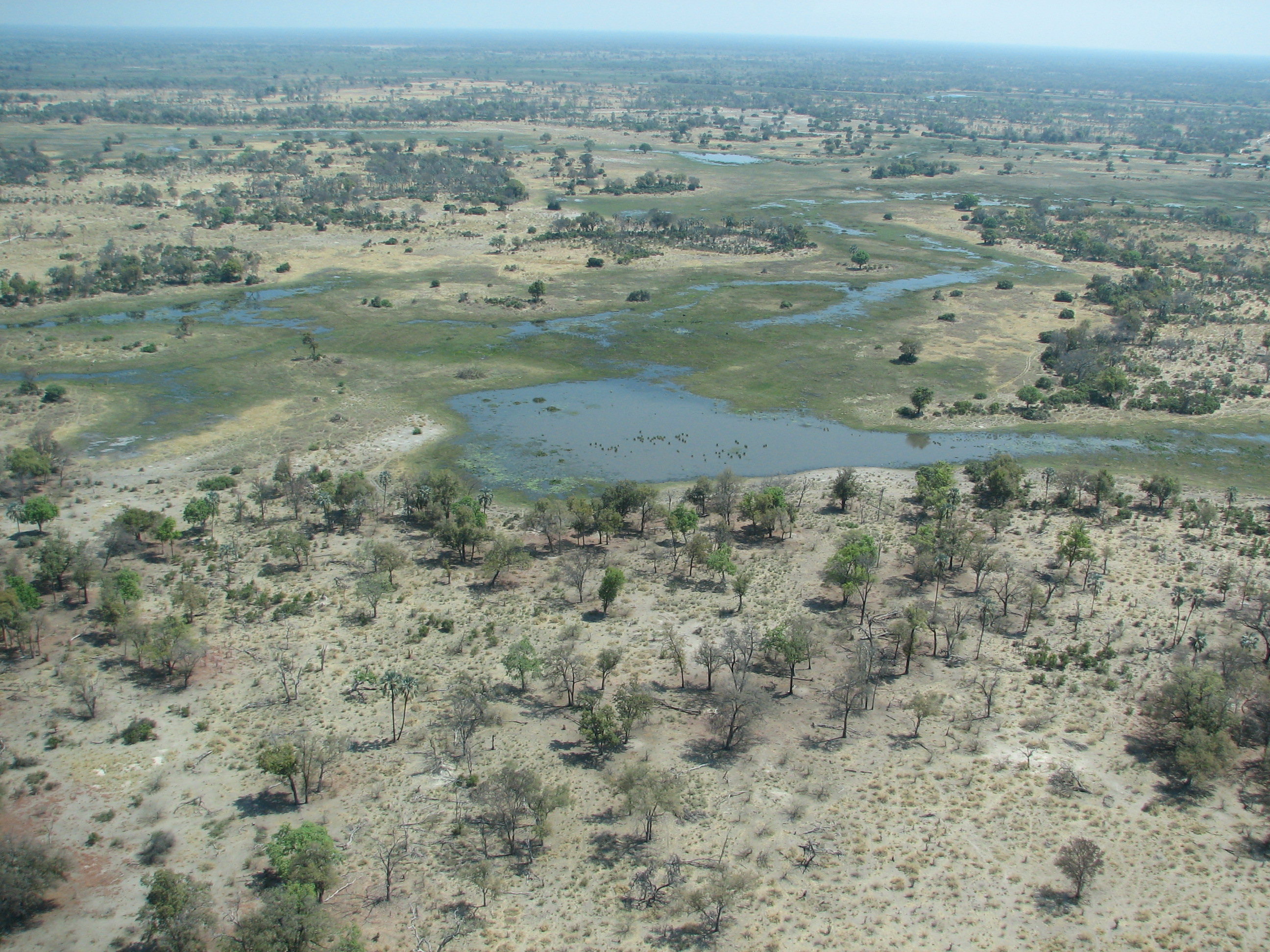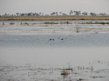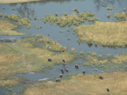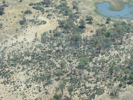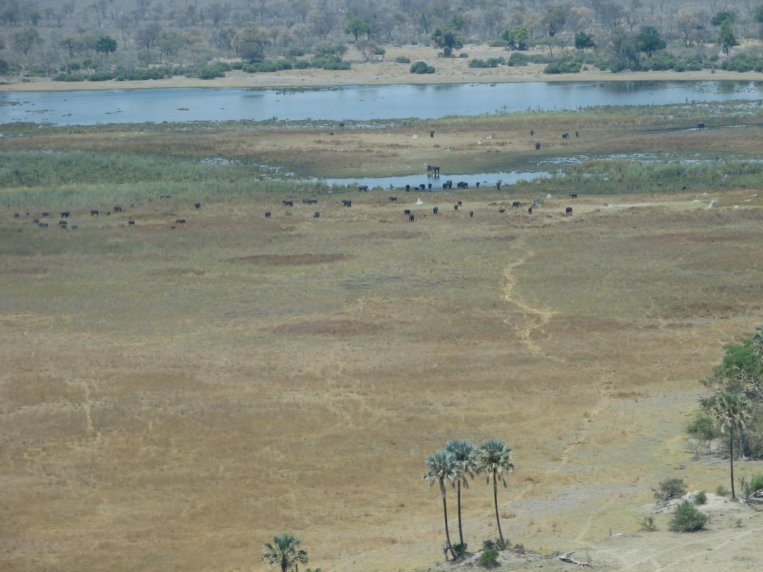 Our plane this time was about twice as big, and seemed much smoother. We made a 5 minute flight to King's Pool to drop someone else off, then headed down to Chitabe, which took about another 25. On the flights we saw a group of elephants, some of which were wandering down the shoreline, others were just standing around. Flying over the desolate mopane "forest" was a bit surreal – much look different in the wet season. As we started to approach Chitabe we saw more water and more palm trees.