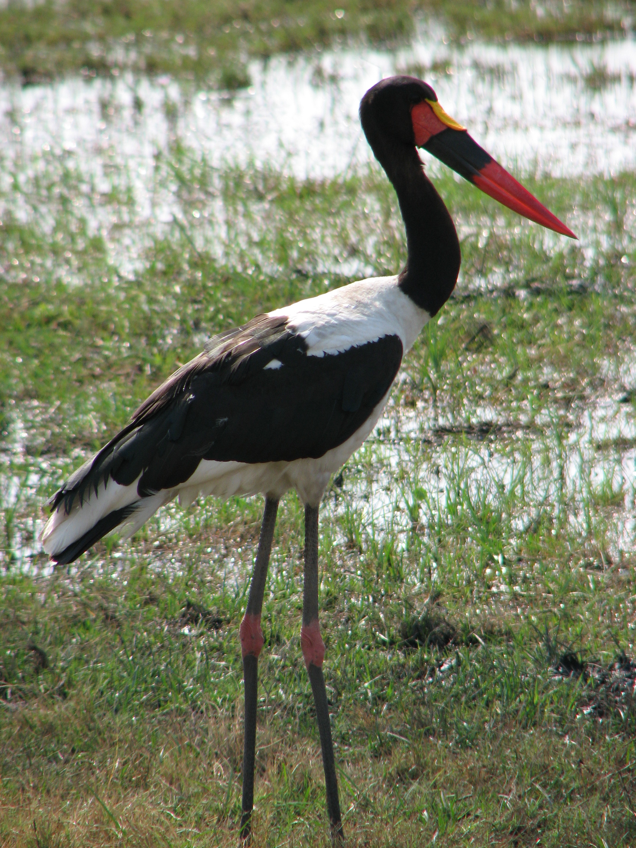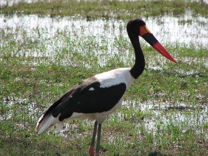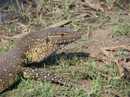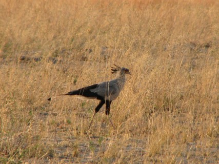 BB told us that contrary to what is commonly shown on television, a lot of hyenas are solo, and will group together only to scare off another predator from a carcass. We saw a secretary bird, which has very long legs and hunts on snakes. It has no feathers on its front, and its legs are very hard, so snakes that bite the front of it are very unlikely to get any venom into the bird. We saw dog prints, but there were no dogs. Then we saw leopard prints, but there was no leopard. We ended up far away from the camp, at the Zibalianja lagoon, near the NG15 and NG16 concession border. It was very serene there, with some birds, some hippos, and lots of calm water.