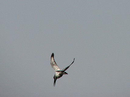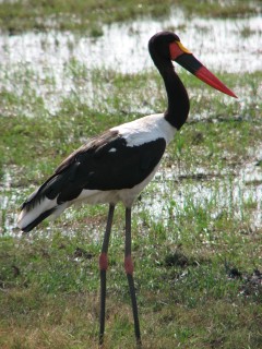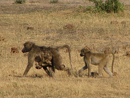 On the way back, we had a bit more luck and we encountered a large group of baboons heading down to a watering hole. One of them was getting carried by its mom. We also saw a wildebeest and a massive kudu. We also saw several kingfishers, which hovered about 15 feet above the water, waiting to dive in for small fish. We also saw a saddle-billed stork, which has a long red and yellow beak. We saw a solo giraffe feeding and a monitor lizard. Finally, we saw a group of warthogs, one of which was trying to mate with the females, who kept running around in circles and tiring him out.