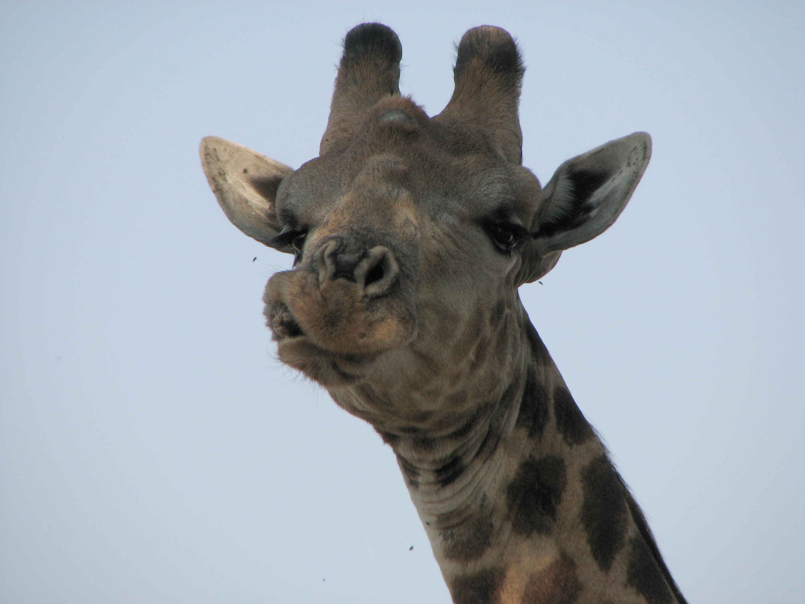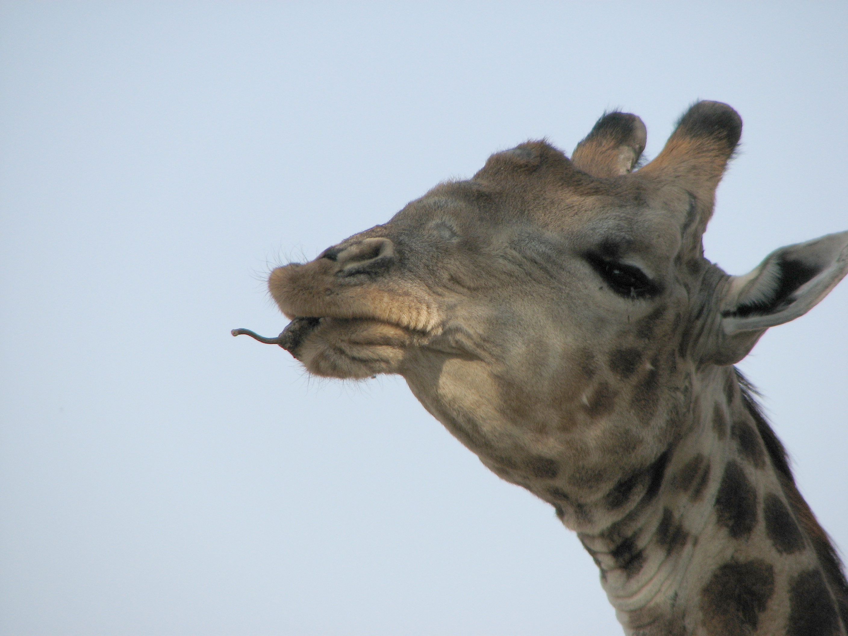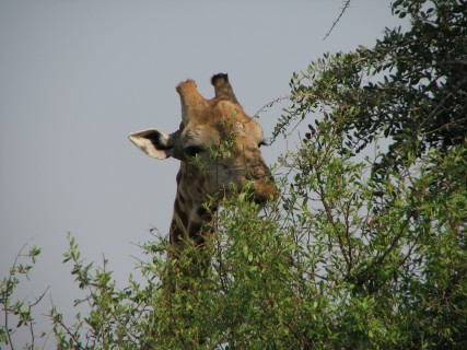 We left shortly after 4pm with our guide, Newman – we had requested he be our guide after hearing numerous good things. We found out he has been here since day one, and in fact helped design the camp. He has a completely different style than BB – he stopped far more frequently to look around and listen, and also explain things. First we stopped to look at a giraffe chewing on a sausage tree fruit. It could not swallow the sausage because it was too big, so it was trying to crush it to get the nutrients out. After that he showed us were scratch marks on a tree trunk, which he explained were from a female leopard marking her territory to others.