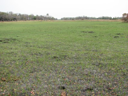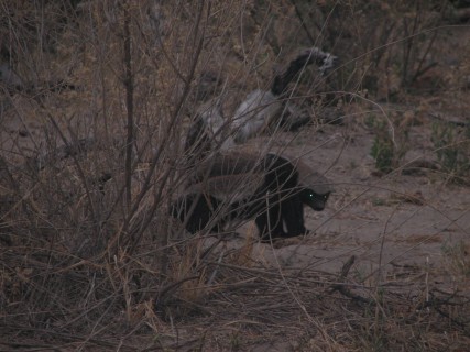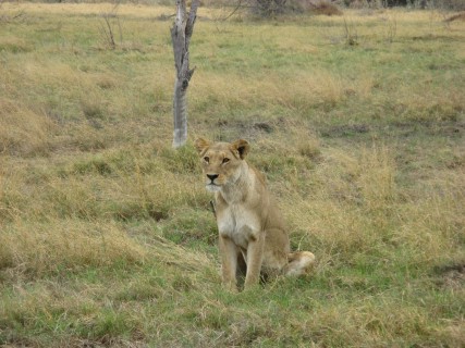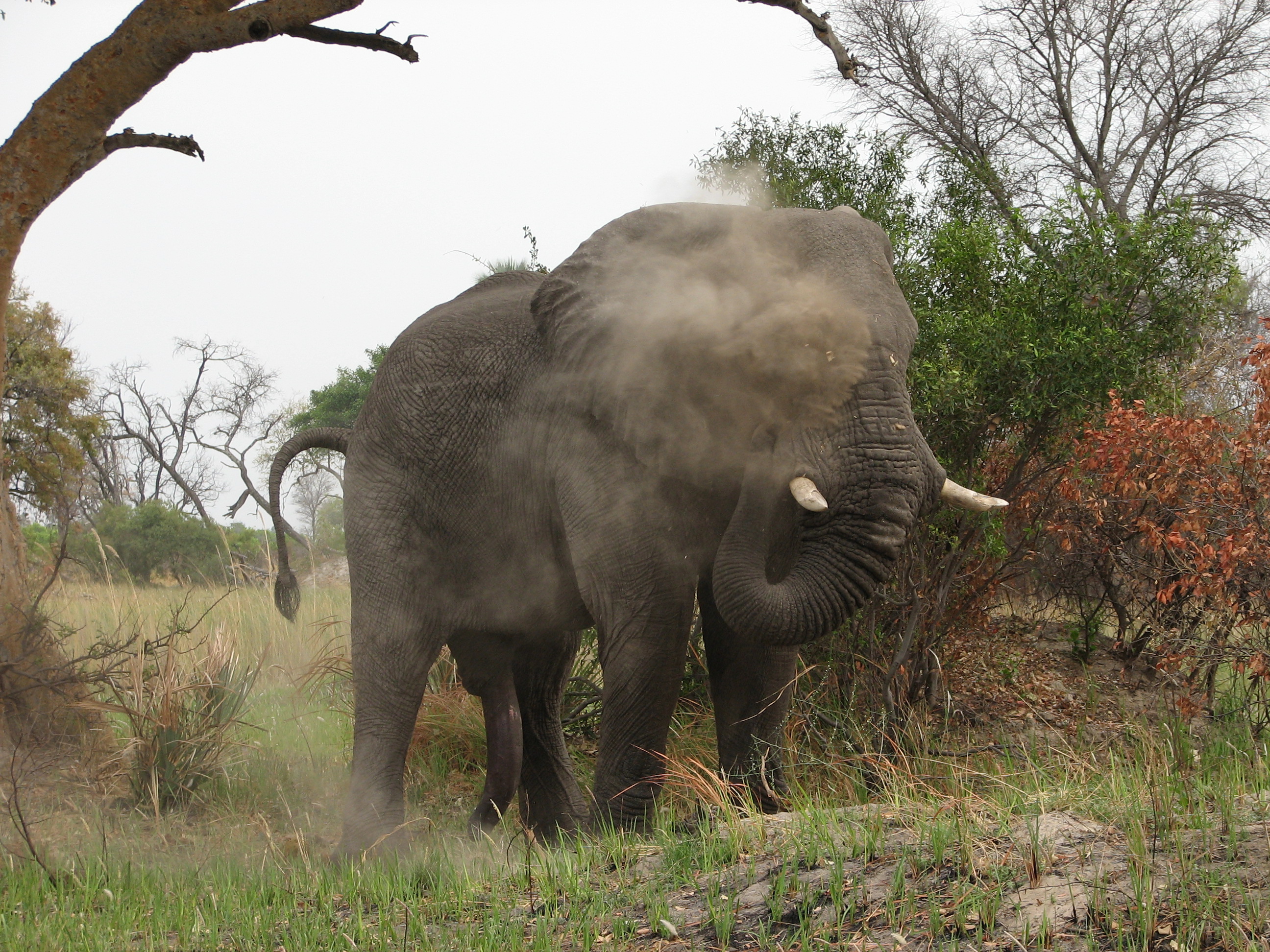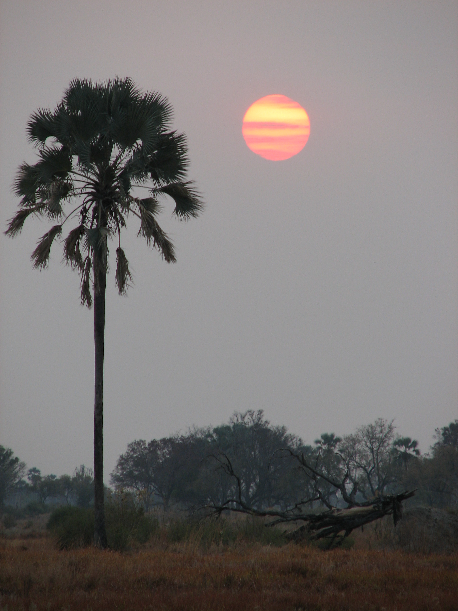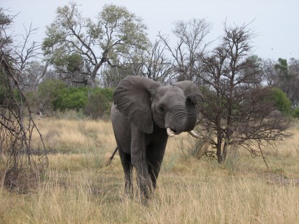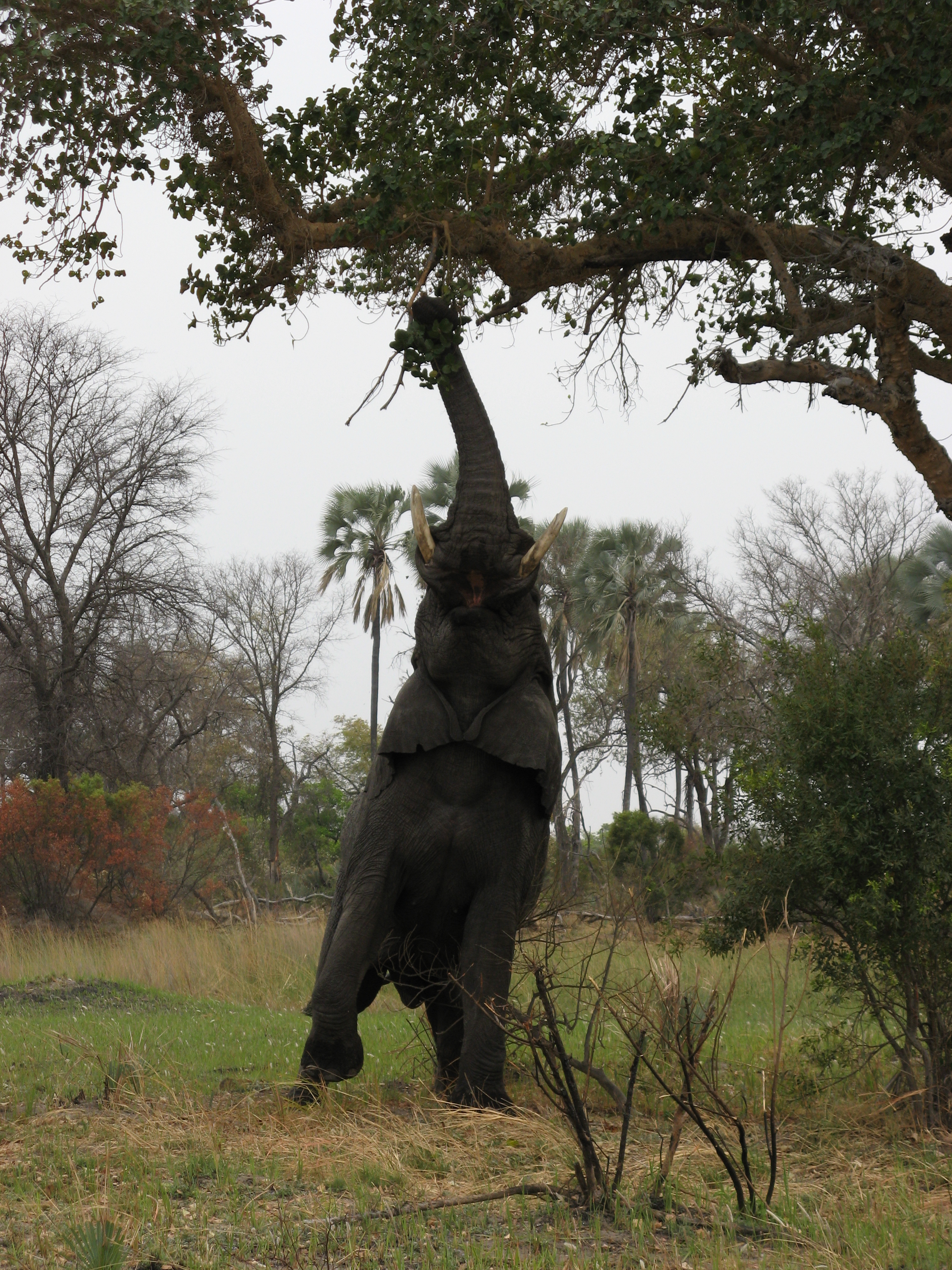 We were kept up at night by some impala grazing on the grass just outside and underneath our tent. On our morning drive, Newman told us we would be driving down to the southwestern part of the concession that had some permanent water, and had also recently had a fire from which new grass was resprouting. For the first time, there was some actual weather – it was cloudy and windy. We barely saw the sun after it initially rose. It was still warmer than mornings in Selinda however. Newman and Fanie saw some fresh hyena tracks, and followed them to what used to be a Wild Dog den from a couple years back – the hyenas were not there, however.