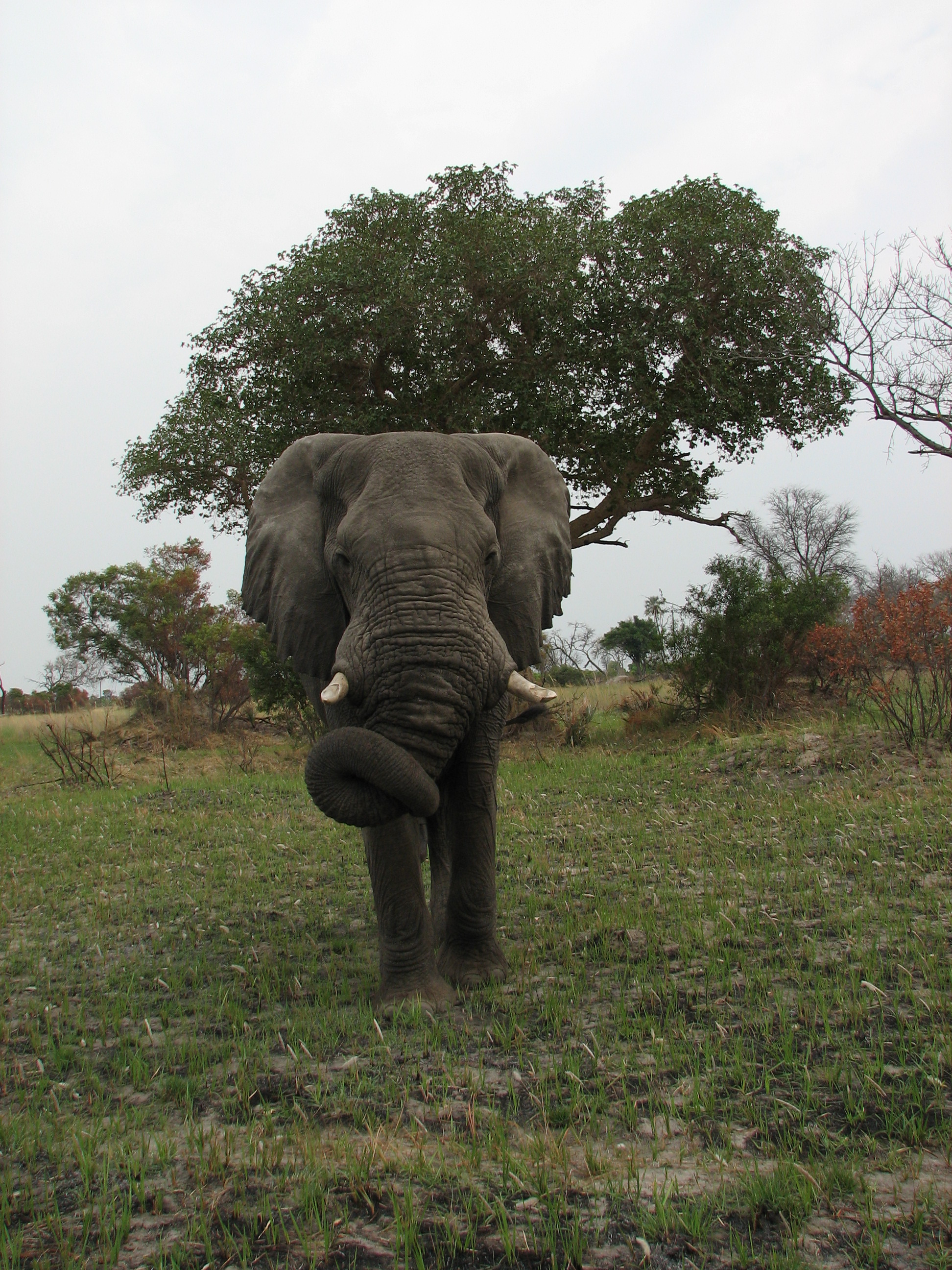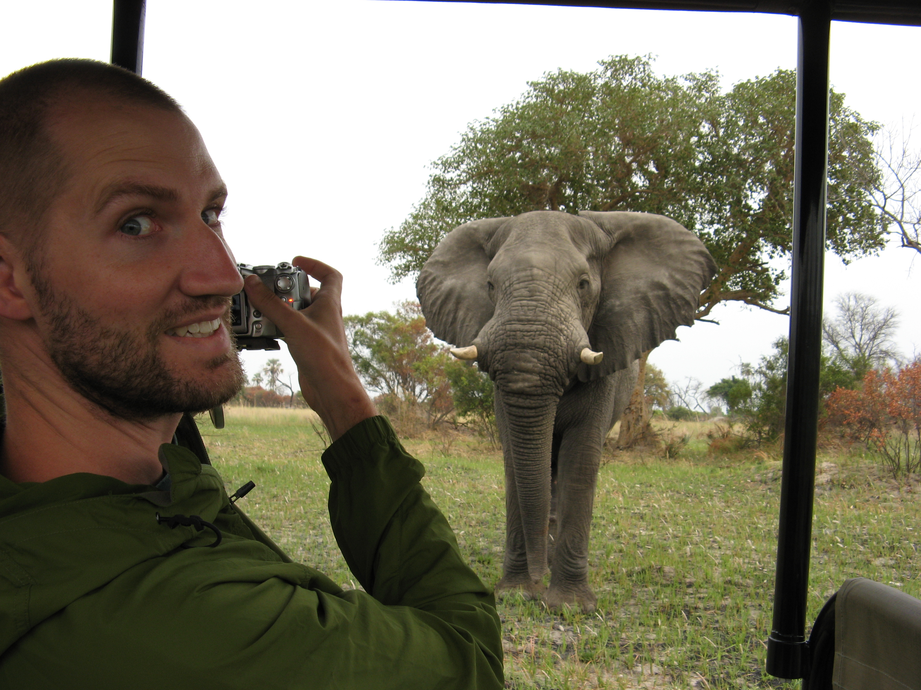 Our morning was completely saved from mediocrity, however, by an elephant we named Cinco. He was chewing on a Sycamore Fig that was at the very tip-top of his reach. He was basically standing on his tip toes reaching for the lowest branches in the hopes of pulling them down. Newman kept hoping he would get up on two feet, but it never happened – the closest he got was three feet. We watched him for roughly 20 minutes doing his thing, and then he decided he wanted to come watch us. He slowly walked over towards our truck, and kept coming. Newman did not turn on the engine, which indicated to us (perhaps wrongly) that there was no danger. He came to within 15 feet of Justin, and Crystal decided to capture the moment on film. Justin also got some good video of the occasion.