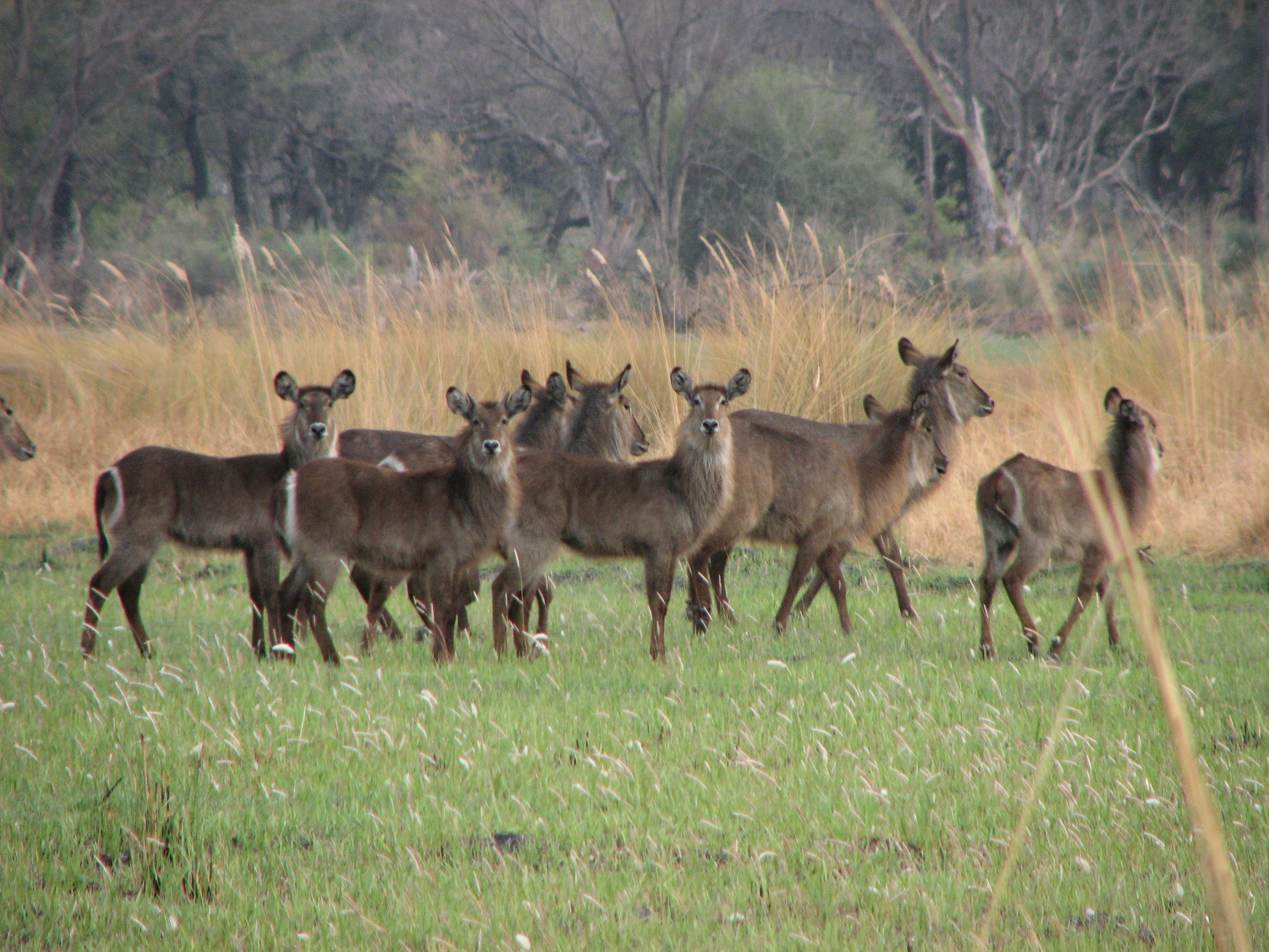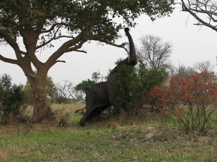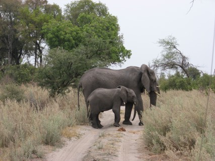 On the way, Newman gave us some more education. First he told us about the knobby combretum, a shrub Crystal likes. Then he told us about the numerous uses for the sausage trees, including making mokoros and also using the sap as a sunscreen. He told us about how Botswana's diamonds are almost all washed down from Angola with the yearly floods. Because of this, some crocodiles would swallow diamonds, thinking they were rocks, to aid with digestion. Some people thereafter hunted crocs in the hopes of getting diamonds, using impalas laced with sharp sticks as lures. Newman also taught us that many of the animals lack calcium in their diet, and therefore will eat hyena feces, which are full of calcium because of all the bones they eat. We learned the long-tail shrike is called the butcher bird because it kills its prey by picking it up and then ramming them into the spikes on acacias or other thorny plants – Justin thought this was pretty cool, Crystal not so much.