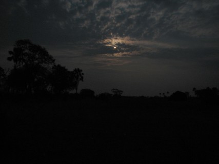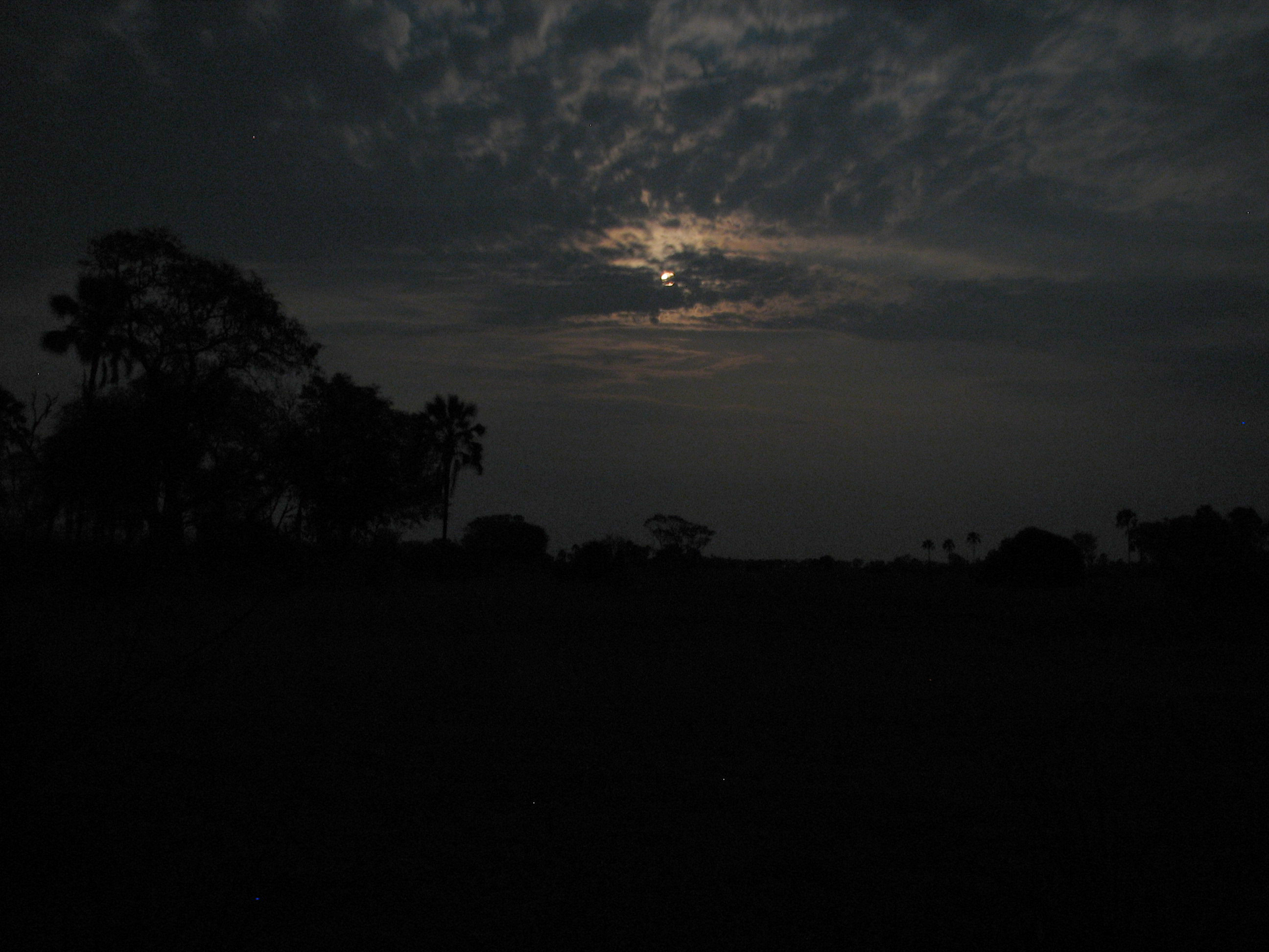 The hide, while very rustic, was still nice. They had nicely decorated the loo, and the bed still had a mosquito net. The clouds lifted occasionally for us to get a photo of the full moon, but photos do not capture the wind, which was crazy. There wasn't much to do, and we were tired, so even with the wind and rain, we fell asleep in record time.