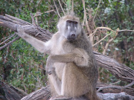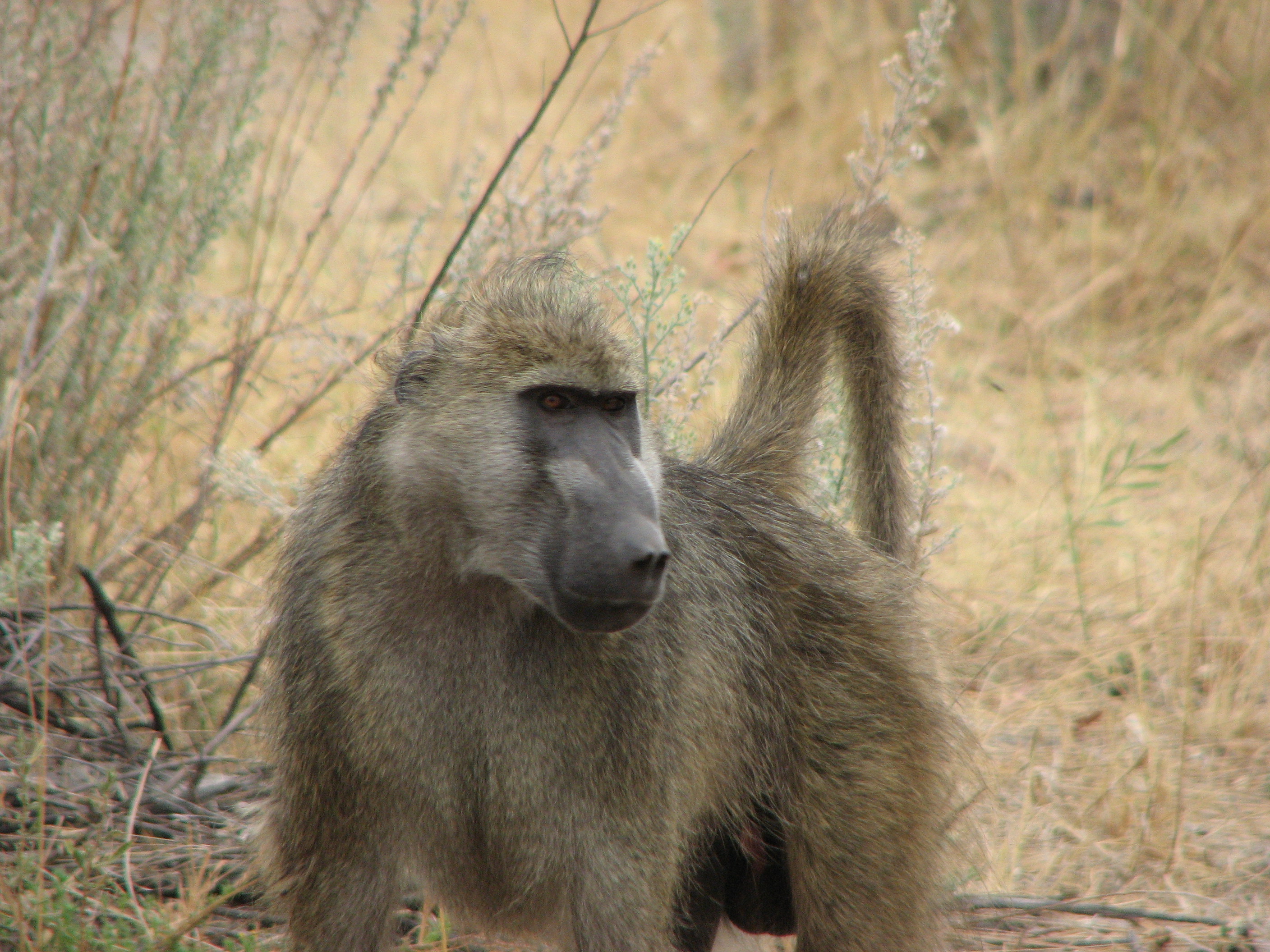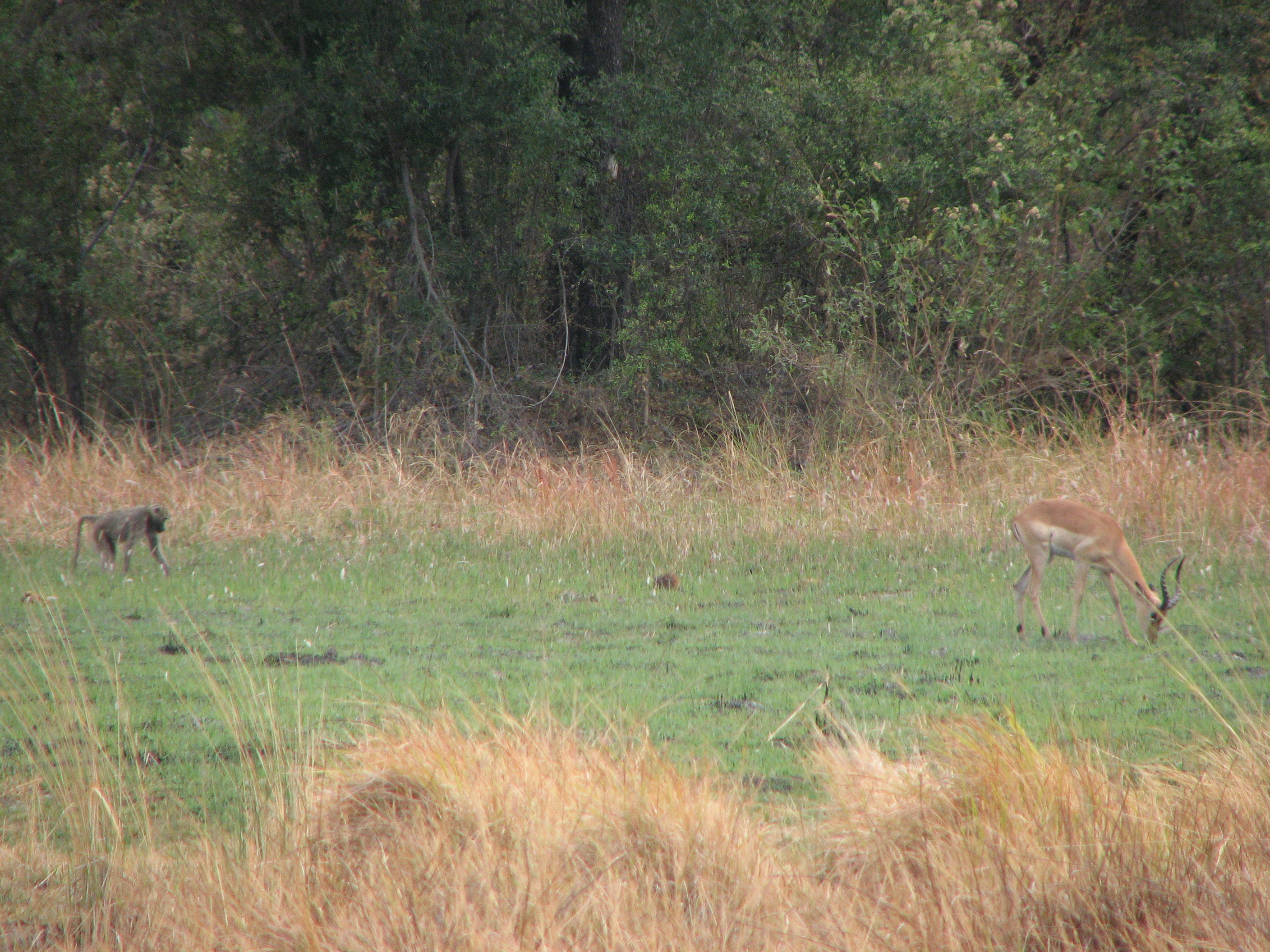 We came upon a large group of impala, and Newman taught us how they communicate with one another. They cannot make any noise other than a warning sound. They have individual body scents, however, so they can recognize one another from scent. This scent gland is on their legs, and passes onto the grass when they run, so they can tell where each other has run, for example after fleeing a predator. Only impala themselves can smell this special impala scent. After the impala we saw some baboons, one of which was a large male stalking around.