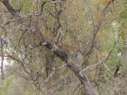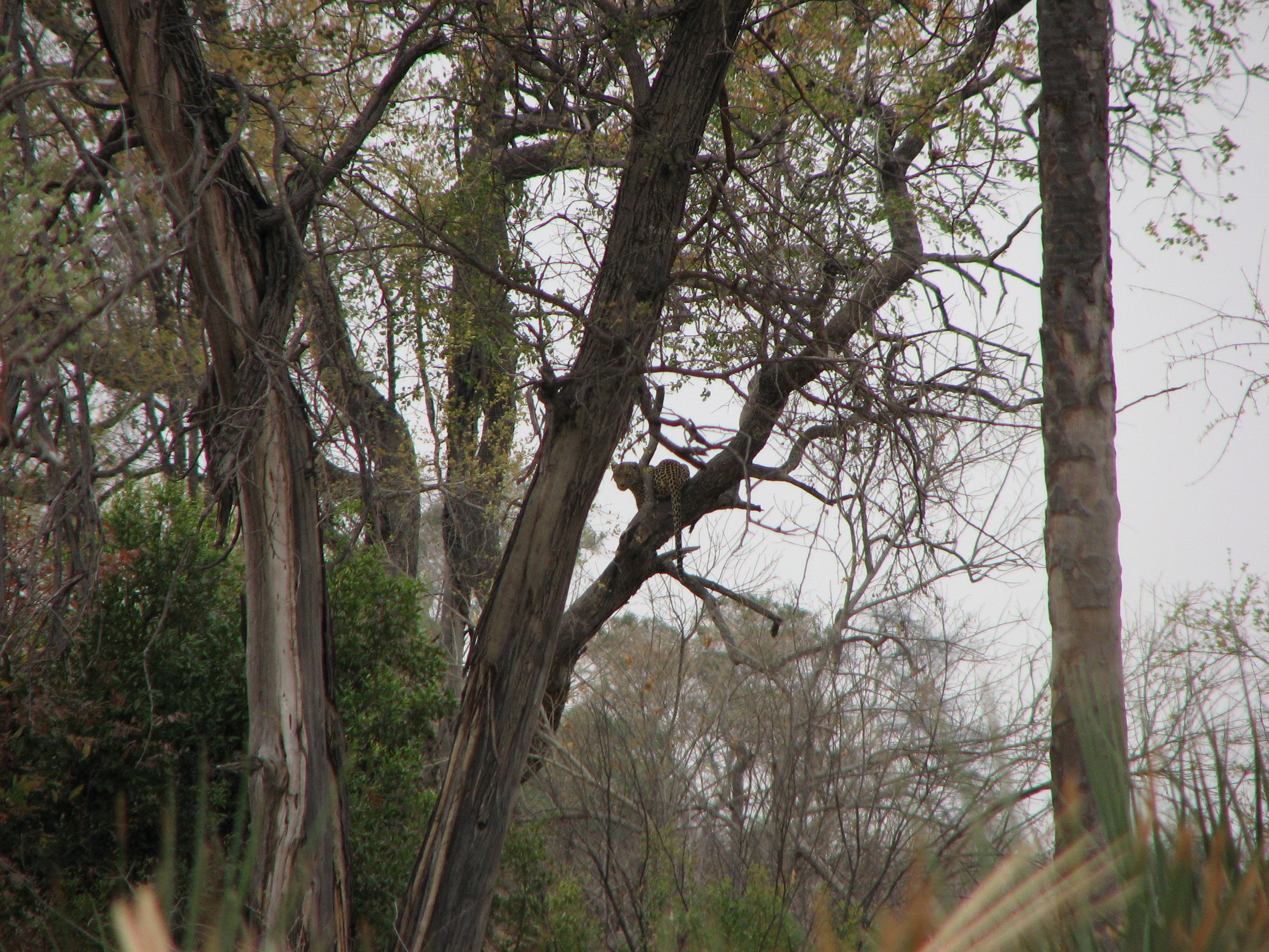 Then, shortly before reaching camp, Newman saw a leopard. It was off to our right, about 500-600 feet away, in a tree, facing away from us. It took Newman about 5 minutes to show us where it was, and then we had to use binoculars to see it. Justin just aimed the camera at it and hoped for the best – zoomed in on a picture taken with an 18x zoom you could finally make it out. We decided to drive around to the other side to see if we could get any closer. We weren't able to get much closer, but at least it was facing us this time. It was still almost completely camouflaged, however. Justin rested his camera on a beanbag on the edge of the truck, which helped steady the camera a bit. Again, it was pretty much shoot and hope for the best. The picture turned out okay, but not quite as good as the leopard we saw in Selinda.
