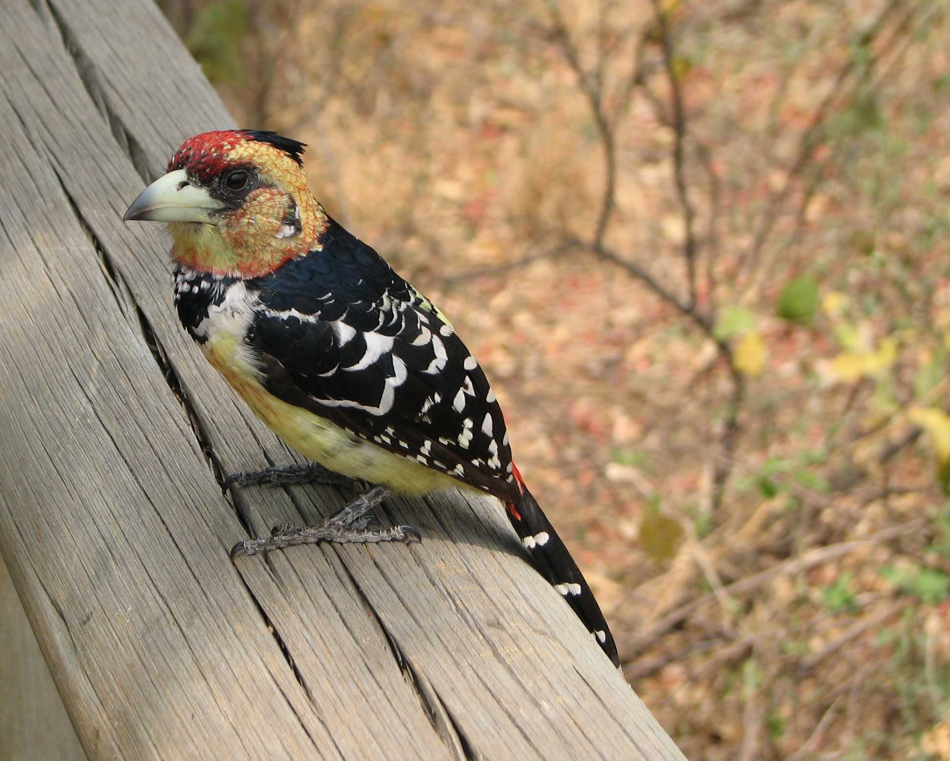 We tried getting closer to the leopard, but almost immediately it hopped down and hid. We drove back to the camp, which was actually quite close at this point. So in 4 drives with Newman, we had seen dogs twice and leopards twice – we kept wondering how long he could keep this up. At lunch we spoke with an Australian couple, Steve and Ann, who also had a close encounter with an elephant. In their case, a male had mock charged their car, and Ann had freaked out, and Steve had been polite enough to catch both the elephant and Ann on video. We had another afternoon siesta, and Justin caught up on the diary while Crystal read Guns, Germs, and Steel. We heard some more louries, and Crystal noted that the louries sound very much like Nancy Kerrigan after getting whacked with a pole at the Olympic qualifying – "why, why?" We also saw a Crested Barbet.