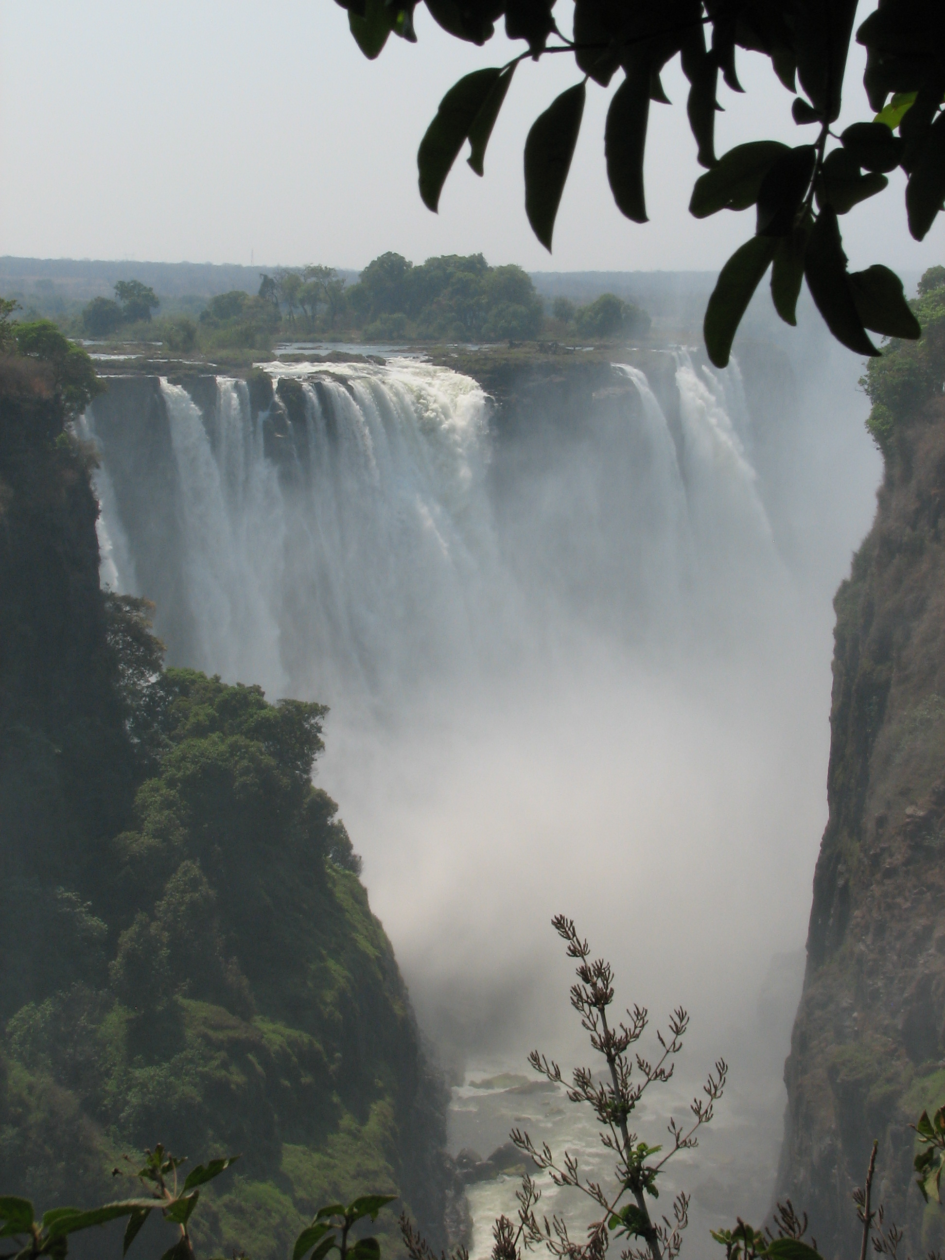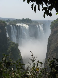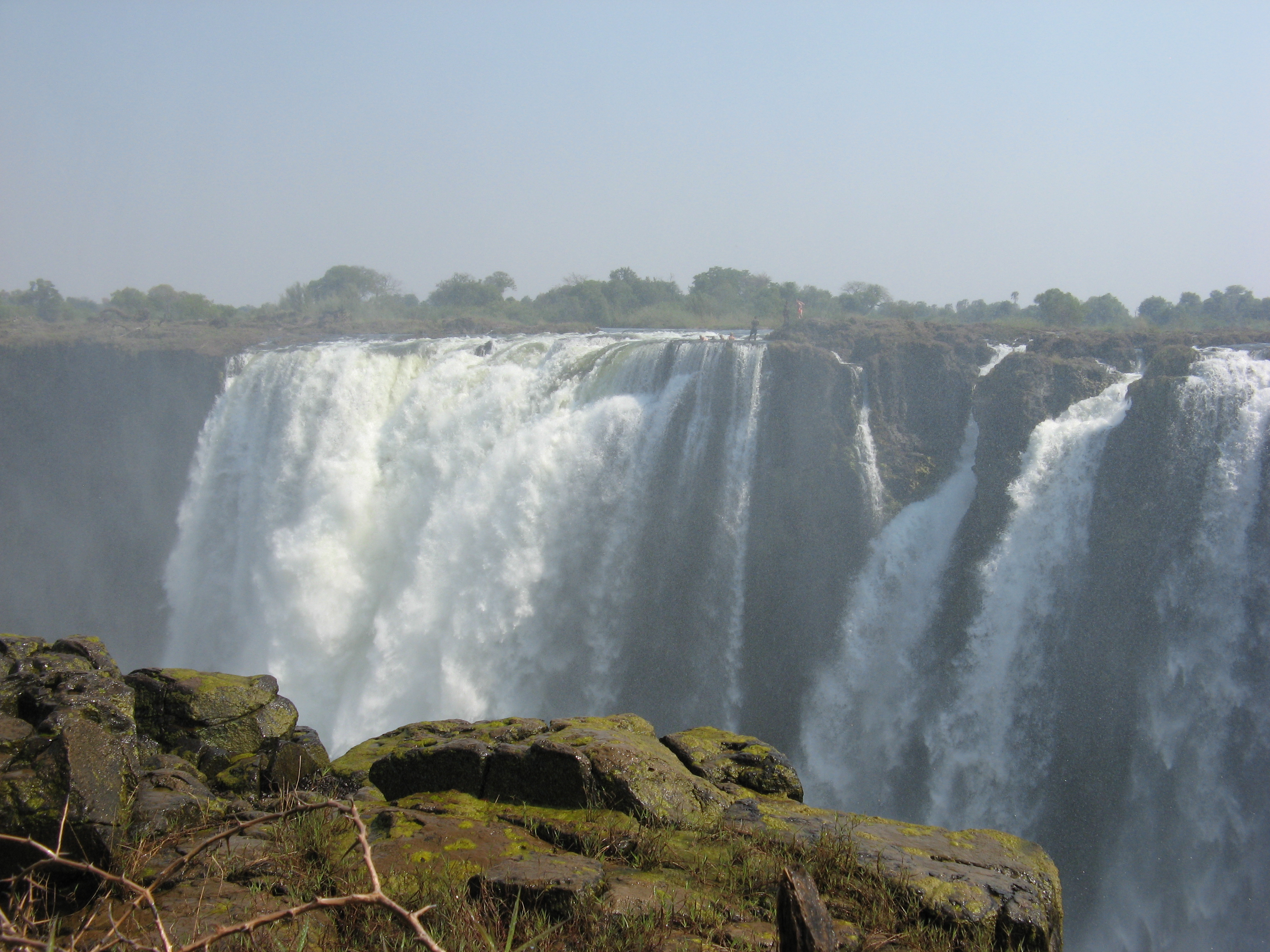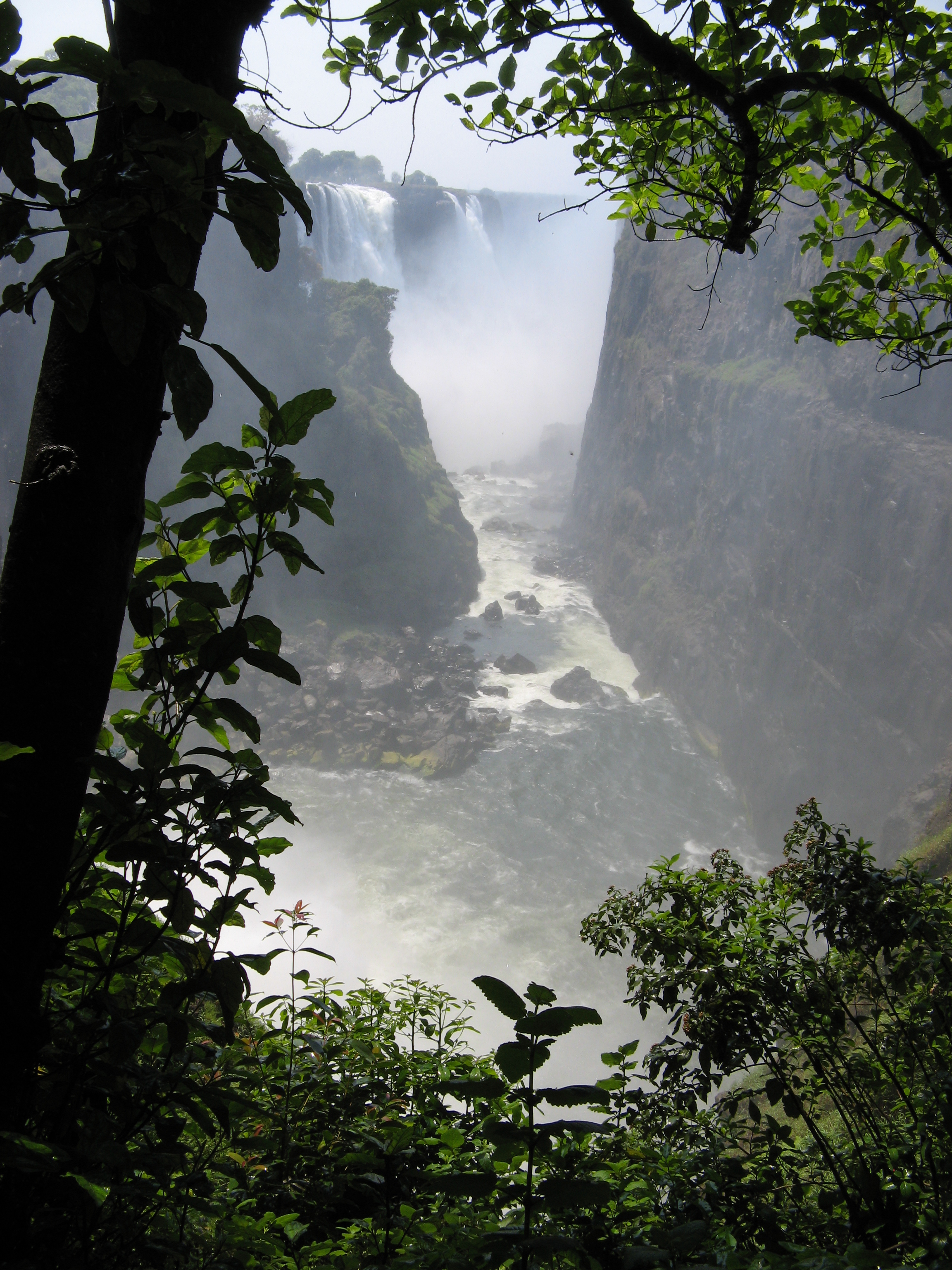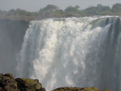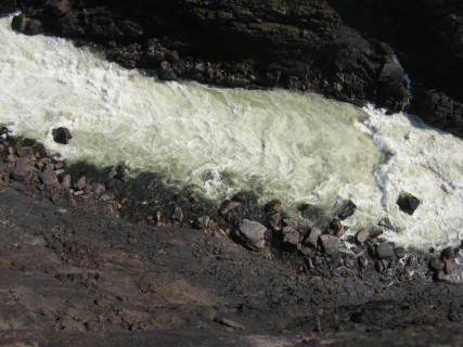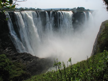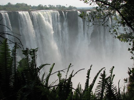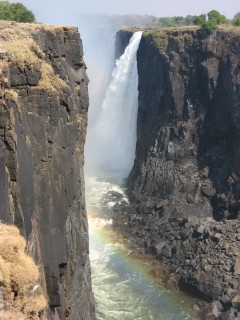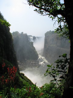 We were taken over to the Zambia-Zimbabwe border, where we went through immigration. The border itself was very simple – a rusty bent double gate. We passed over the bridge where crazy people bungee jump – none for us. When we got to Zimbabwe, we went from one bus into another, and wished Joshua farewell and got introduced to Hondo, who showed us the Zimbabwean side of the falls. We initially walked well east, near to where we finished up yesterday. Then we walked back westwards, against the flow of traffic. The falls were much more impressive from the Zimbabwe side, which created a constant mist. We had to time our pictures for when there were lulls in the wind. Hondo told us that the wind usually blows from the East or Northeast in this area, so the Zimbabwe side gets the majority of the mist. It was so misty in one place near the main falls that there was what has to be the world's smallest rainforest – probably no more than 250 feet by 150 feet. Once we got to the far end, past Devil's Cataract, there were steps down to a good vantage point where you could look down the chasm. Some of the better shots from the morning included: