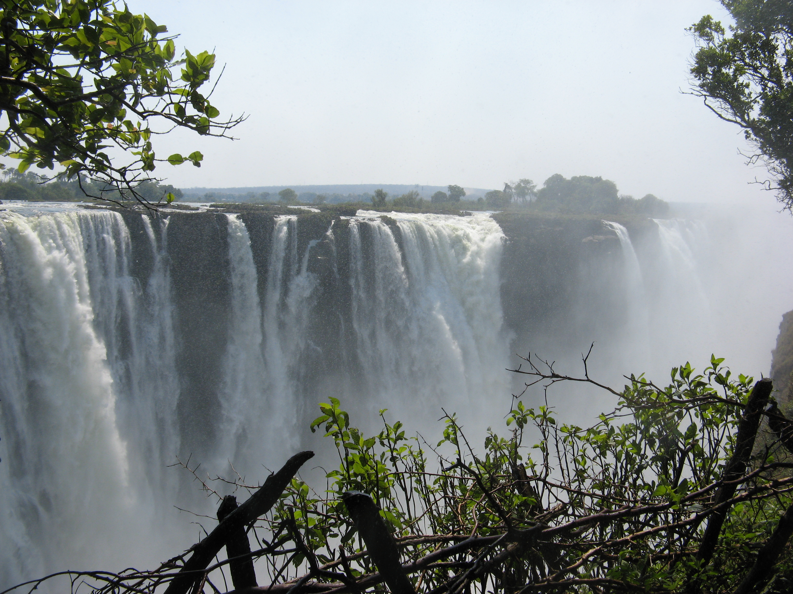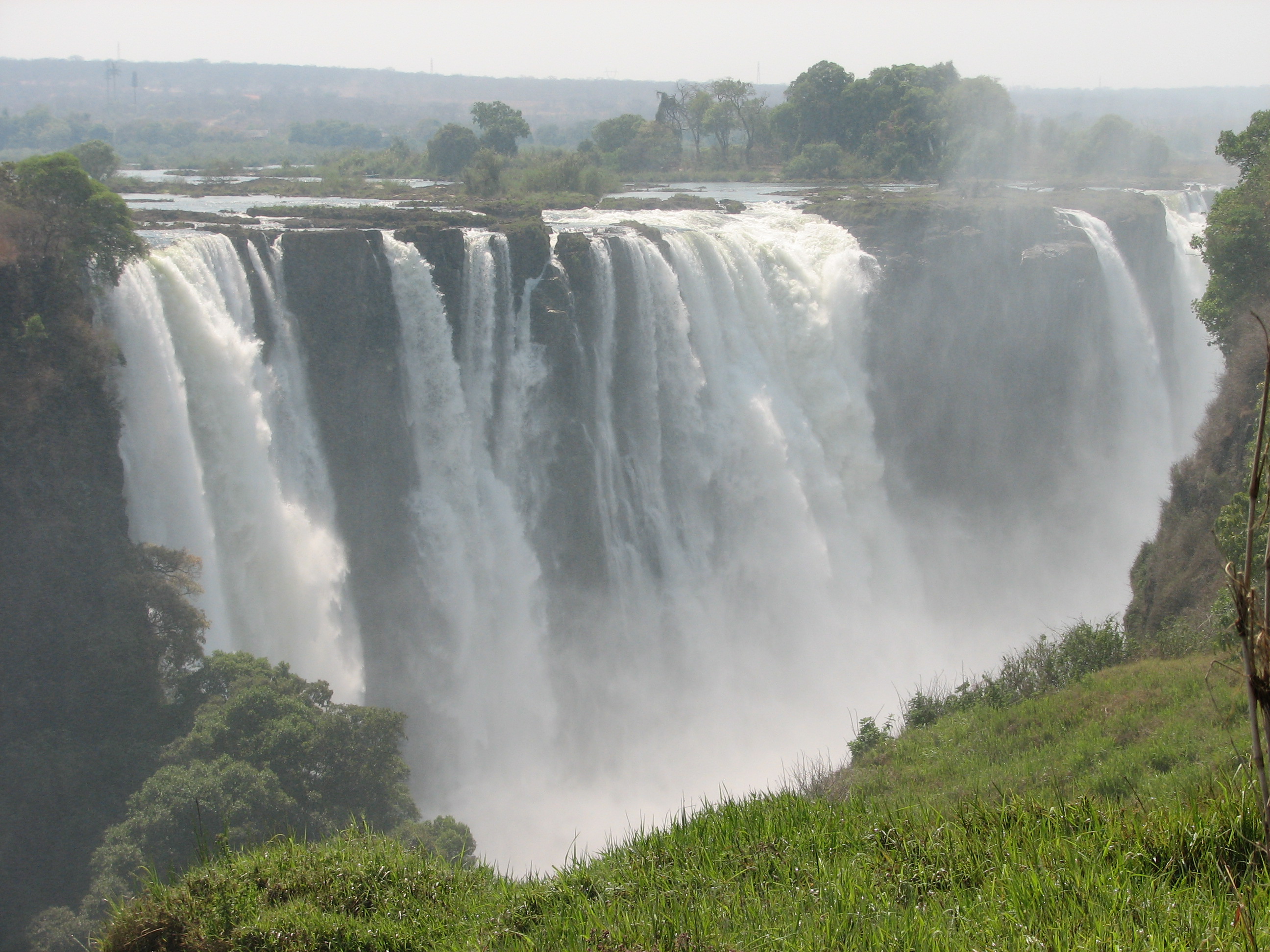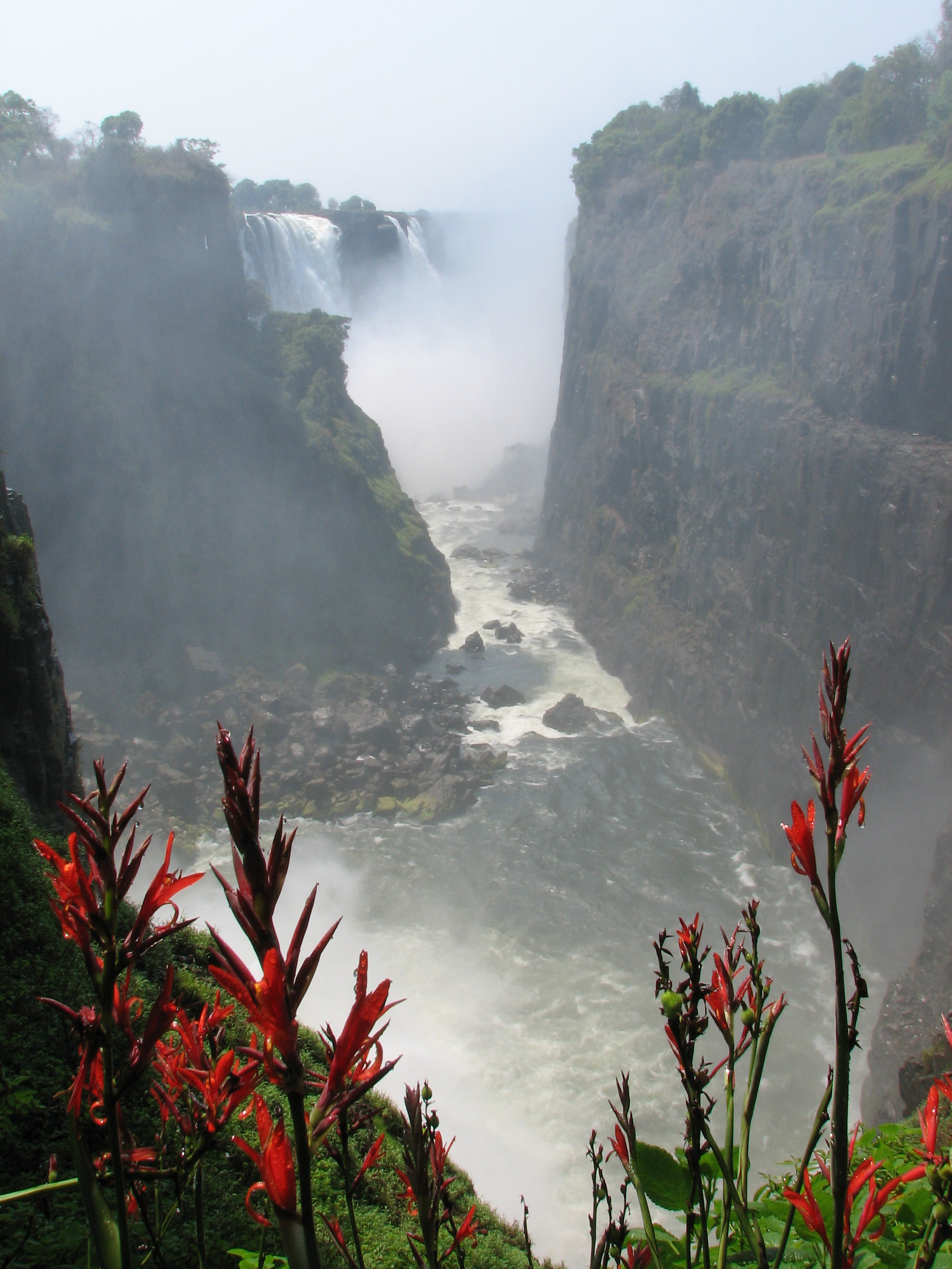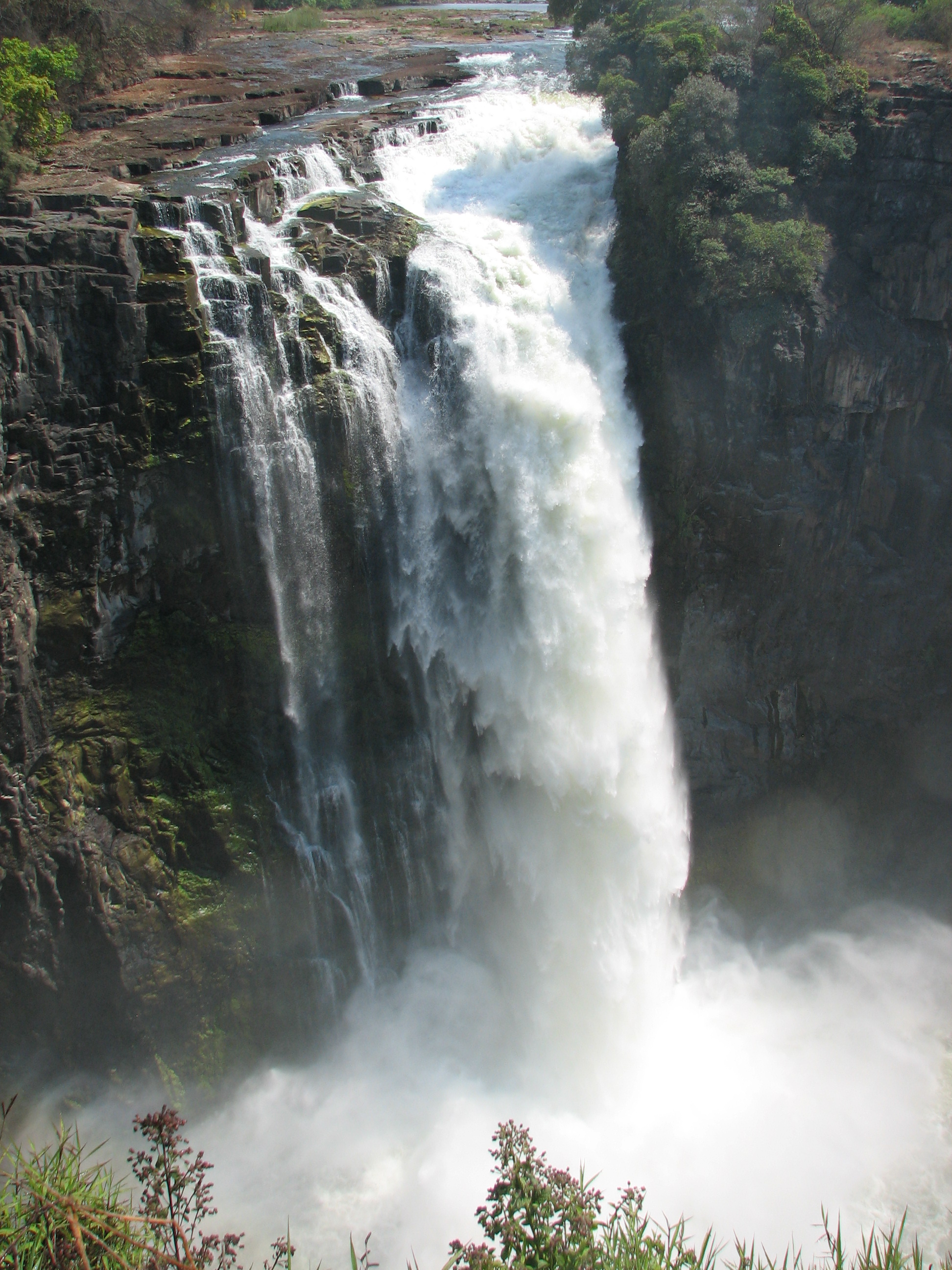We were taken over to the Zambia-Zimbabwe border, where we went through immigration. The border itself was very simple – a rusty bent double gate. We passed over the bridge where crazy people bungee jump – none for us. When we got to Zimbabwe, we went from one bus into another, and wished Joshua farewell and got introduced to Hondo, who showed us the Zimbabwean side of the falls. We initially walked well east, near to where we finished up yesterday. Then we walked back westwards, against the flow of traffic. The falls were much more impressive from the Zimbabwe side, which created a constant mist. We had to time our pictures for when there were lulls in the wind. Hondo told us that the wind usually blows from the East or Northeast in this area, so the Zimbabwe side gets the majority of the mist. It was so misty in one place near the main falls that there was what has to be the world's smallest rainforest – probably no more than 250 feet by 150 feet. Once we got to the far end, past Devil's Cataract, there were steps down to a good vantage point where you could look down the chasm. Some of the better shots from the morning included: