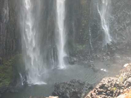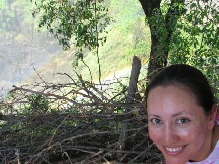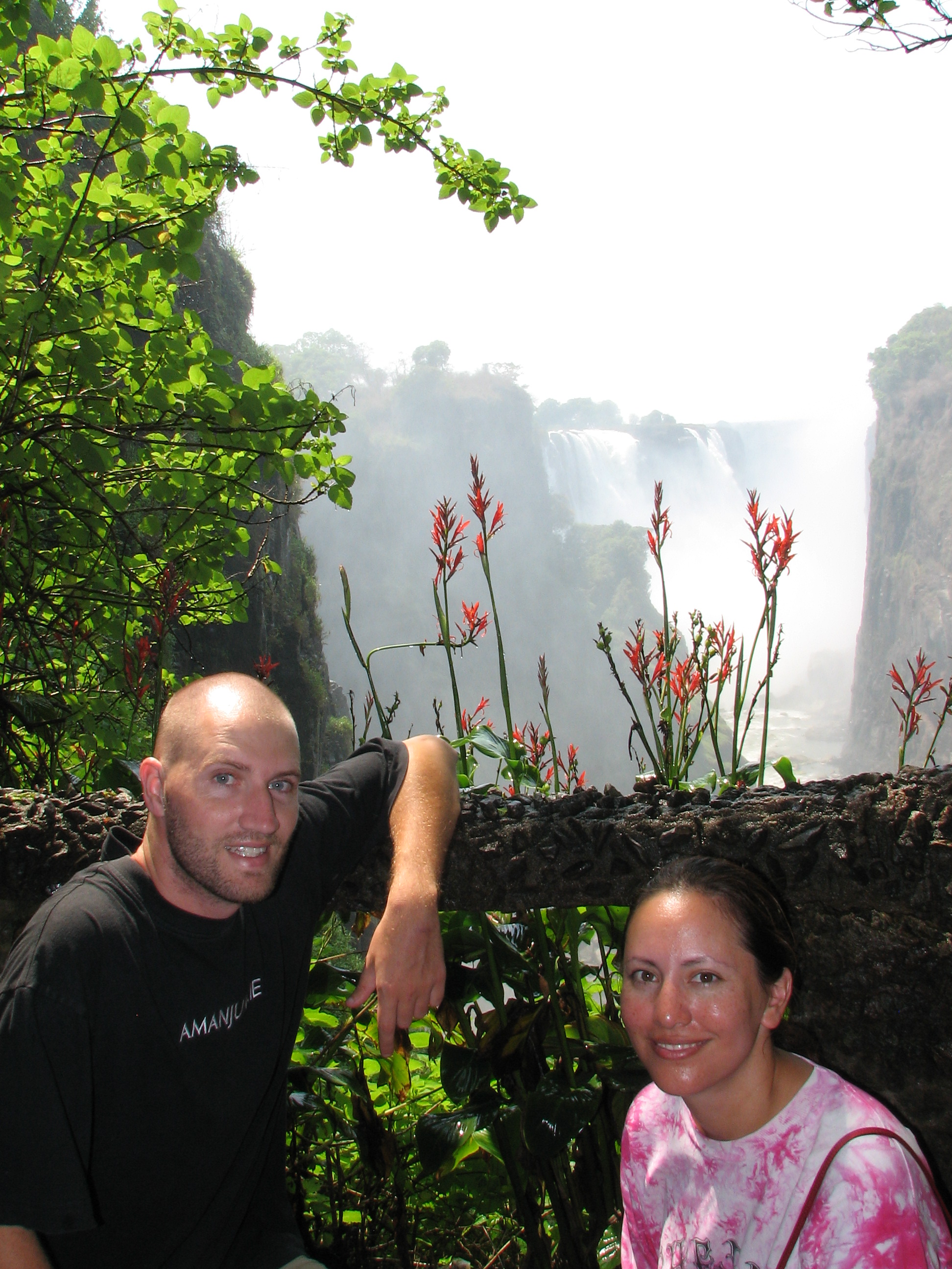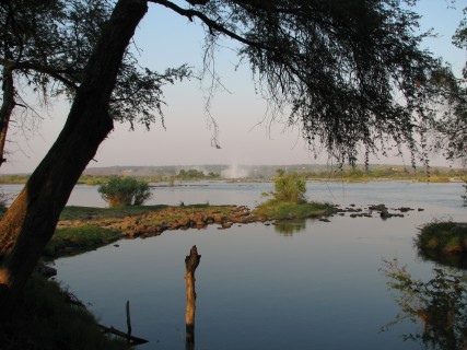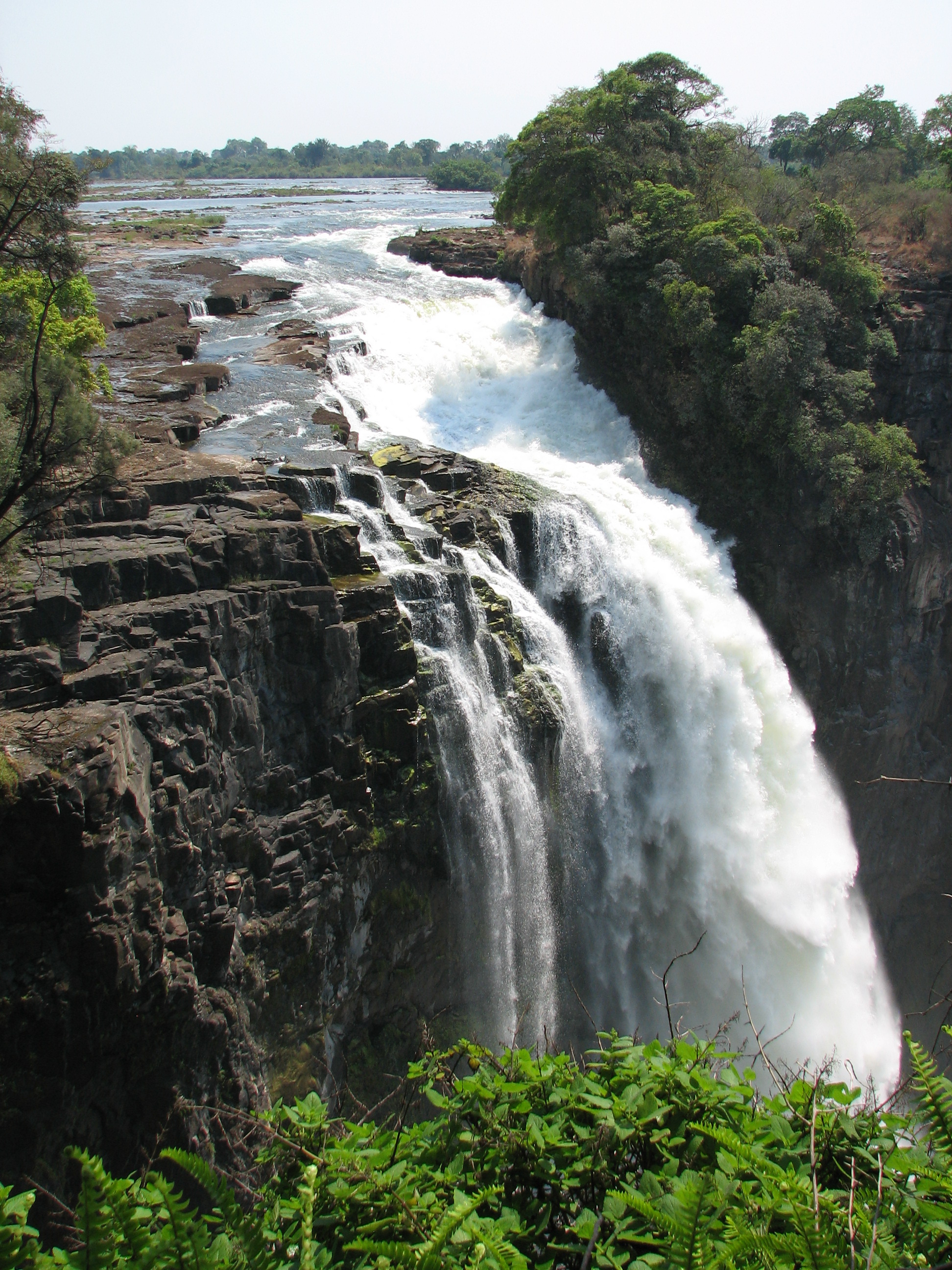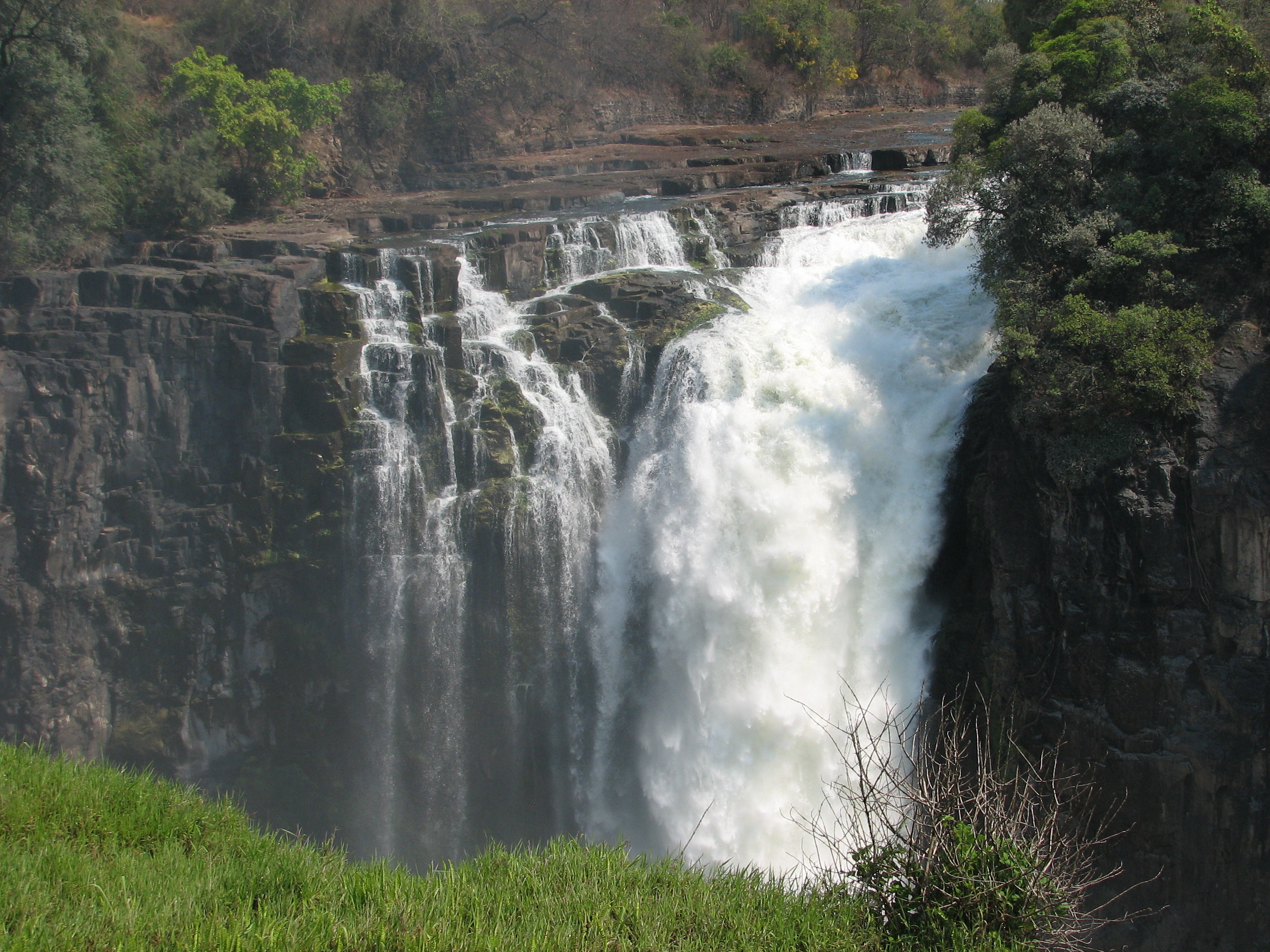 We were taken over to the Zambia-Zimbabwe border, where we went through immigration. The border itself was very simple – a rusty bent double gate. We passed over the bridge where crazy people bungee jump – none for us. When we got to Zimbabwe, we went from one bus into another, and wished Joshua farewell and got introduced to Hondo, who showed us the Zimbabwean side of the falls. We initially walked well east, near to where we finished up yesterday. Then we walked back westwards, against the flow of traffic. The falls were much more impressive from the Zimbabwe side, which created a constant mist. We had to time our pictures for when there were lulls in the wind. Hondo told us that the wind usually blows from the East or Northeast in this area, so the Zimbabwe side gets the majority of the mist. It was so misty in one place near the main falls that there was what has to be the world's smallest rainforest – probably no more than 250 feet by 150 feet. Once we got to the far end, past Devil's Cataract, there were steps down to a good vantage point where you could look down the chasm. Some of the better shots from the morning included: