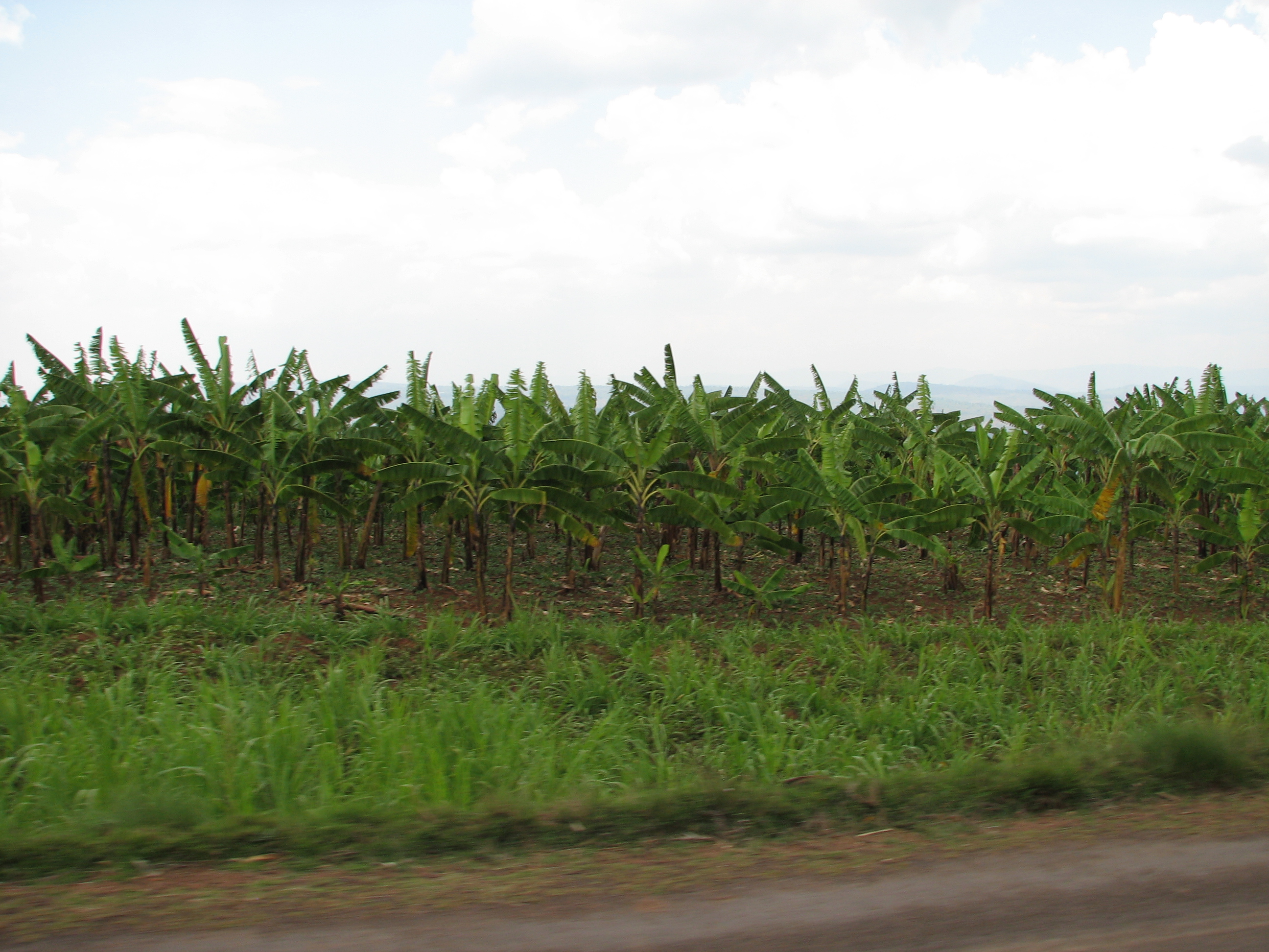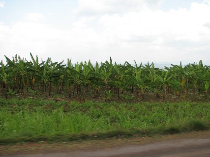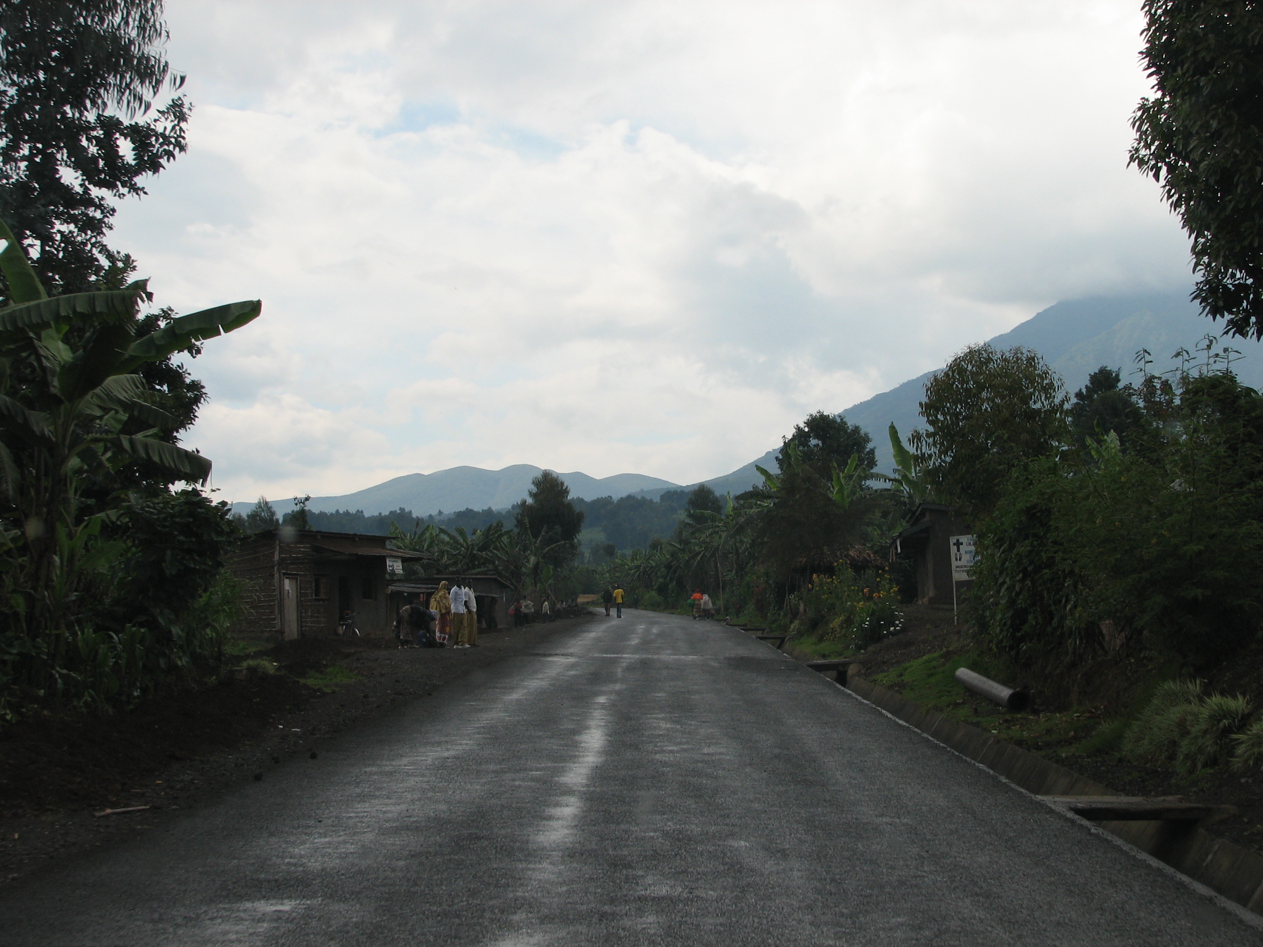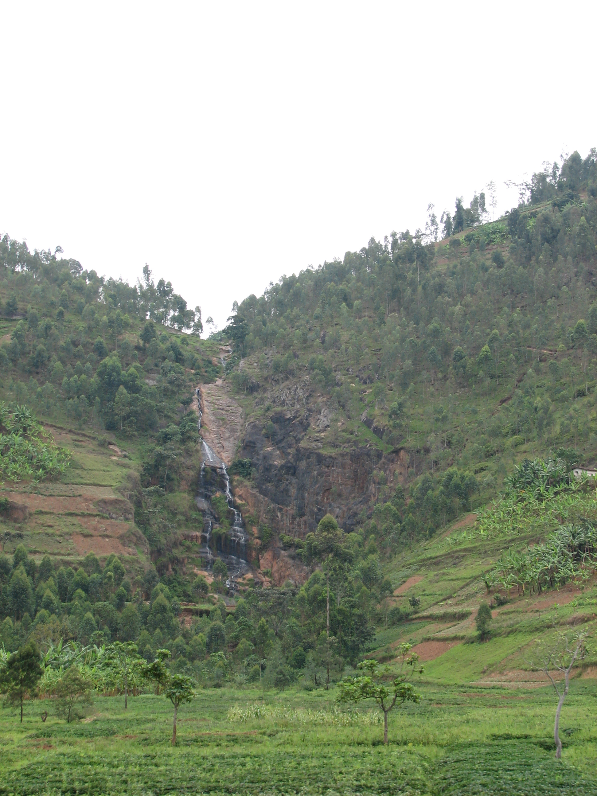 We soon started going up into the mountains, heading northwest towards the Virunga volcanoes, where the Mountain Gorillas live. The vegetation was amazing, with terraced farms and gardens cut into the hillside, full of bananas and sweet potatoes. There were even some nice waterfalls here and there. While it never gets that hot in the mountainous regions of Rwanda, it never gets that cold either, and the climate supported many plants that either do not survive or greatly suffer through San Diego 's winter – the climate must be like our coastal fall, but all year round.