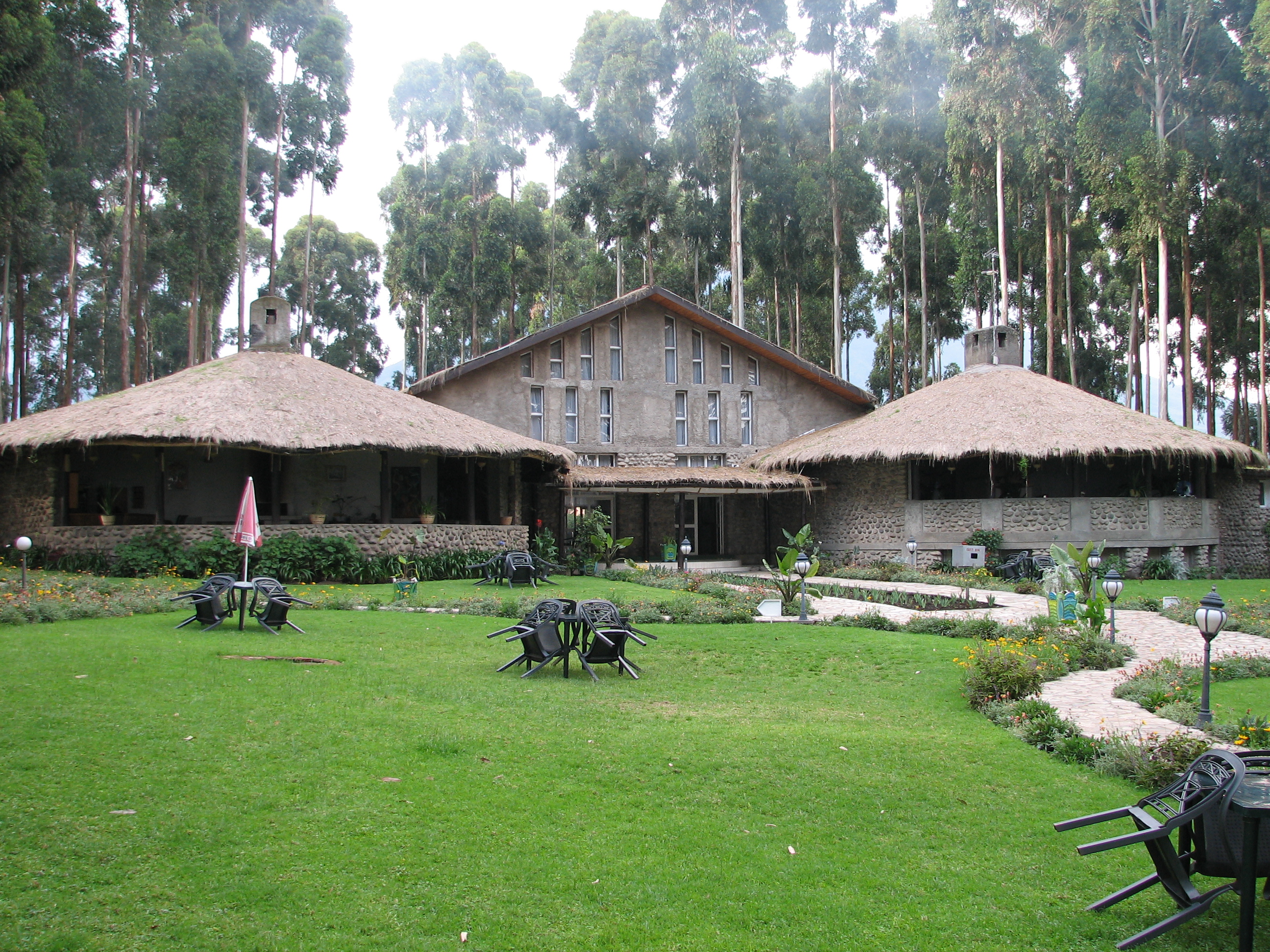 It took over two hours for us to get to Ruhengeri – everyone but Justin's mom took naps, despite the gorgeous scenery, due to fatigue from our long travel day – Rwanda was our fifth country in just over 24 hours, and sixth country in just over 72. We ate lunch at a nice place in Ruhengeri, which had some nice crowned cranes on the grounds. After lunch we made the last 20 minutes of our jaunt up to the Mountain Gorilla's Nest, just outside of Ruhengeri. The Gorilla's Nest is the closest hotel to where you have to meet for the National Park, meaning we would get to "sleep in" compared to others.