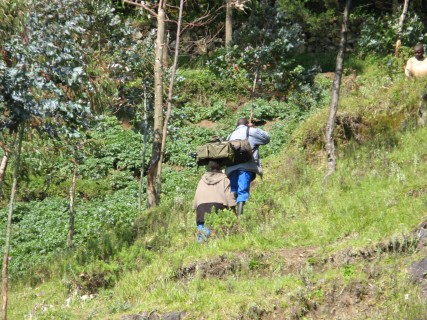 Our guides, Everest and Eddie, told us that Umubano was a group of 9 gorillas, and had relatively split off from the Amahoro group, which we had heard of before. It was us, Rick and Beverly, plus Dean and Renee from Arkansas, who looked to be in their fifties. The guides told us a bit about the group, as well as the logistics of our trip, most of which we had read about beforehand. This included one hour per encounter, taking gloves for nettles, using porters, etc. We drove off to the starting point for the trail, on a road we were told was recently paved. Unfortunately, a decent distance before we got to the trail head, the new road ended, and we were on very uneven rocky terrain for at least 30 minutes. The road is driven basically only by gorilla trackers, so all of the neighborhood children came out to wave, cheer, beg, or all of the above.