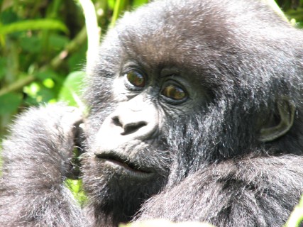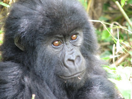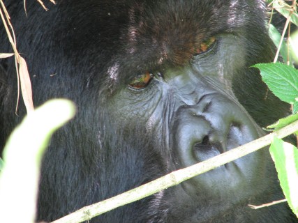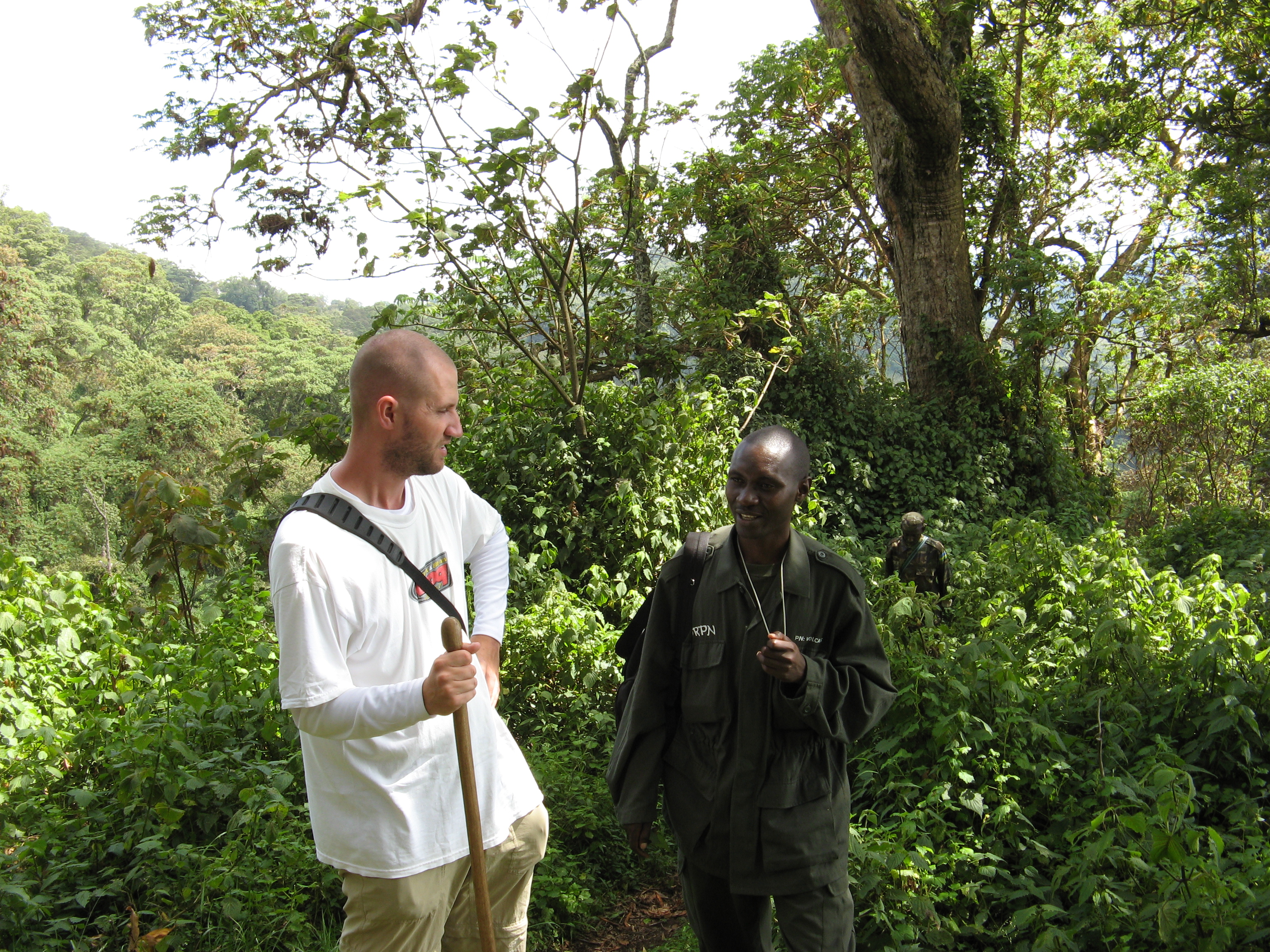 A little further up the hill, we saw a duiker, a dark red/brown antelope that is native to the area. It is the duiker that many of the poachers in the area are hunting for that inadvertently traps the Gorillas – Justin had read about this the day before while reading Gorillas in the Mist. Poaching in the area has now been largely eliminated, as there has been a ton of PR in the last couple years about how the Gorilla Treking brings in a lot of money for the area, which provides jobs for local people as guides, porters, trackers, etc. Also, as we found out, 5% of the revenue generated is funneled back into the local economy in terms of better roads, better water facilities, etc.