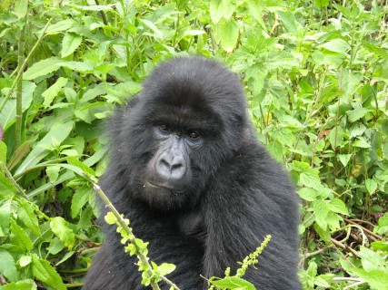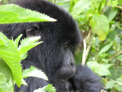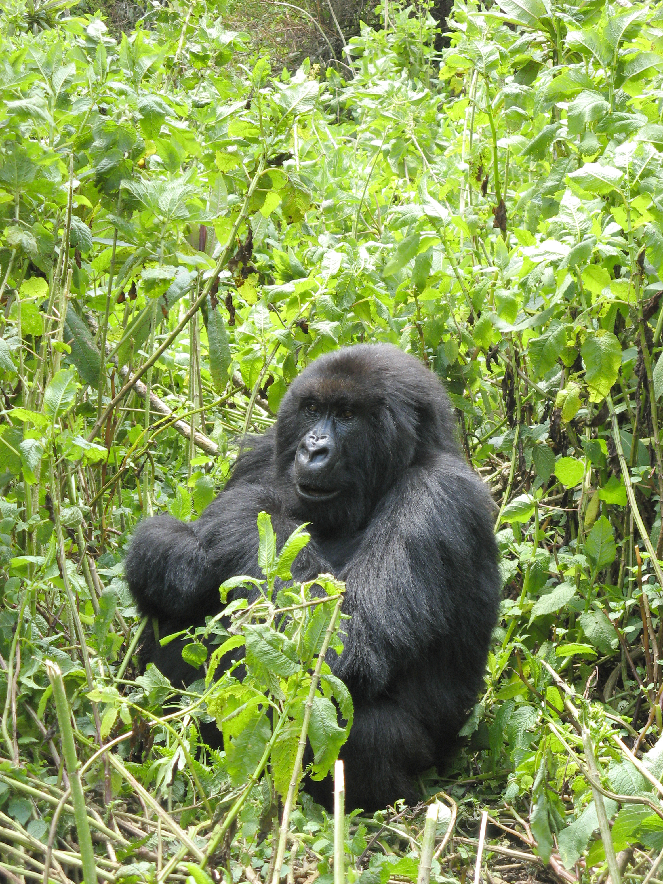 When we were a good deal of the way up Mount Visoke, near 10,000 feet, we encountered the trackers. The trackers find the gorillas early in the morning, then radio back to the park headquarters and inform the guides where to go. We had been on an established trail for some time, but once we got to the trackers we went off roading. We could tell we were close when we started to see fresh dung. Then all of a sudden there were a bunch of gorillas about 100 feet in front of us. We slowly approached, going around the right of where they were.