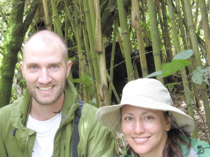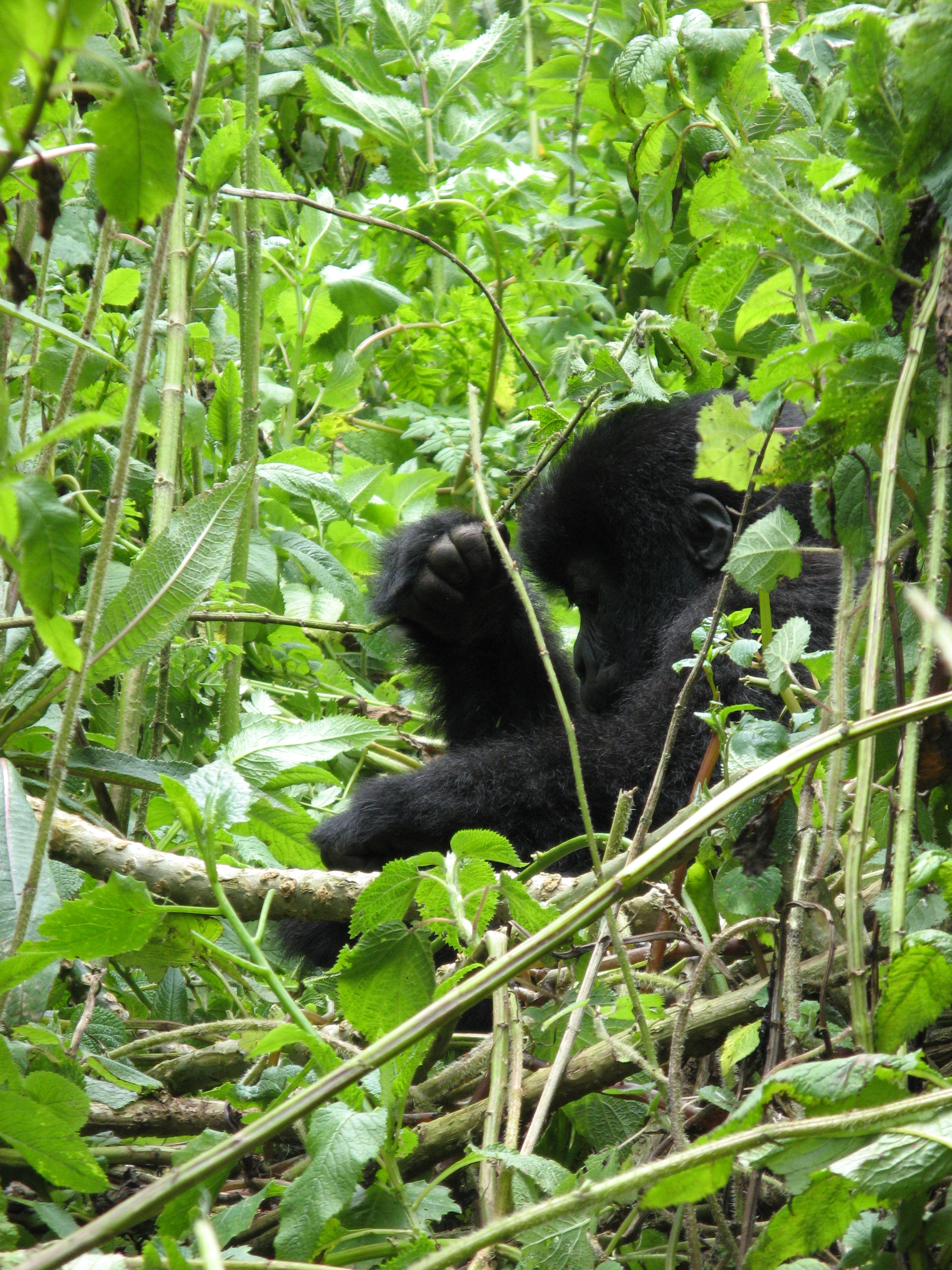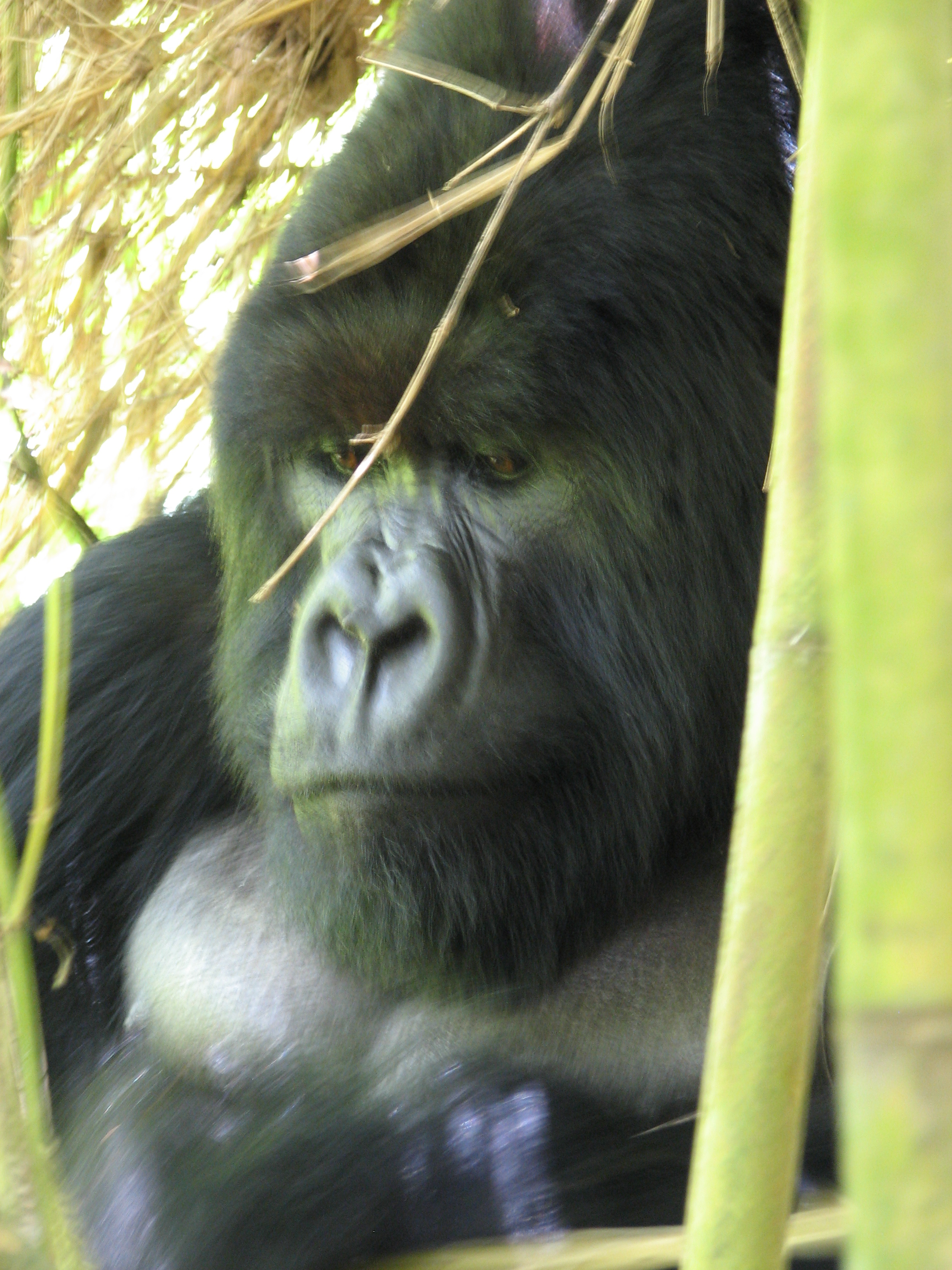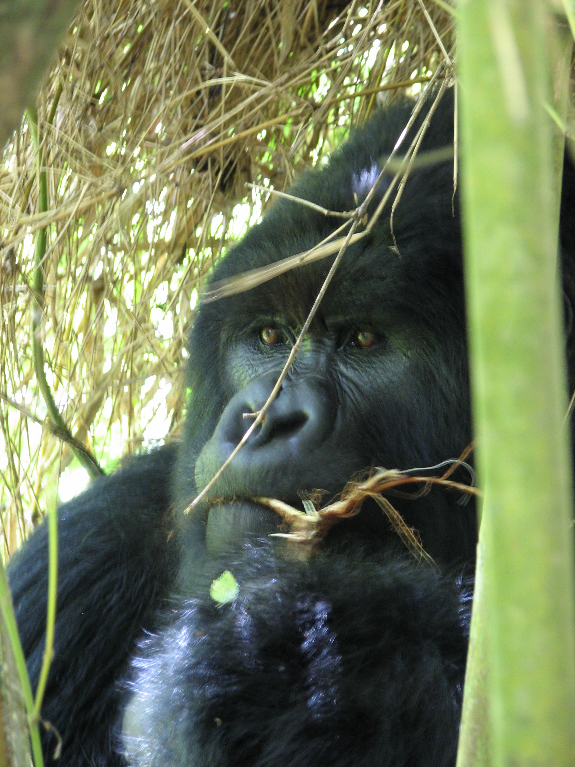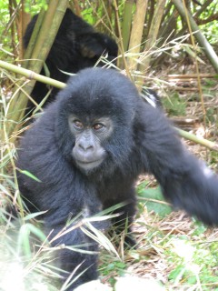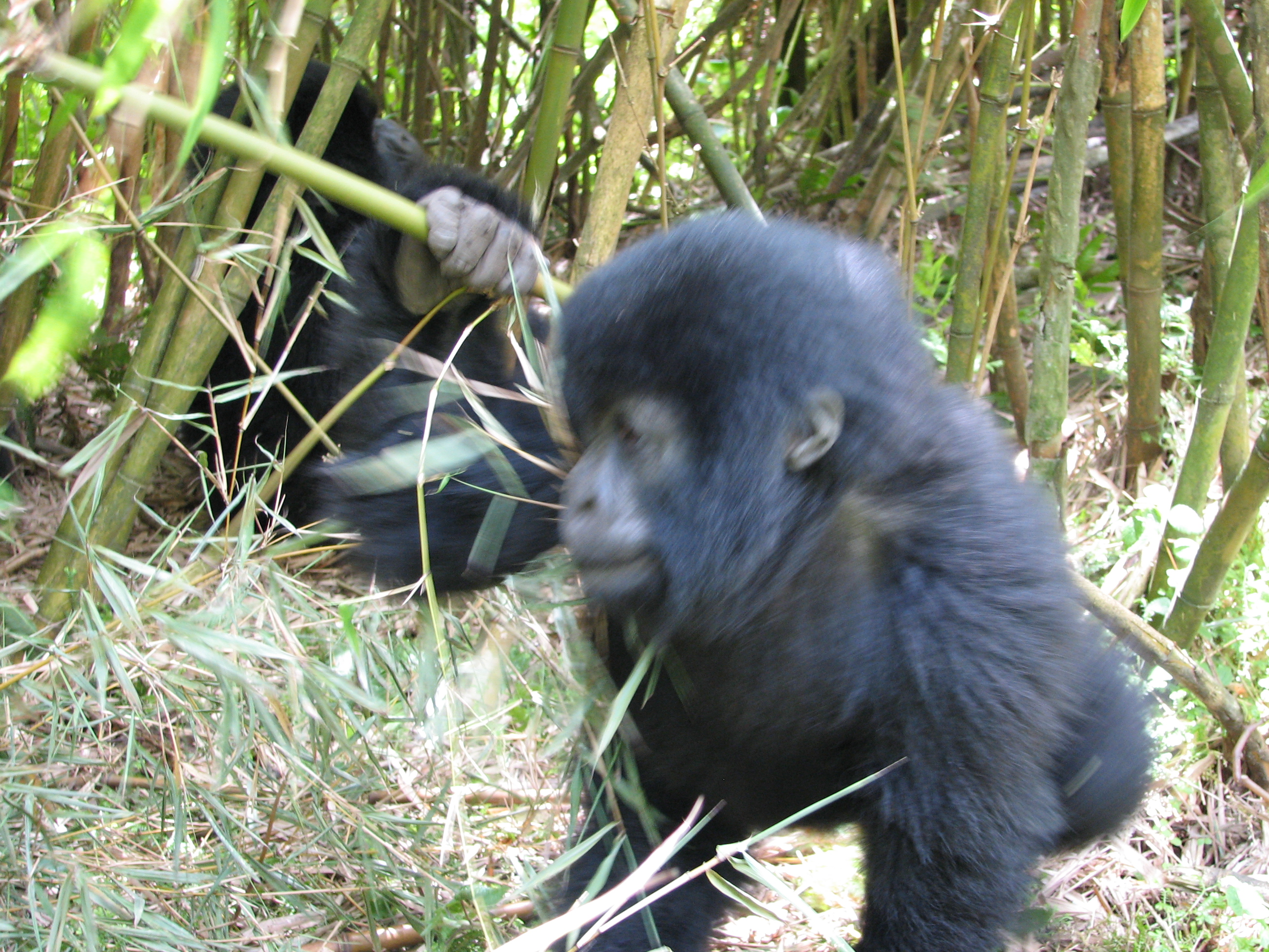 There is a 7 meter rule for how close you can get, but our guides kept telling us to come closer, pointing to where to stand. They were also cutting down any foliage that happened to be between us and a good photo opportunity. There were two youngsters playing, going round and round bamboo shoots while mom looked on (check out the video below, especially at the 15 second mark where one gorilla pinches or grabs the other one). Some were out in the sun eating, and they made much better subjects. Trying to get photos of black gorillas in low light, especially when they aren't standing still, is about impossible, since flash photography is strictly prohibited. We kept moving to different vantage points, getting the best photos we could and then moving on. Eventually Charles, the silverback, came around, but he positioned himself in the darkest spot in the middle of a bamboo grove. He was not nearly as active as the other members – he just sat there and then decided to take a nap. Between the group of us, we got some pretty good photos, especially under the conditions: