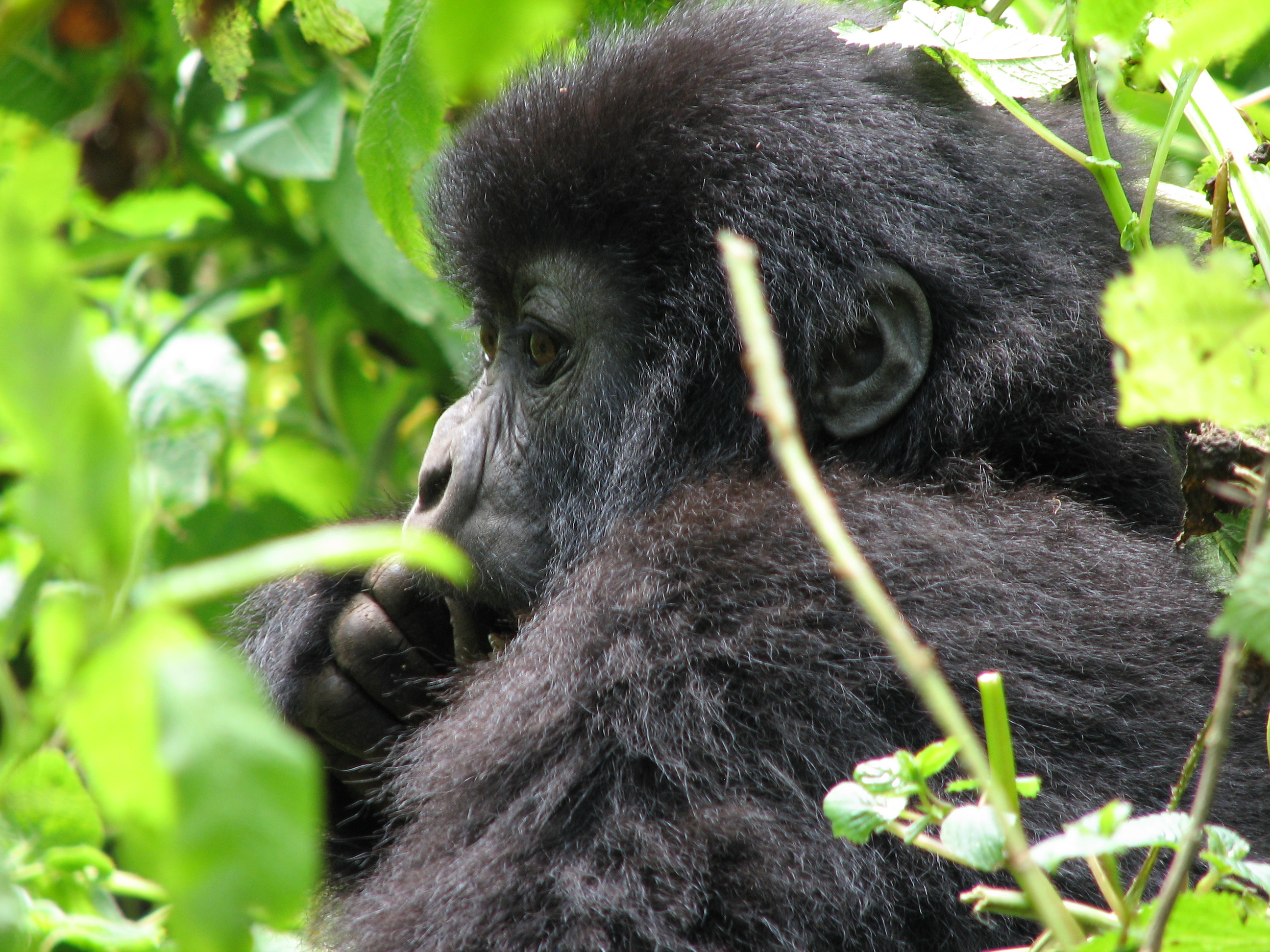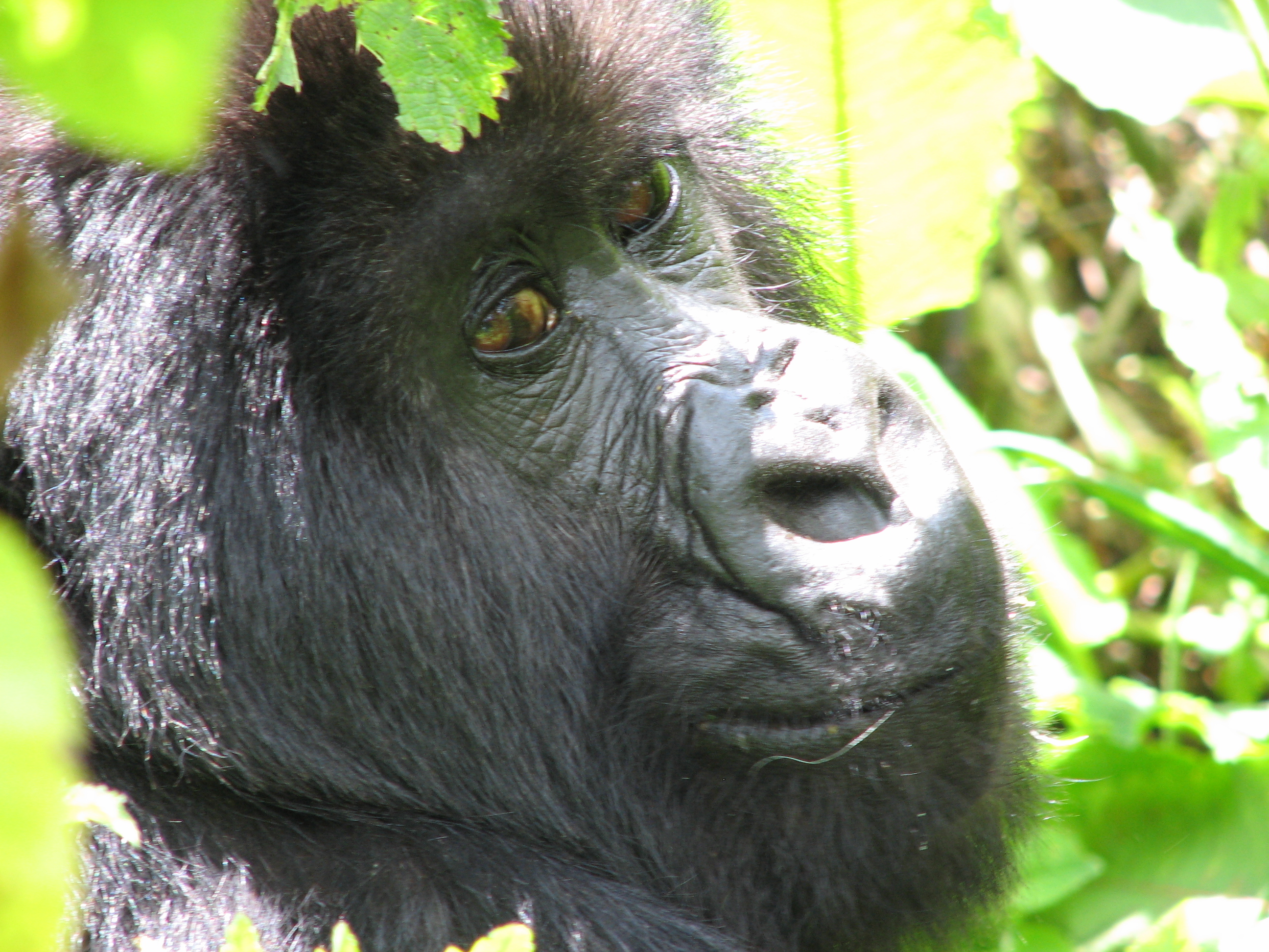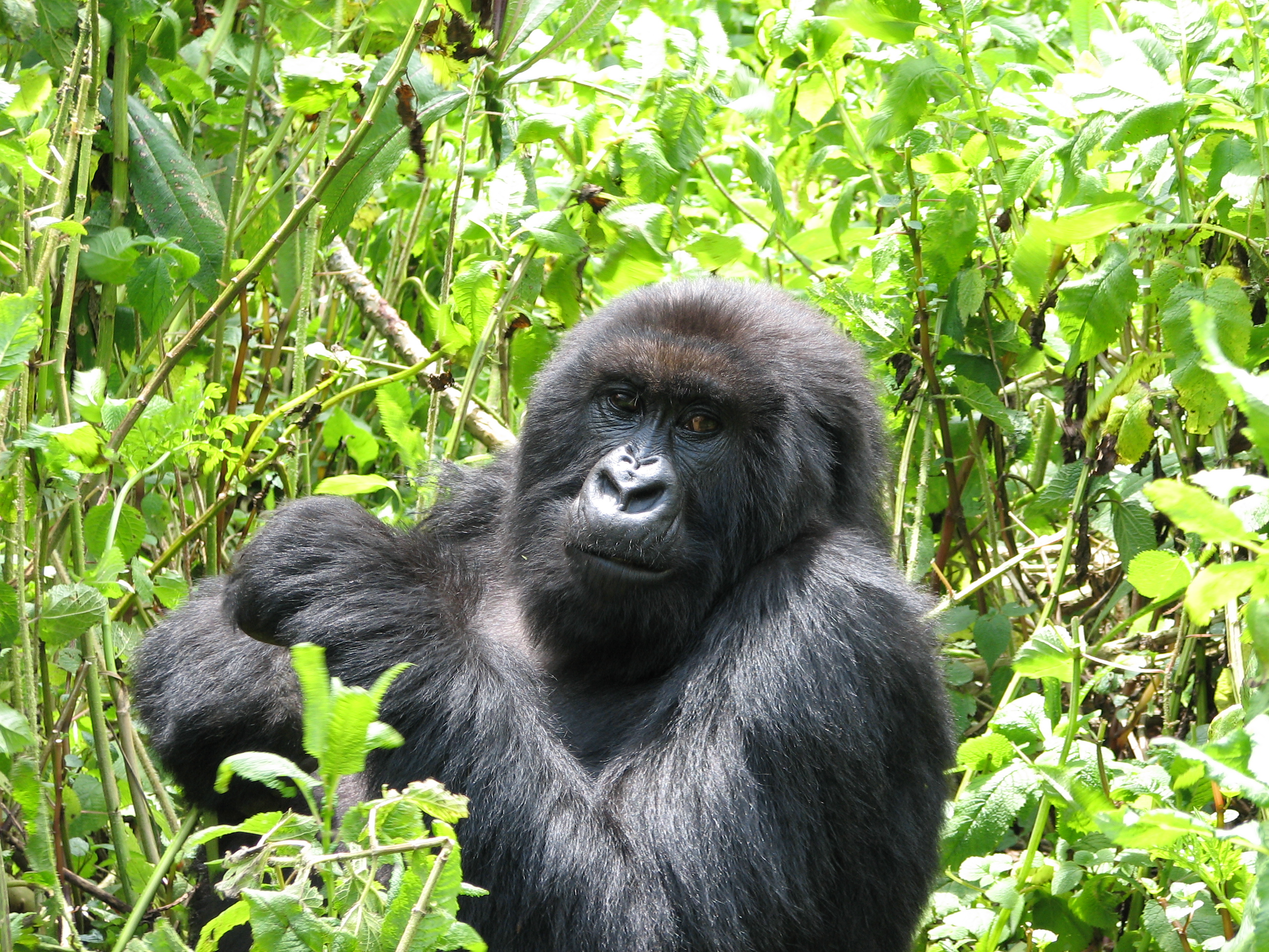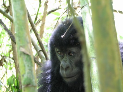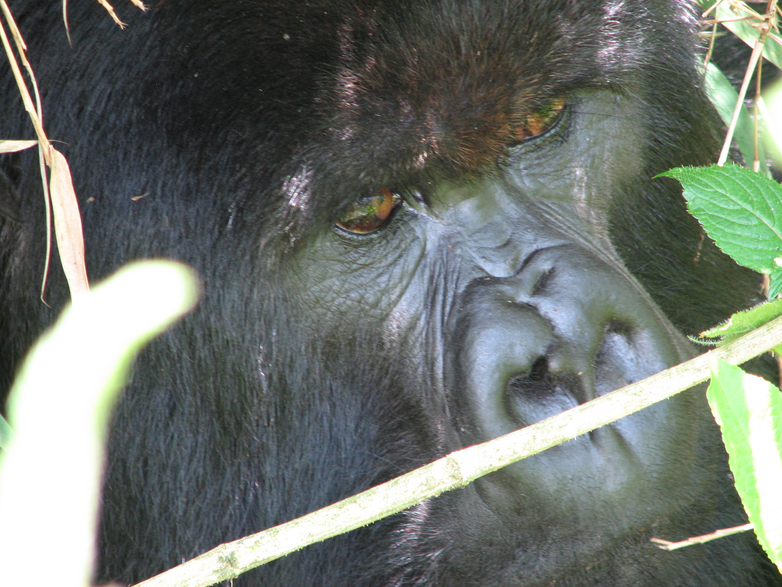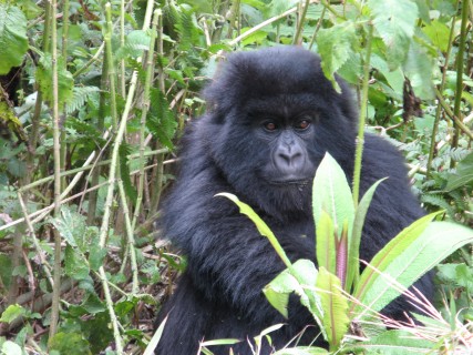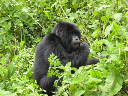 There is a 7 meter rule for how close you can get, but our guides kept telling us to come closer, pointing to where to stand. They were also cutting down any foliage that happened to be between us and a good photo opportunity. There were two youngsters playing, going round and round bamboo shoots while mom looked on (check out the video below, especially at the 15 second mark where one gorilla pinches or grabs the other one). Some were out in the sun eating, and they made much better subjects. Trying to get photos of black gorillas in low light, especially when they aren't standing still, is about impossible, since flash photography is strictly prohibited. We kept moving to different vantage points, getting the best photos we could and then moving on. Eventually Charles, the silverback, came around, but he positioned himself in the darkest spot in the middle of a bamboo grove. He was not nearly as active as the other members – he just sat there and then decided to take a nap. Between the group of us, we got some pretty good photos, especially under the conditions: