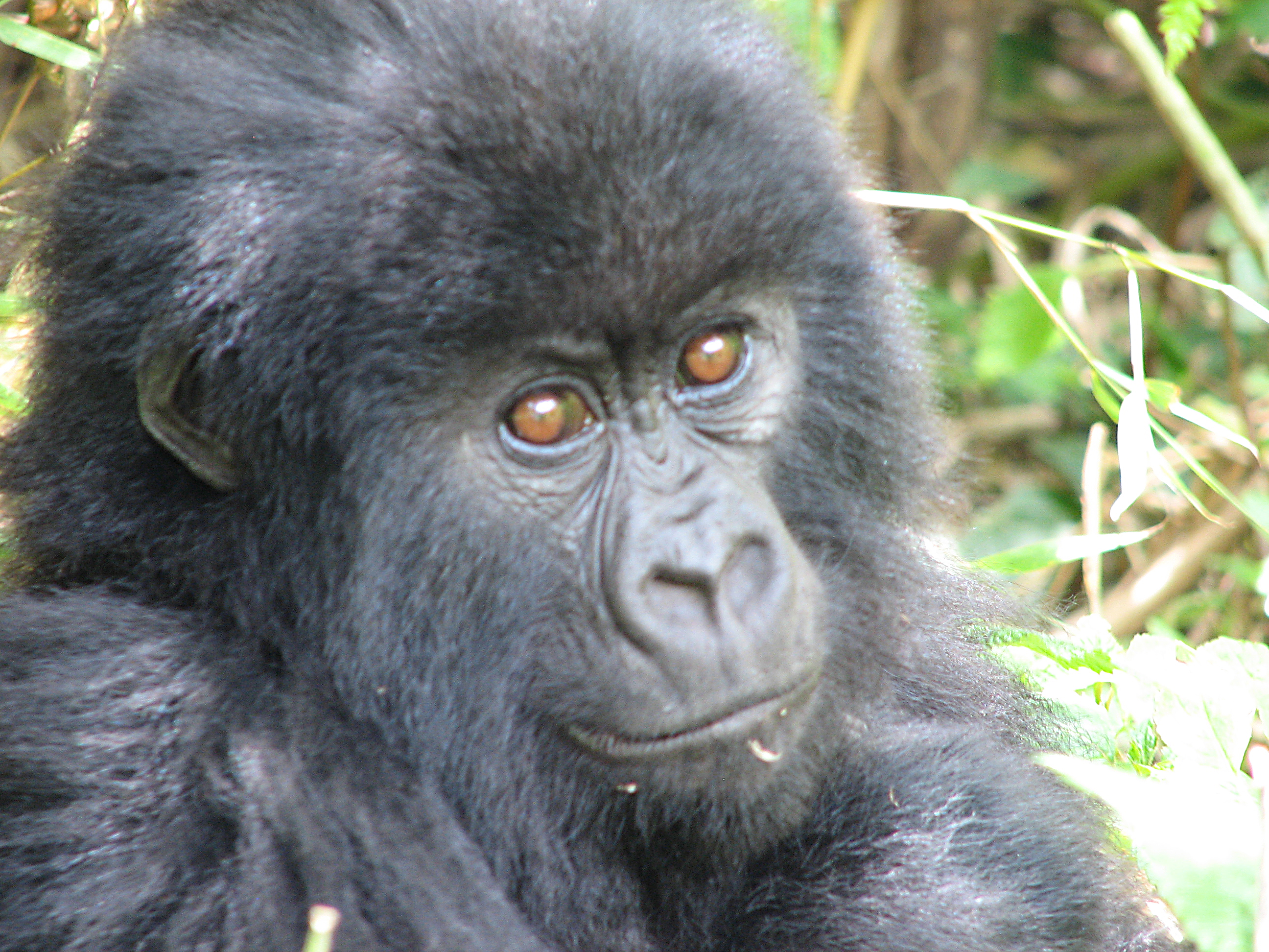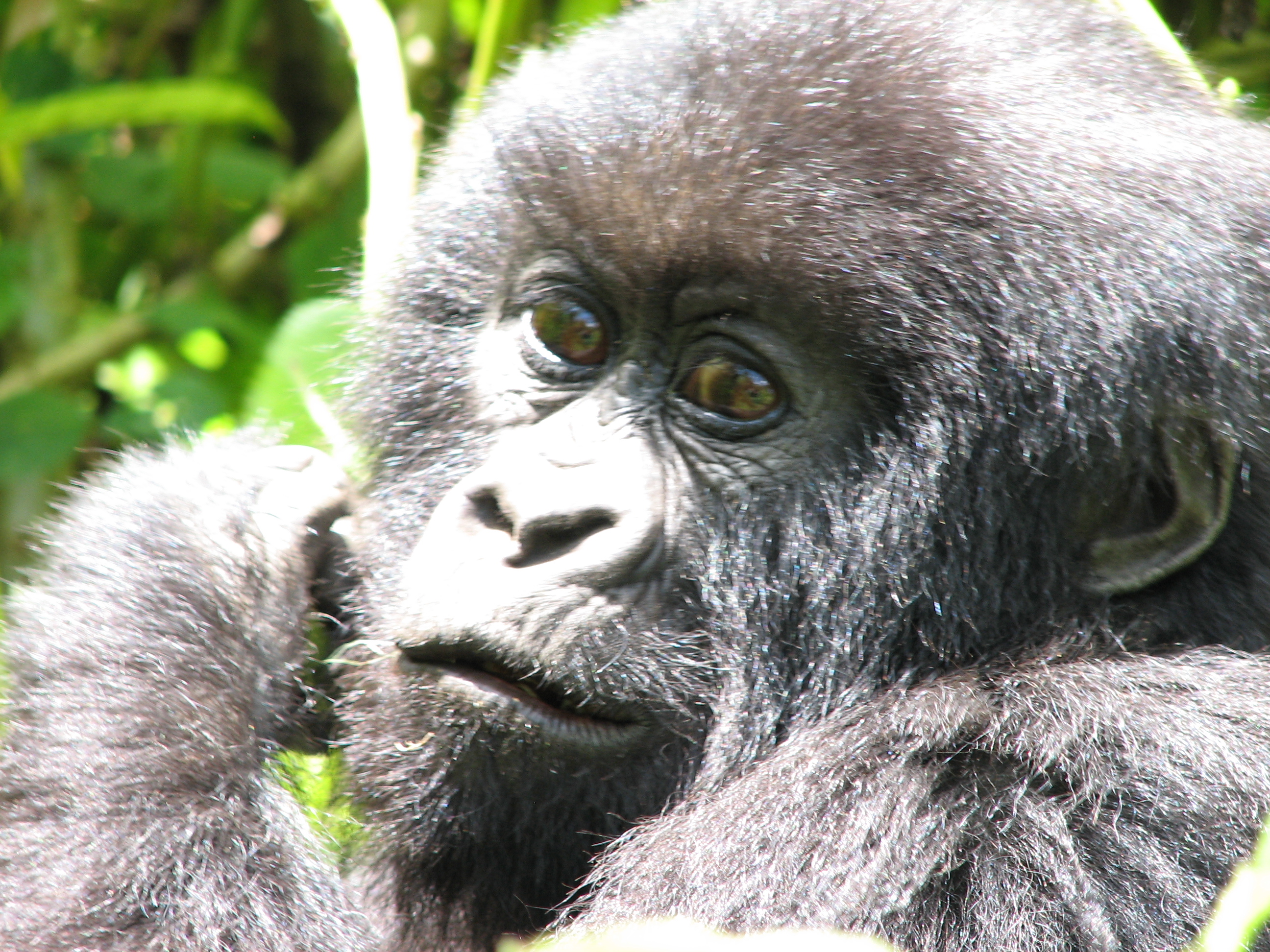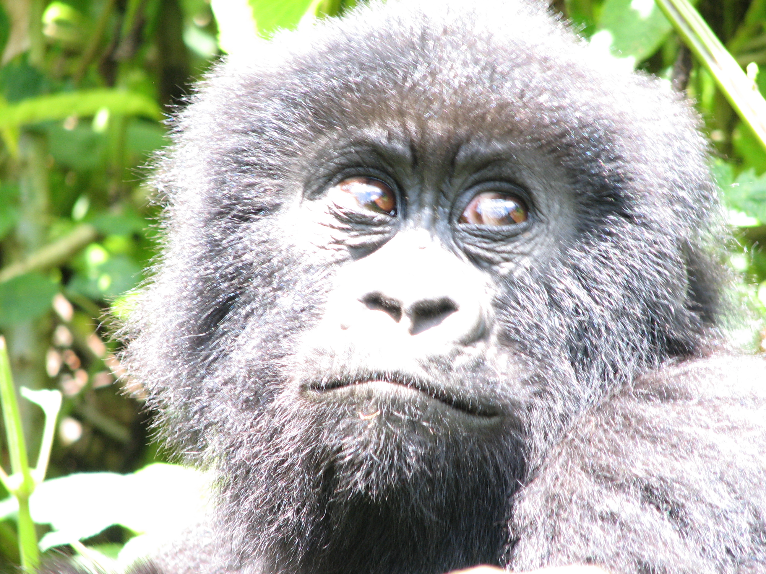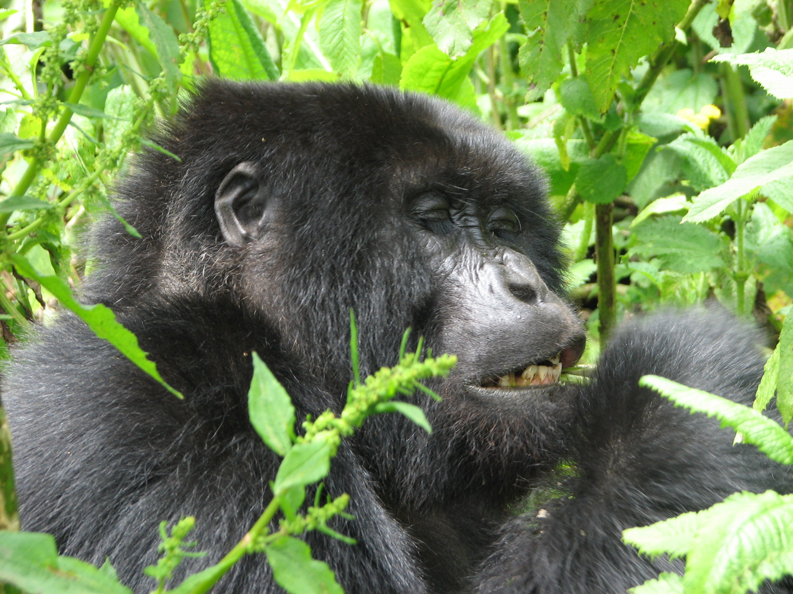 There is a 7 meter rule for how close you can get, but our guides kept telling us to come closer, pointing to where to stand. They were also cutting down any foliage that happened to be between us and a good photo opportunity. There were two youngsters playing, going round and round bamboo shoots while mom looked on (check out the video below, especially at the 15 second mark where one gorilla pinches or grabs the other one). Some were out in the sun eating, and they made much better subjects. Trying to get photos of black gorillas in low light, especially when they aren't standing still, is about impossible, since flash photography is strictly prohibited. We kept moving to different vantage points, getting the best photos we could and then moving on. Eventually Charles, the silverback, came around, but he positioned himself in the darkest spot in the middle of a bamboo grove. He was not nearly as active as the other members – he just sat there and then decided to take a nap. Between the group of us, we got some pretty good photos, especially under the conditions: