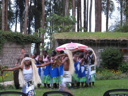 Our wake-up call was at 5:30, the same as the safari camps. Breakfast was at 6:00, also the same as the safari camps. From the lodge we could see the sun hitting Visoke and Karisimbi volcanoes. We left Gorilla's Nest at 6:30, same as the safari camps, but this time we took a short drive, on a paved road, to the National Park headquarters, not more than 5 minutes from our hotel. There were a lot of people there – tourists, tour guides for the tourists, the guides for the gorilla treks, guards, and all of the National Park employees. We didn't really know what was going on, but no one appeared too frantic, and Lawrence seemed calm, so we just stood around waiting and doing everything we were told.