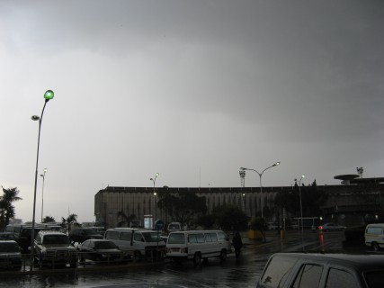 Unbelievably, this actually worked, although not very easily. Justin went down and found the ATM, but it was actually outside the baggage claim area, past the one way doors. The ATM worked, but had only Kenyan schillings. Justin had to figure out what the exchange rate was, and then get more than enough in schillings. He then changed this back into dollars, then came back in. He successfully convinced the security people with machine guns to let him back into the baggage claim area, and then walked back up the stairs to customs.