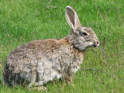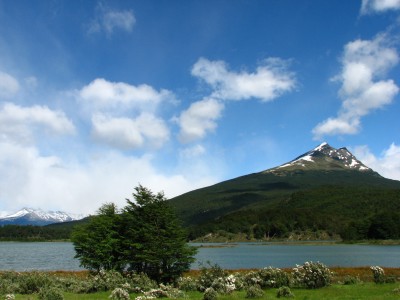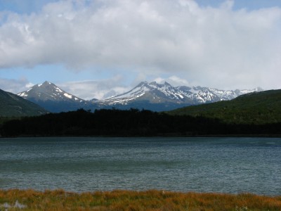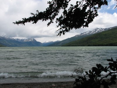 We thought that we were waiting for the second train to come in, but in fact it was the first, so we were late getting back to the bus (especially Justin, who was lagging behind Crystal). Back on the van, we took a short ride over to a lodge by a river feeding the Beagle Channel. The guide told us we could buy food and drink inside the lodge - we were wondering if we were actually going to trek anywhere, or if we were just being sold a bunch of stuff while at the same time paying for the advertisements. At the river, the view was very good, and there were also a bunch of rabbits all around eating the grass. We never went into the lodge, but we also didn't stray far from the van, as we didn't want to be late again. From the river, we headed down a bit until there was a larger lake, Laguna Roca,which we understand is now outdated, and has been replaced by a Yamana (the native indian) name.