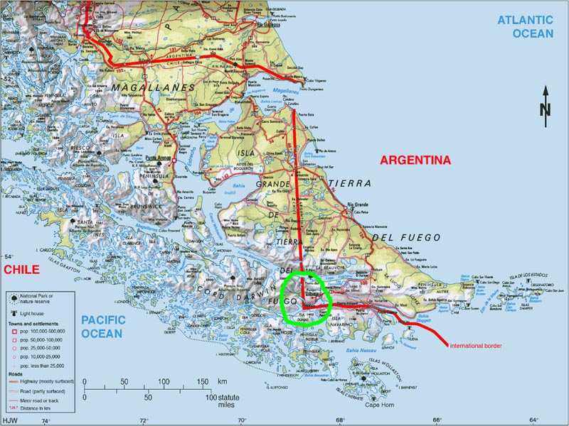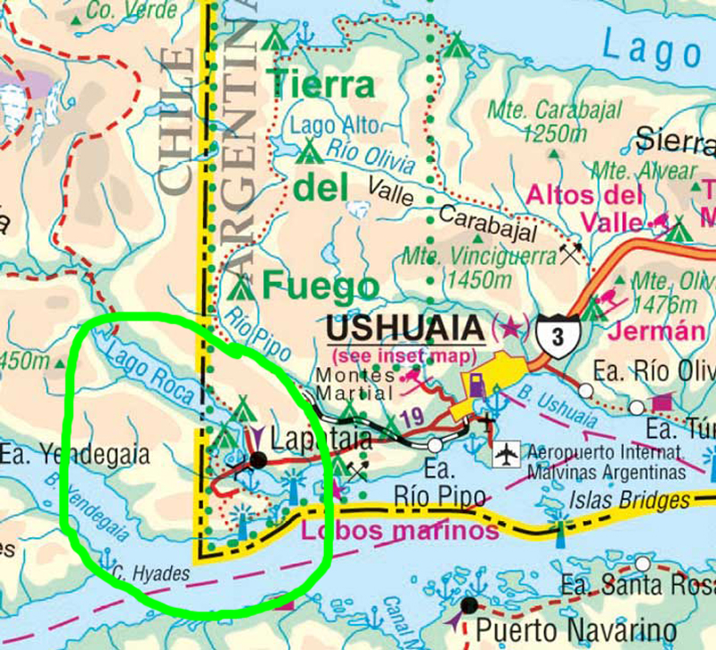 Our guide told us a bit about the borders around. We didn't realize that we were basically in the "corner" of Argentina. We knew that the Beagle Channel separated Argentina (north) from Chile (south), and we knew that for the border, the Andes separated Argentina (east) from Chile (west). What we didn't know was that Ushuaia - and particularly the national park - was in the corner where the border curved from being an east-west border to a north-south border, with Ushuaia being in the Northeast quadrant and Chile being in the other 3.