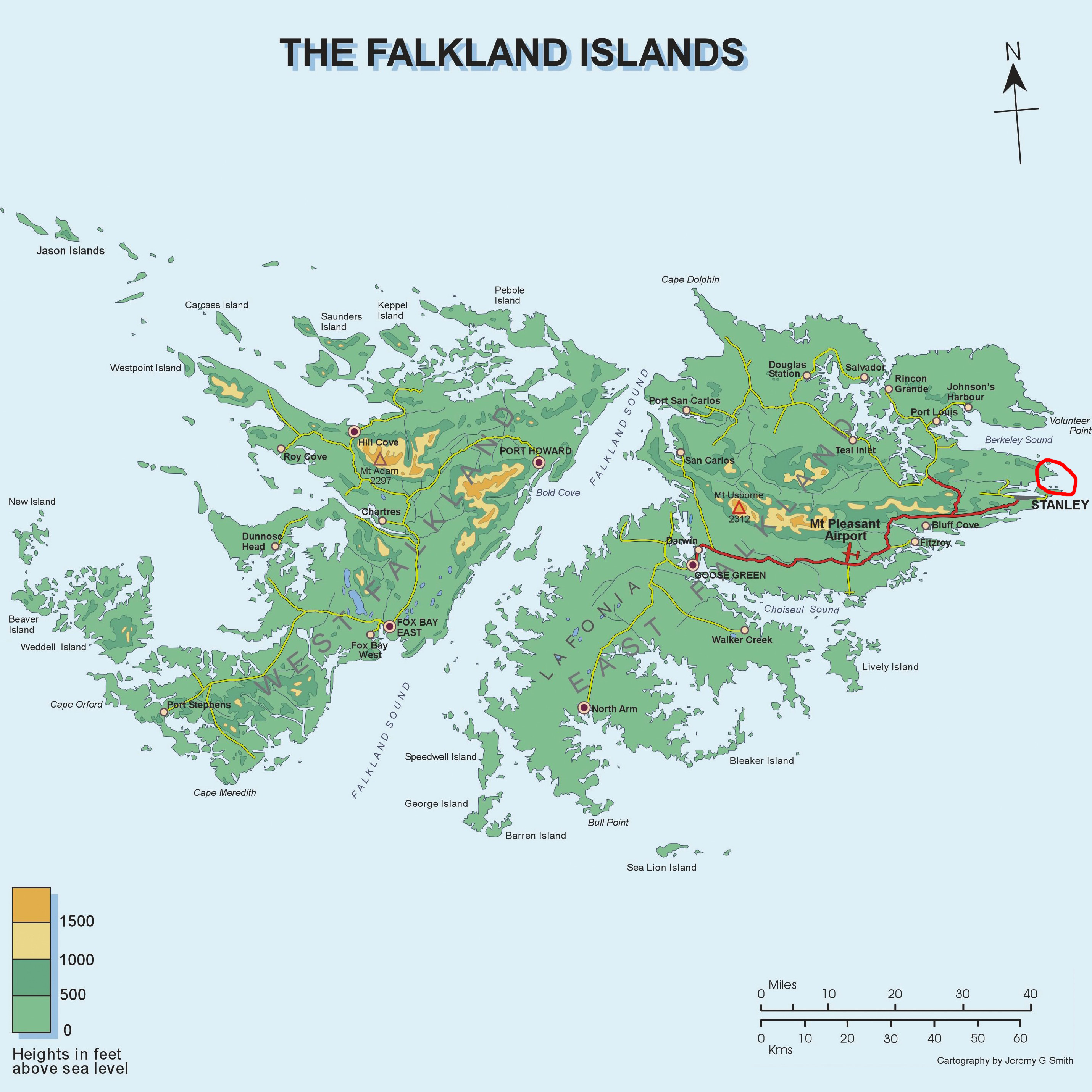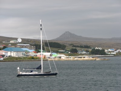 When we got our wakeup call, it was sunny and we were already in Stanley Harbor, about to drop anchor. Sometime during breakfast and/or us getting ready, it turned very overcast, and the wind started going pretty good. On the zodiac ride over, our engine lost power, so we had to get towed by one of the other zodiacs. Fortunately nothing bad happened when trying to dock at the jetty. And fortunately this was a dry landing, and not a situations where the driver needed to gun it up onto a beach. It was a little odd seeing civilization again, and it was doubly odd since this was a British area, with everyone speaking English and everyone driving on the left side of the road. About half of the vehicles we saw were old Land Rovers.