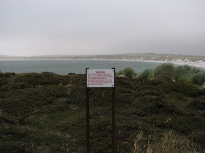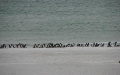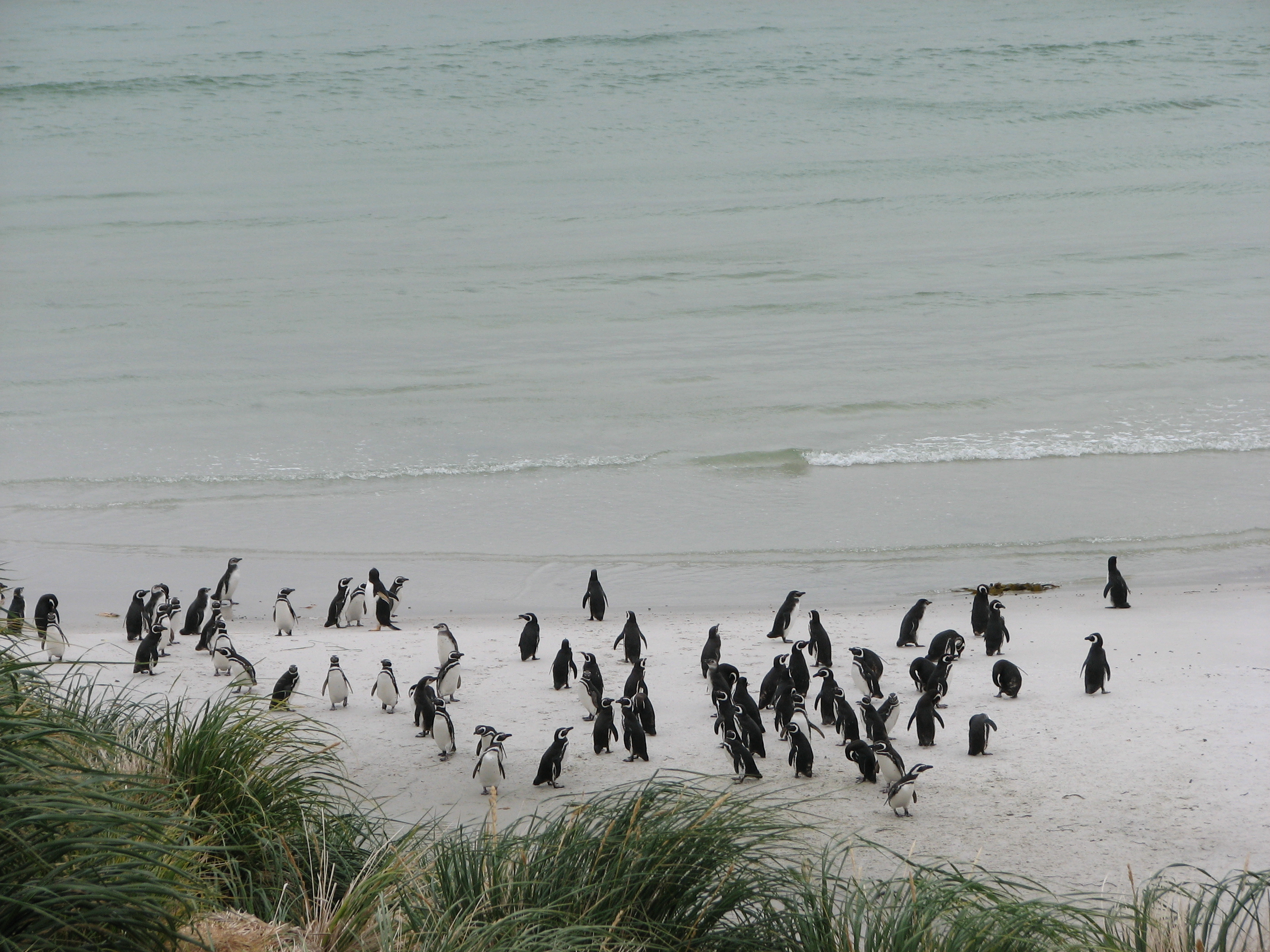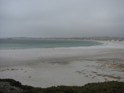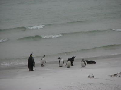 Gypsy cove looked very nice, but it was a bit of a bummer as well. It was a picturesque bay, with three different species of penguins (a lot of Magellanic, plus a solo Kentoo and a solo King. But we couldn't get anywhere close to any of these animals because the whole area was roped off due to land mines. The Argentines set land mines all over the place near Stanley in 1982 as part of the war, and not all of them have been cleared. The Falklanders believe that they've located and roped off all of them, but they aren't 100% confident, so they have roped off large swaths of land. Moreover, they have no intention of trying to clear the landmines, because the money out of the budget for clearing the mines could be better used for clearing mines in parts of Africa that are more highly populated.