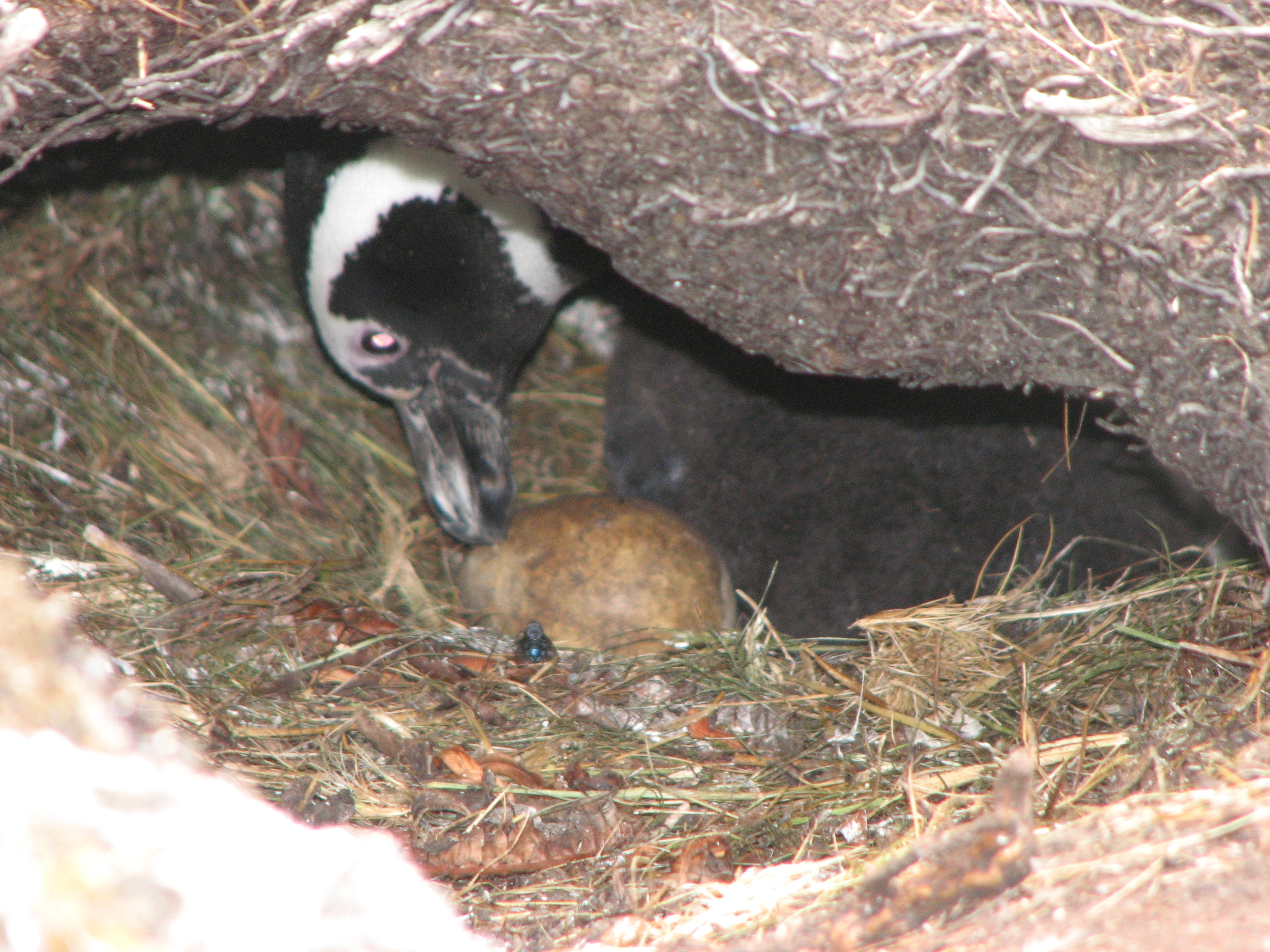 All of this, presumably, helps out the penguins, because it reduces our interference with them, and also prevents us from encroaching on their territory. The penguins are not heavy enough to set off any of the land mines, either. Maybe there should be more land mines around nature areas we want to protect. The sun from when we woke up was long gone, and there was a slight drizzle and a heavy wind, making picture taking difficult - we basically had to take photos when the wind was at our back or close to it. It was fun to watch the Magellanic penguins scramble away when a big wave would splash water into the small pool they were sitting in. They would scramble out of the pool and run until they were all packed together, back near where the main waves were breaking. We weren't sure why there was a lone Gentoo and a lone King, and why they weren't with the rest of their group. On the way out, we saw a Magellanic penguin in one of its burrows, right near our path. It was in there with one of its eggs.
