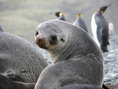 Outside, we saw our first iceberg, and there were also Macaroni penguins and fur seals about. Shortly thereafter, we started to see some of the outlying islands of South Georgia, and as we got closer and closer the amount of birds, penguins, and seals increased. Around 11am we rolled into Elsehul Bay, and the water was a nice blue-green color, and the cliffs were shrouded in clouds. Perhaps because of the cloud cover, and the amount of animals everywhere, it had an eerie, mystical sort of appearance. Many of the rocky cliffs were covered with nesting gray-headed albatross. The bay was completely full of fur seals (and we may have seen other seals as well). On the beaches, we could see penguins, but we weren't sure exactly what kind. We were very excited to go out on a zodiac around the bay after lunch.