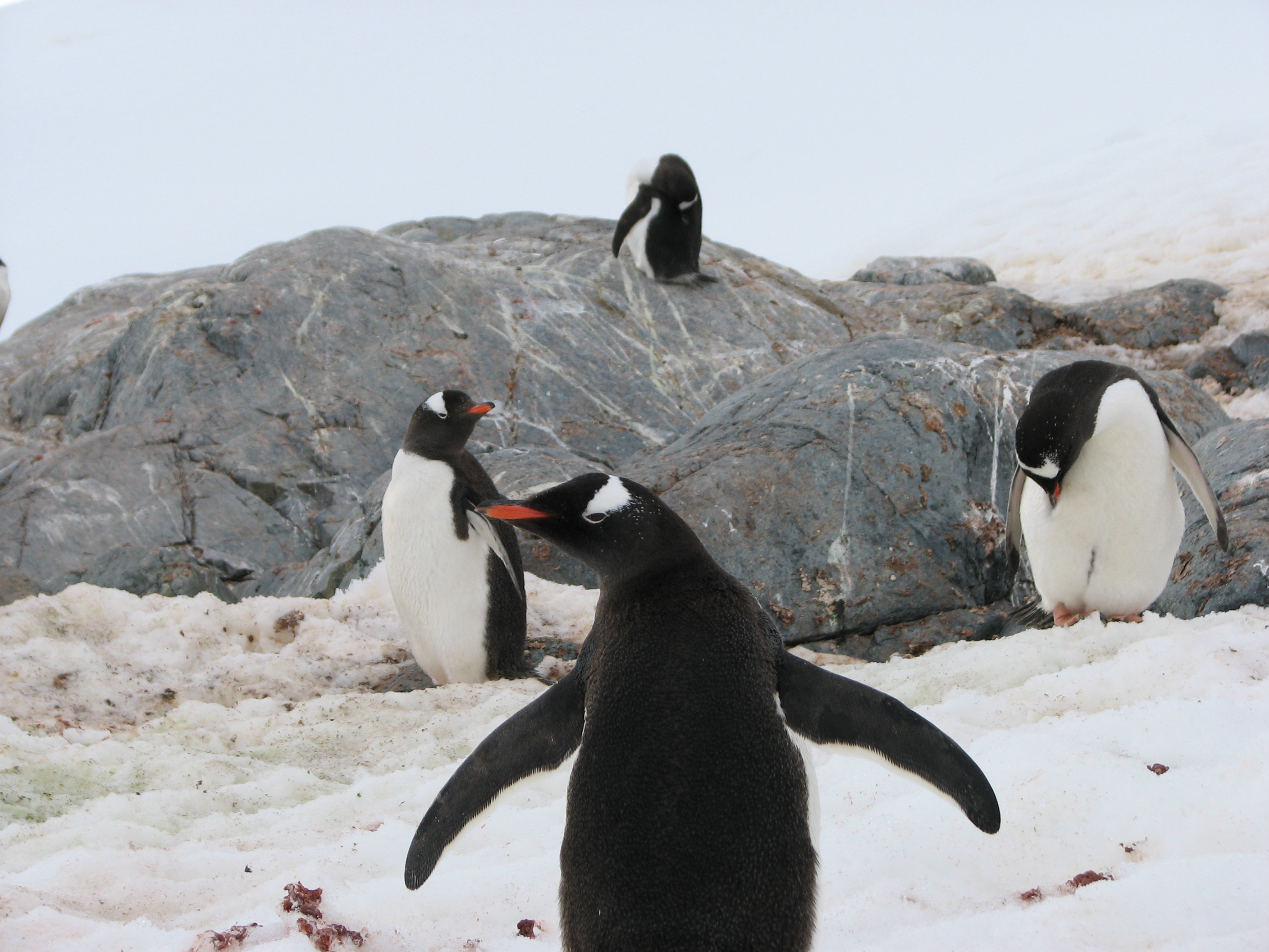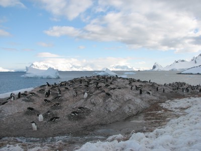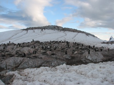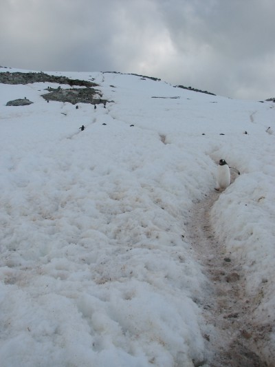 We got a 5:00 wakeup call today. We were told the day before that this would be quite a busy day. At 5:30 the zodiacs took us over to Cuverville Island. There were two Gentoo penguin rookeries - one on either side of our landing spot. Our landing spot was a little precarious. The "beach" - nothing more than small-to-medium sized rocks - was less than 3 meters deep. Behind it was snow that was knee-high deep. Between many of the rocks was frozen water, so the options were 1) walk in the water, 2) walk on the slippery rocks, or 3) walk in the snow. We chose #1, and our feet got quite cold.