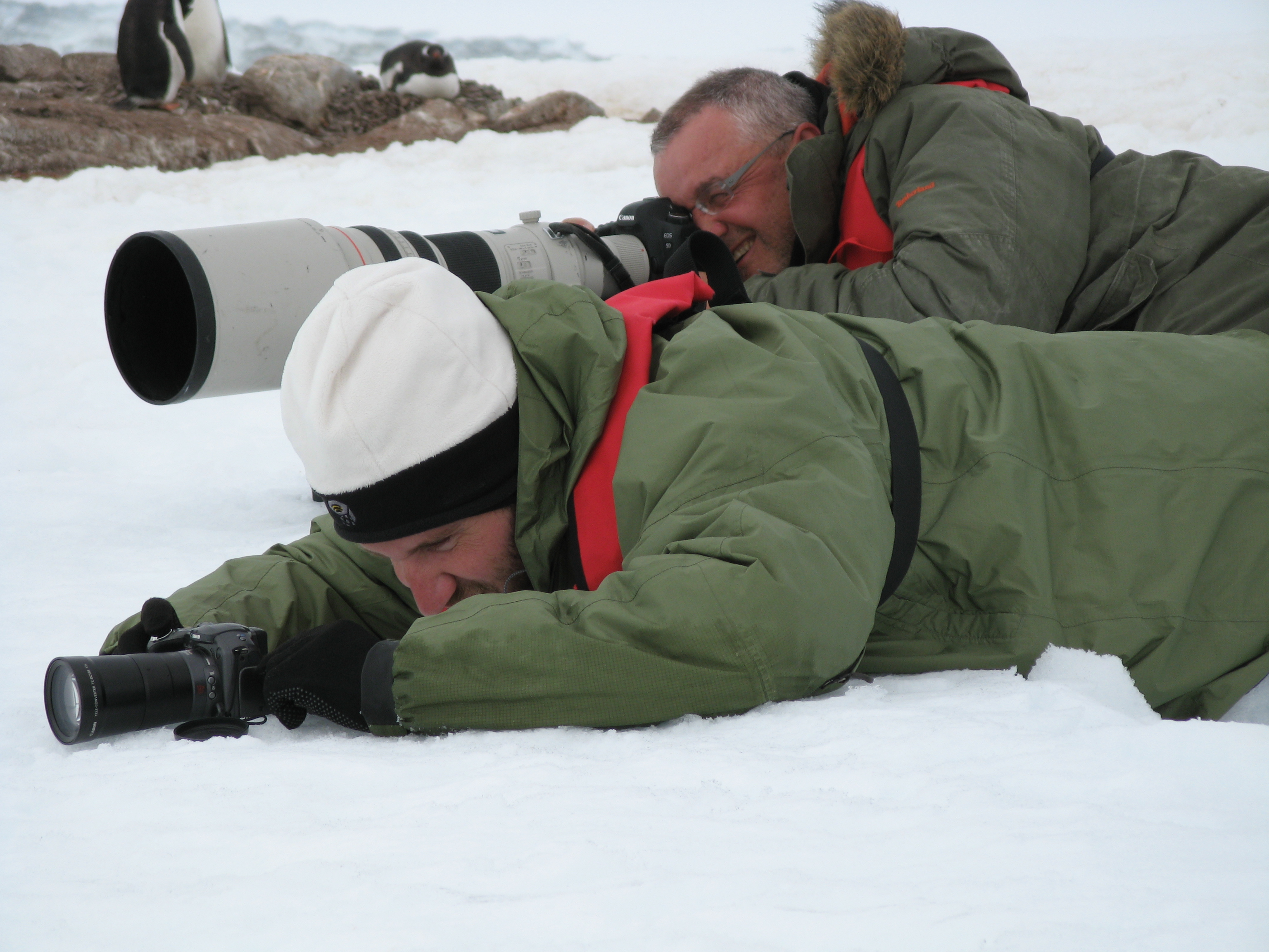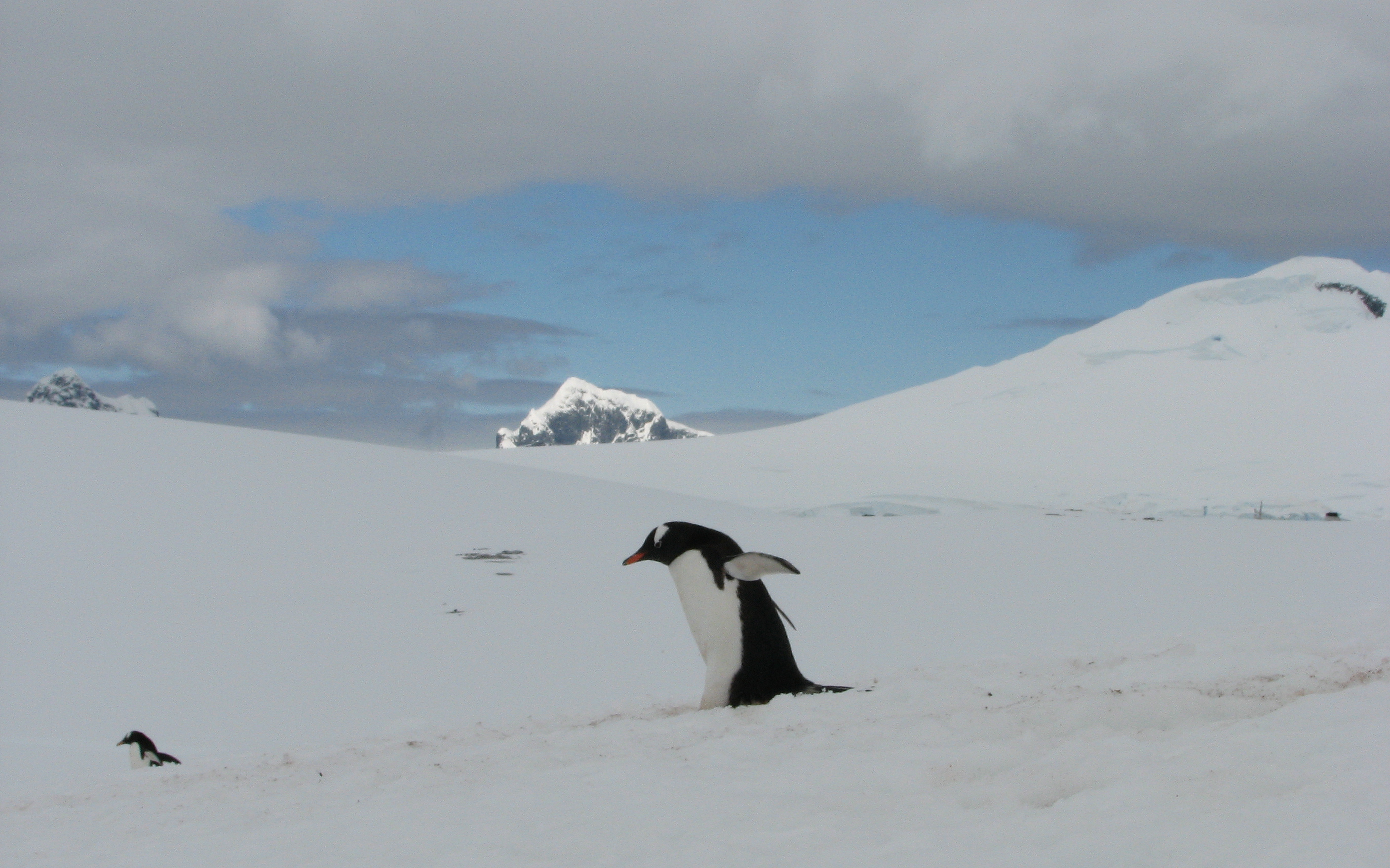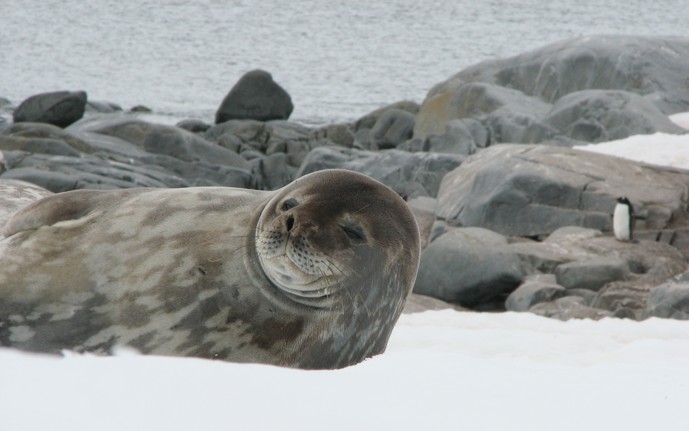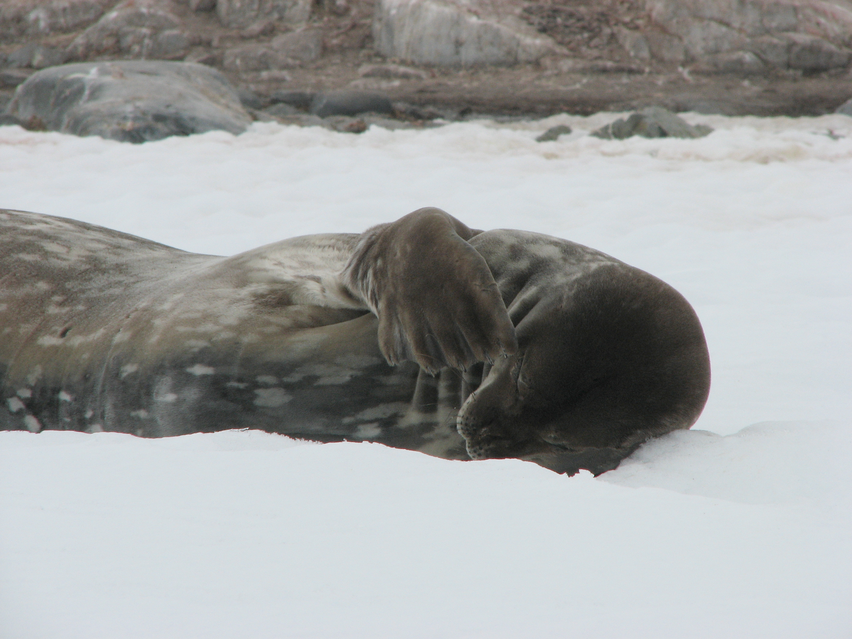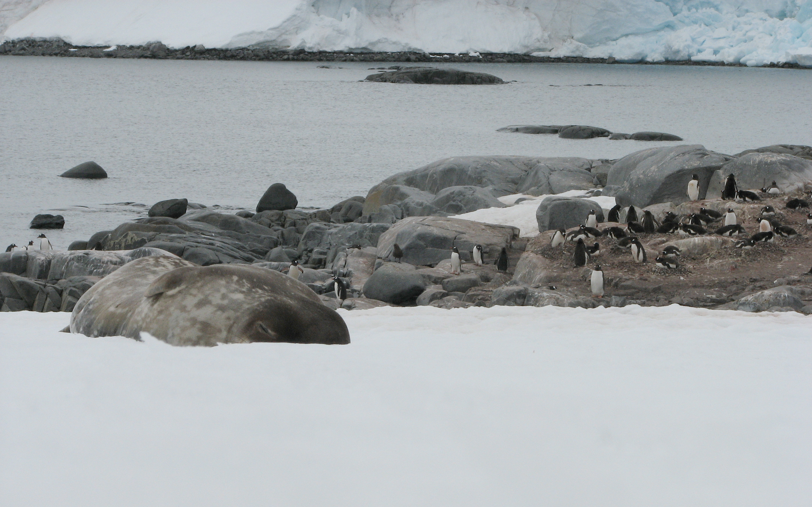 Damoy Point had a bunch of Gentoo penguins, but it also had something new, a Weddell seal. Many people walked up to a peak for a panoramic view - we opted to walk towards the seal instead. Either way, there was a ton of snow, and we were trudging along in snow past our knees. Crystal actually got one of her boots stuck at point, and had to dig it out. Justin and Adam (one of the more avid, if not most avid, photographers on the trip) were at the front of the line, and were falling in the most - everyone else more or less followed their steps. It was good exercise (and we weren't cold anymore, except for Crystal's foot), but it was very frustrating, but everyone seemed to find it more humorous than anything. The Weddell seal was very lazy - it slept 99% of the time we were there. We were all contorted to get a picture of the 1% when it moved. Meanwhile, there were penguins all around that were being ignored.