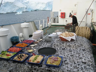 We got back to the ship a little after 7pm, and went to the bow of the ship for an outdoor barbecue. The food was very good, but it was freezing (perhaps literally) outside. In retrospect, we should have never taken more than one item at a time, since whatever wasn't being eaten right at the time got cold in a big hurry. We came inside around 9pm, and hung out in the bar. Shortly, nearly everyone was in the bar, and it was packed until after midnight. We were at a table with Brigita & Peter (and kids), and Nick & Lesley.