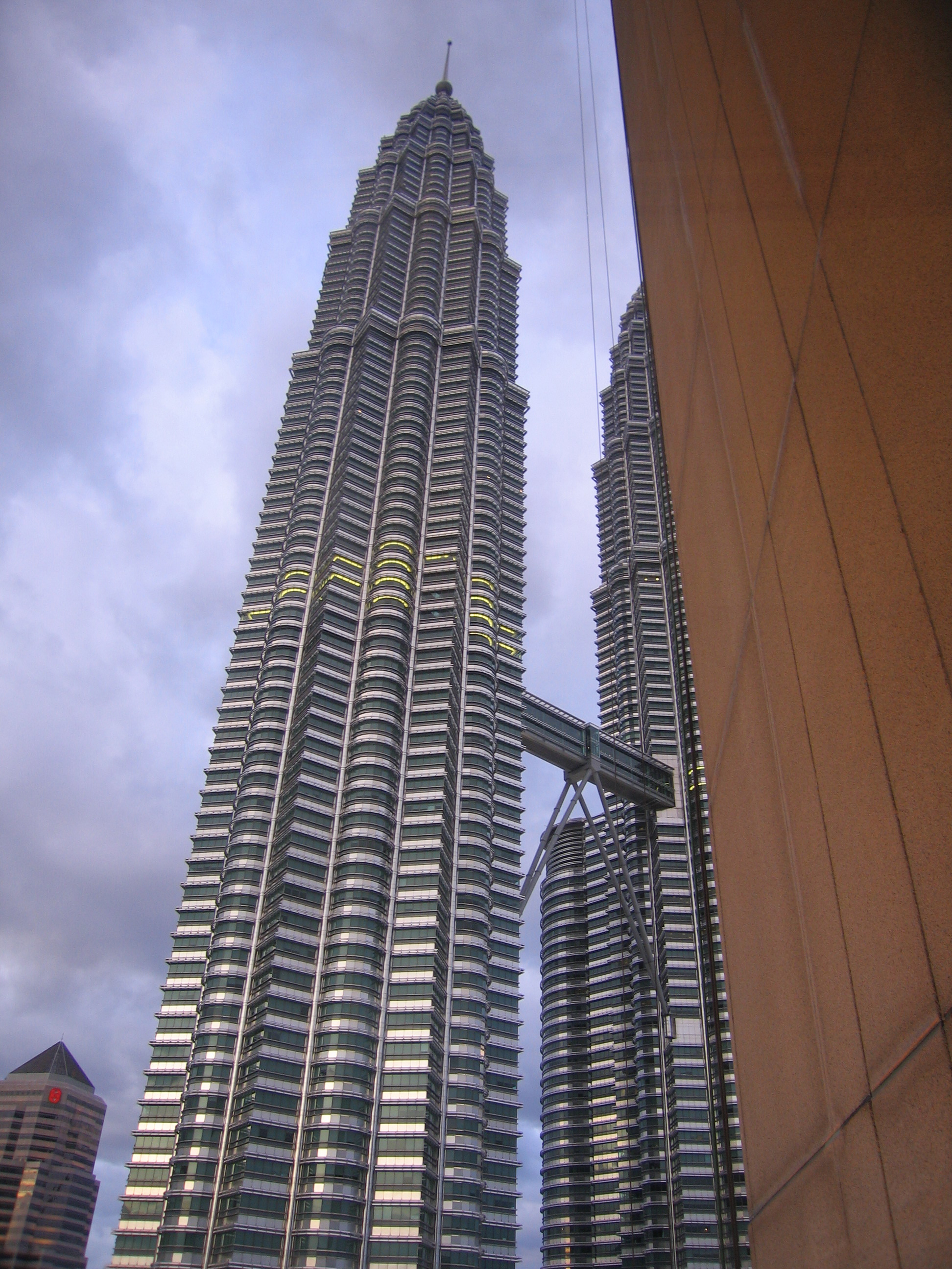 As we approached the hotel, it was impossible not to see the Petronas Towers, which are directly adjacent to the hotel. The Twin Towers are the defining image of Malaysia, and are the tallest twin towers in the world. And unlike many tall buildings that are just big rectangles, these look really cool, both in shape and in color they have a metallic sheen to them and are very reflective of the sky. The shape of the footprint of each tower is based on a shape that is important in Islam. We had a view of the Twin Towers out our window (room 1113), and you have to get right up to the edge to see the top.