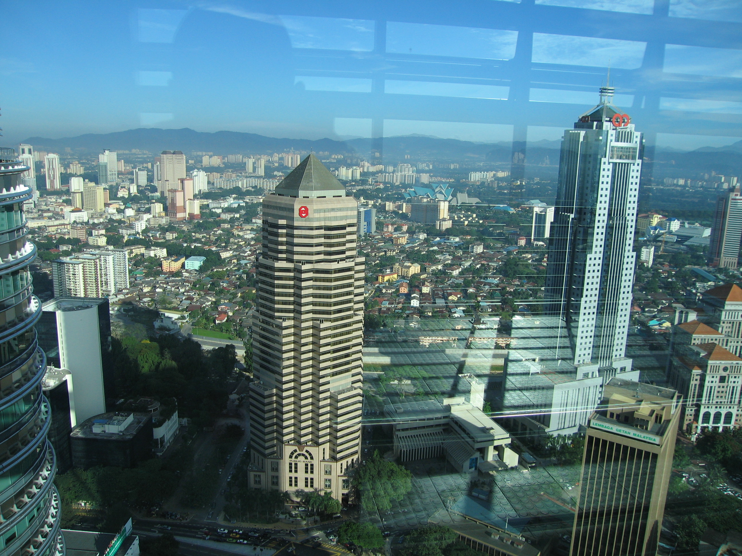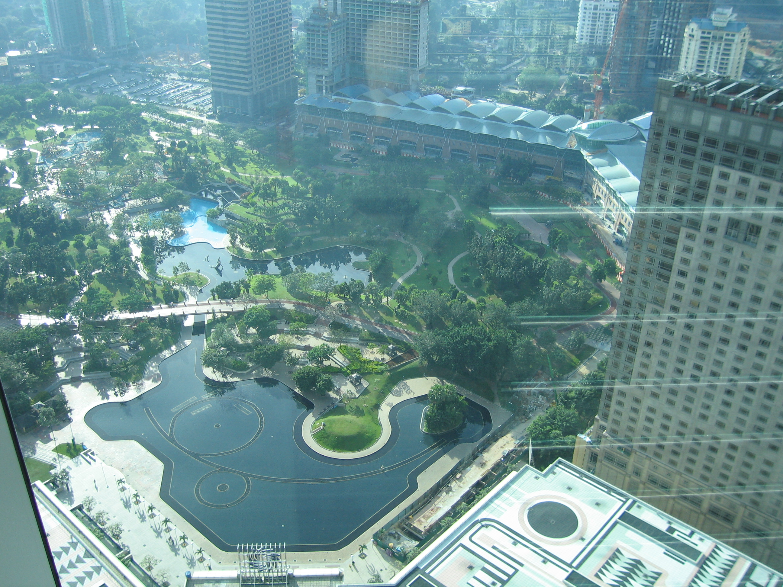 After breakfast we headed over to the Petronas Towers to get in line for the tour of the sky bridge. The sky bridge goes between the two buildings, and is on the 41 st floor. There is also one on the 42nd floor, but that one is utilitarian, and is only accessible to people employed in the tower. We got in line at 8am for a ticket window that opened at 8:30 for tours beginning at 9am. We were behind about 50 people in line, and by the time we got our ticket there were a couple hundred people in line. Up in the sky bridge, the views were good, but not as good as from Menara KL. Also, since the sun had just come up (it goes from about 7:30am to 7pm here), the glare on the west side was pretty intense, making taking pictures and video a challenge. Anyway, it was nice, and it was free, and we can say we did it.