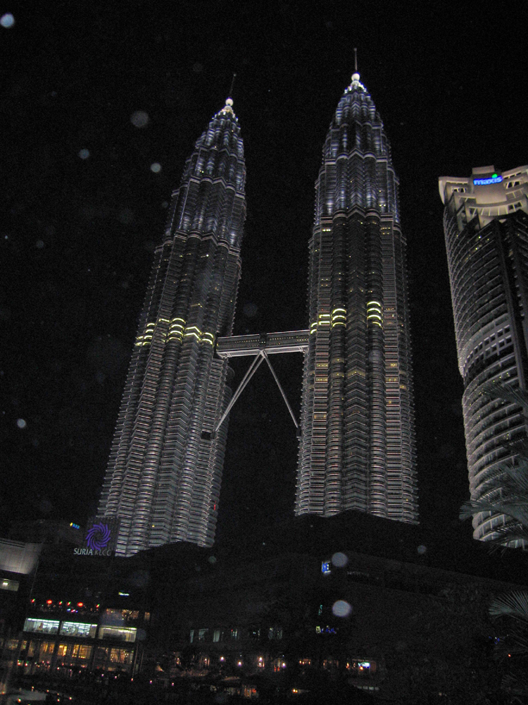 After we got back to the hotel, Crystal went to sleep and Justin went out to the park. At night, there is a fountain display in the courtyard by the mall at the base of the Petronas Towers . Also at night, all of the clubs are in full swing, and there are young people and music playing everywhere. The fountain display was quite nice, and the Towers all lit up was an excellent backdrop. When we come back we'll have to go out an experience the nightlife. The driver on the firefly excursion said we were young enough to go out, stating that you remain young as long as dreams are not replaced by regret.