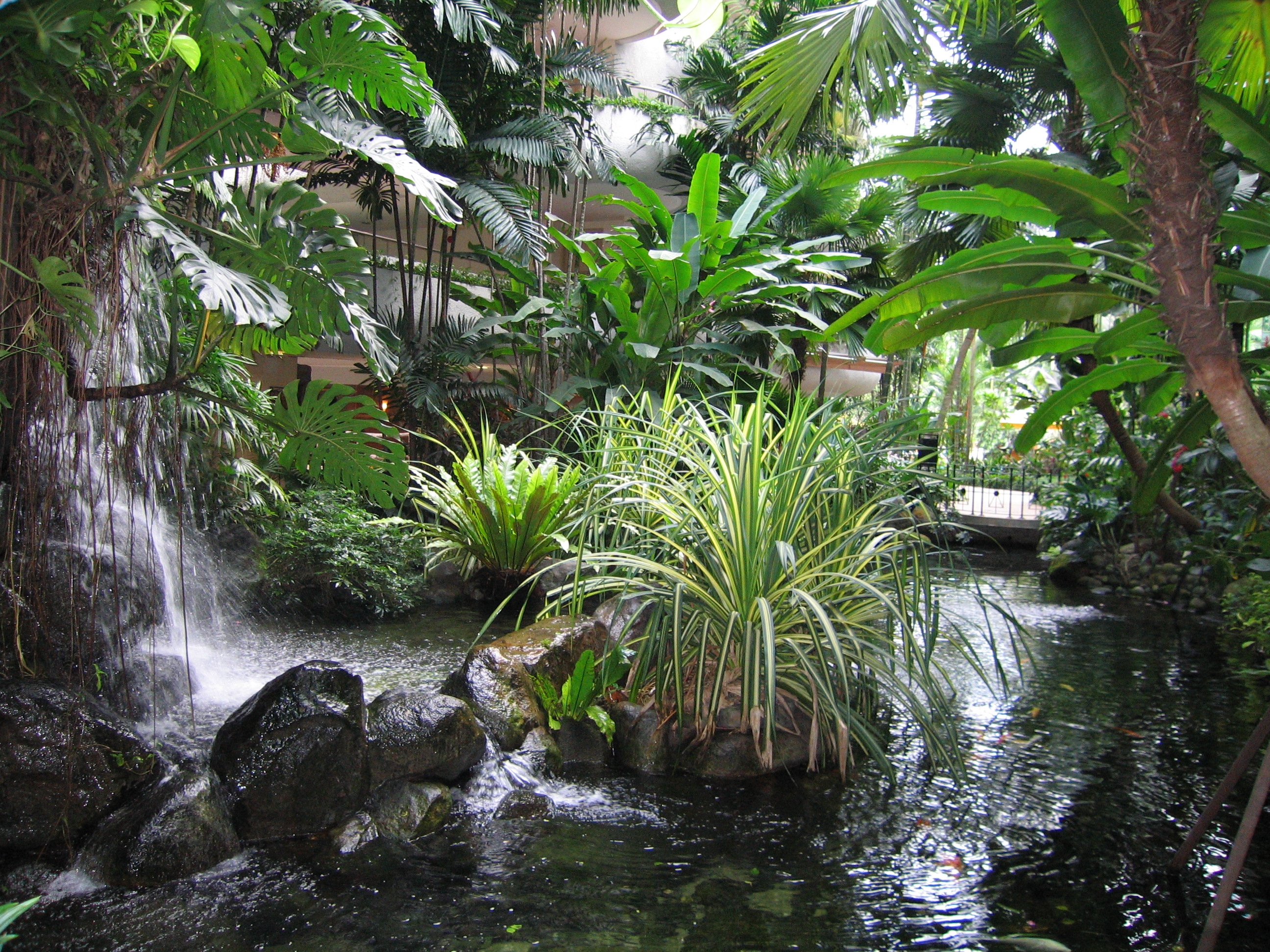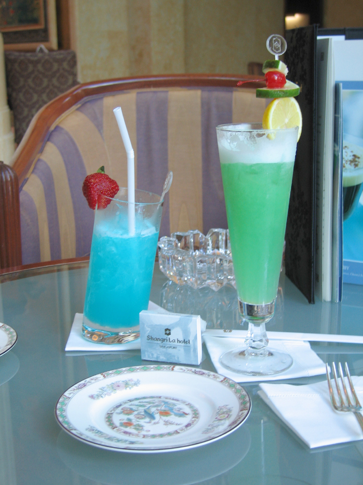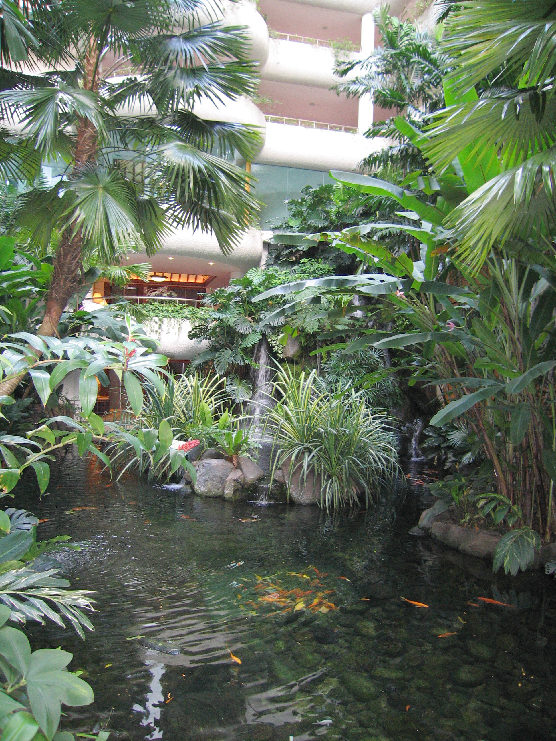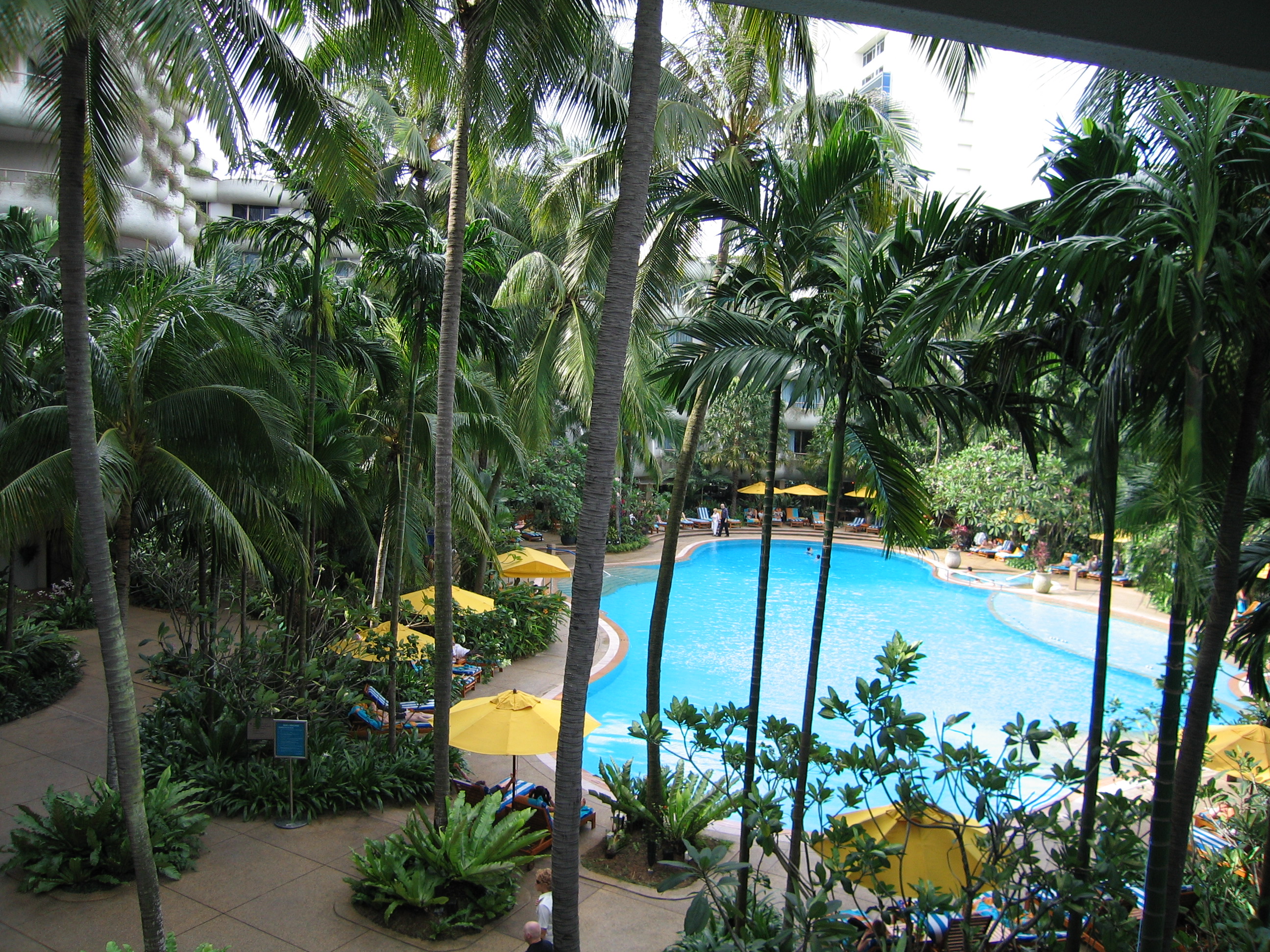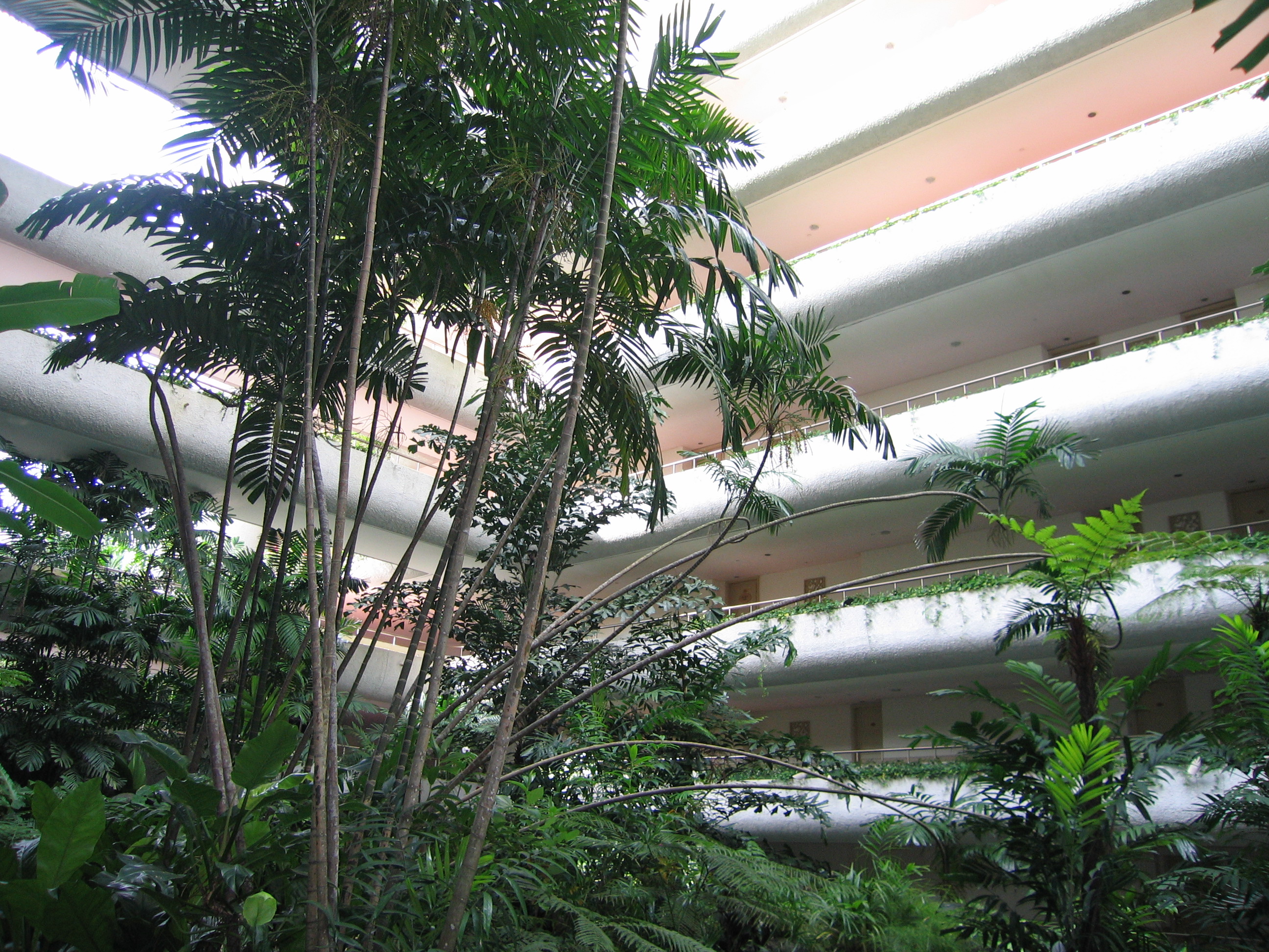 We got to the hotel – we stayed in the Tower Wing (room 1514) – and unpacked, then got some drinks from the lobby lounge. The drinks were about $10 US, which seemed exorbitant until we realized it was like this everywhere in Singapore. We were also amazed by the outfits of the waitresses – for a conservative country, the outfits were the complete opposite, having long slits on both sides that went to within a couple inches of the hip bone. After our drinks we went on a tour of the grounds. The Shangri-La is regarded as the “other” botanic garden in Singapore. The grounds are very large, well-laid out and extremely well manicured. The open areas and occasional mass plantings reminded us of how the hotels are laid out in Wailea on Maui. The gardens at the hotel had some nice water features and some very nice clumping palm trees.