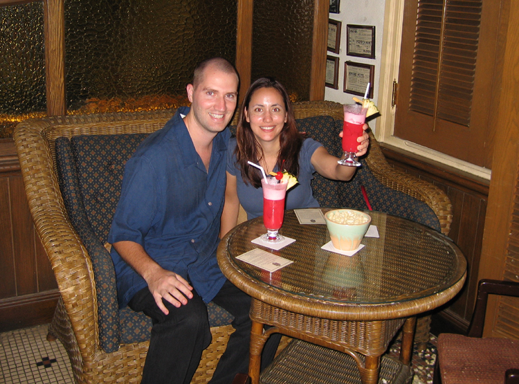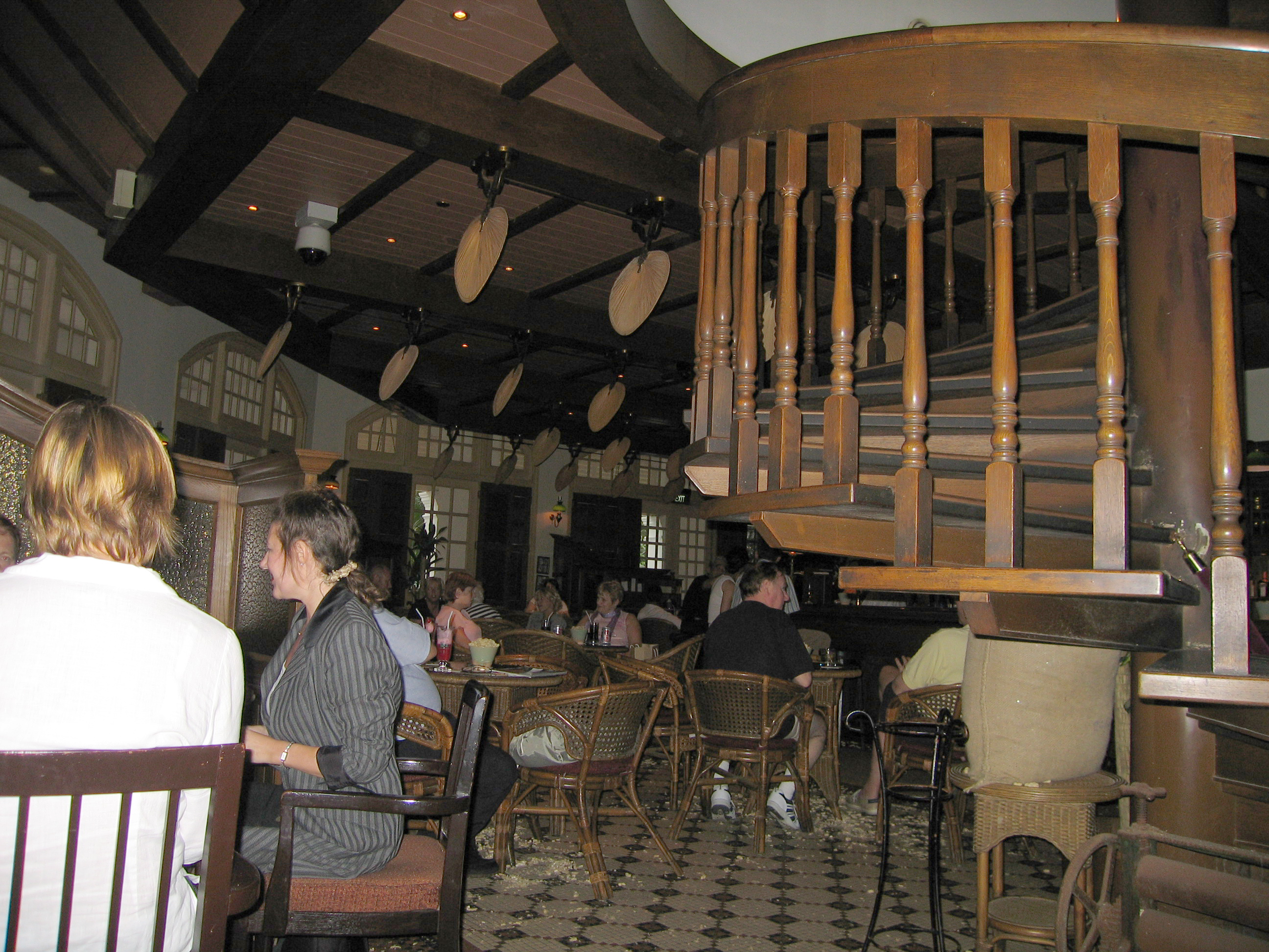 We took a walk over to the famous Raffles Hotel, where the Singapore Sling was conceived many years ago. It was supposed to be a short walk, but because of one way streets with no sidewalks and construction zones, it took a good while, with several underground paths to cross streets. We did make it there eventually, just before it started raining again. We read (and were told) that the dress code at the Long Bar was “smart casual,” as it had been at some of the other places we'd been. Smart casual basically means no shorts or flip flops, or as we thought, also jeans and tennis shoes. We weren't overdressed, but we could have been more comfortable. Anyway, the bar was nice, we drank our Singapore Slings – Justin liked his, Crystal had her first and last. We also enjoyed eating the peanuts and throwing the shells on the floor – seemed out of place for Singapore.