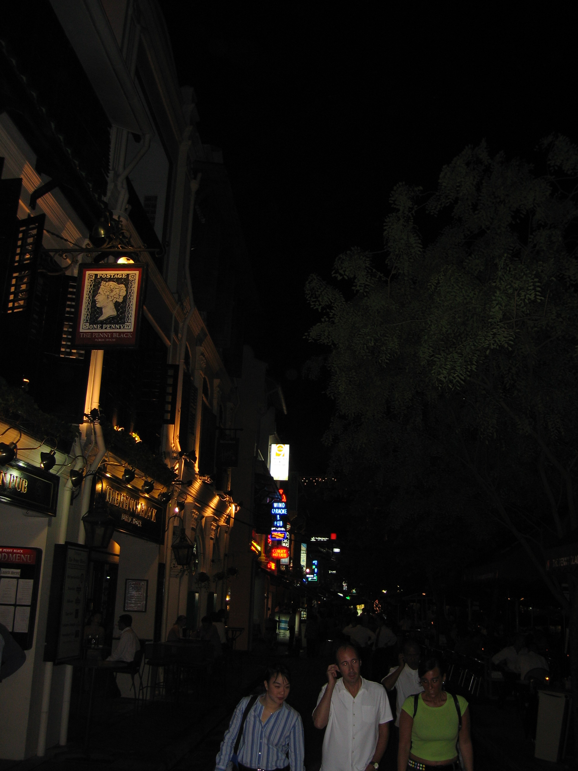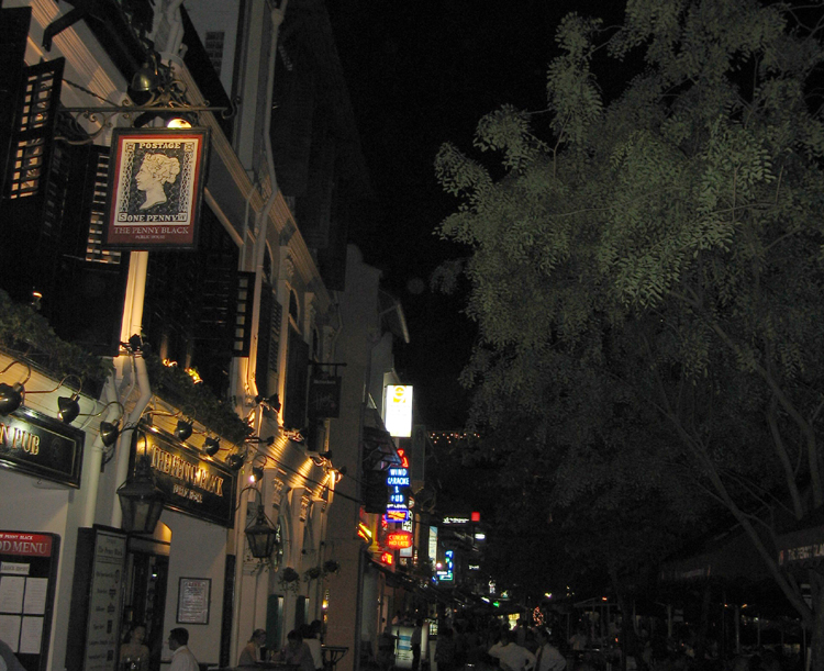 Since we were wearing our uncomfortable shoes, we took a cab back to the Oriental. We changed into more casual clothing, then went out walking to the Boat Quay. The quays (pronounced keys) are old abandoned riverfront buildings that were converted to bars and clubs in the early 1990s. Because of their riverfront location, they are quite popular with the young and hip crowd, which we satisfy half of. Before we left the hotel, we tried to get an idea of what was good and bad, and one place we read about was Molly Malone's, an Irish pub that was reconstructed piece by piece in Singapore from pieces sent from Ireland.