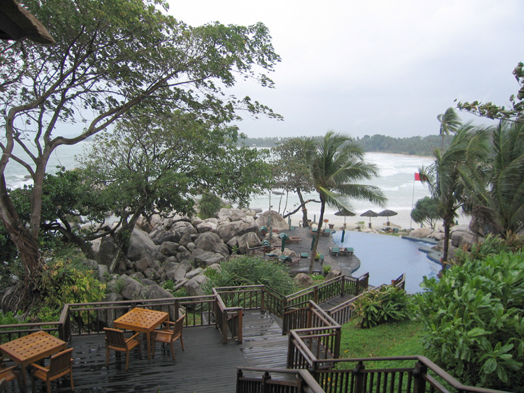 Since it was raining, we just lounged around the hotel room, catching up on the diary and packing for Singapore. We lounged a bit too much, however, and had to “rush” through lunch – we still got dessert. We were running a little late, however, and took our bags to the lobby and checked out in short order. We left the resort at 12:45 for a 1:30 ferry. We were a little concerned, as although we knew the drive would be short, we had no idea about getting tickets, going through security and customs, etc. – especially in light of the fact we had changed our ferry reservations.