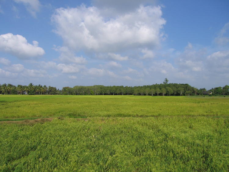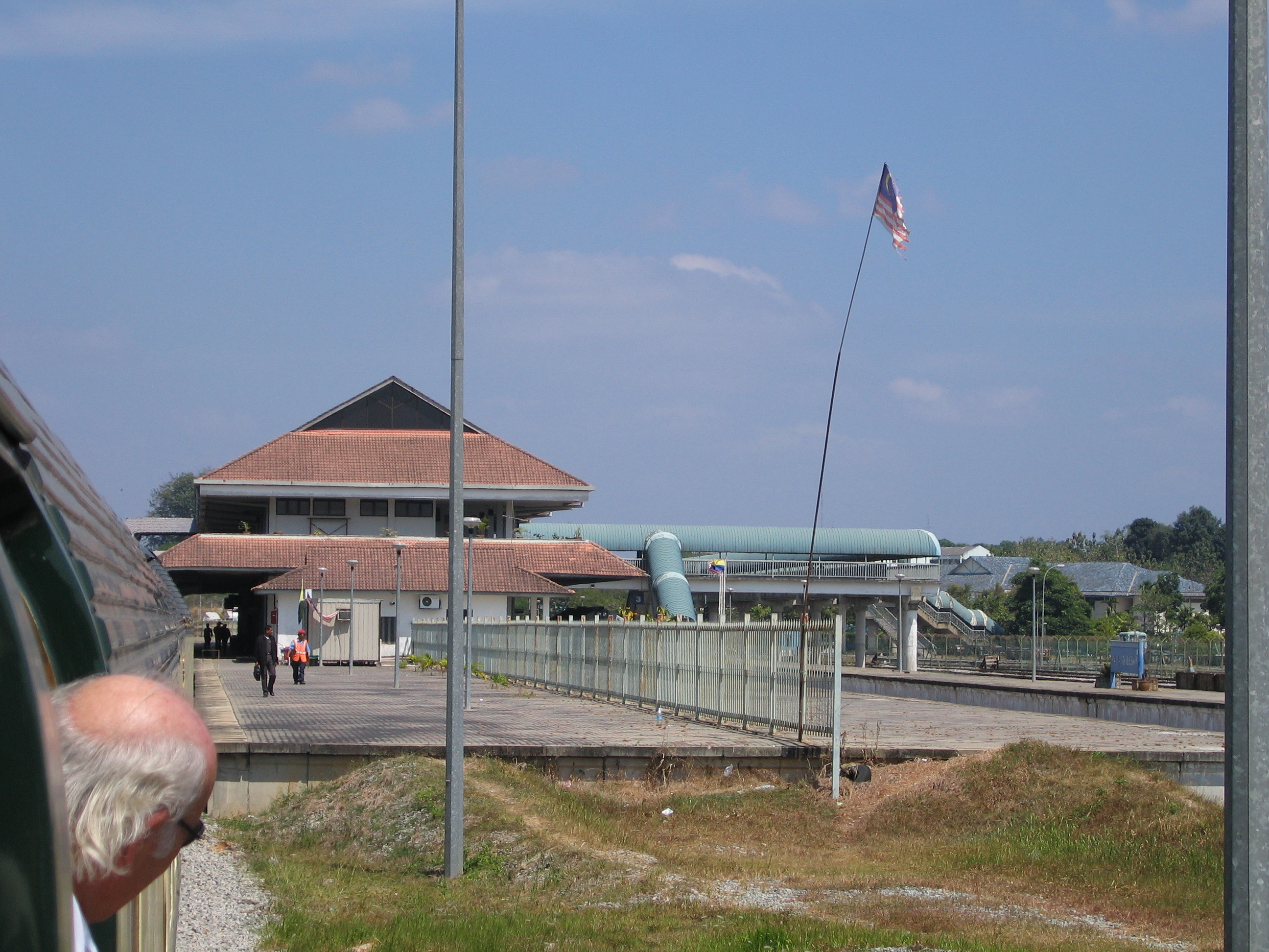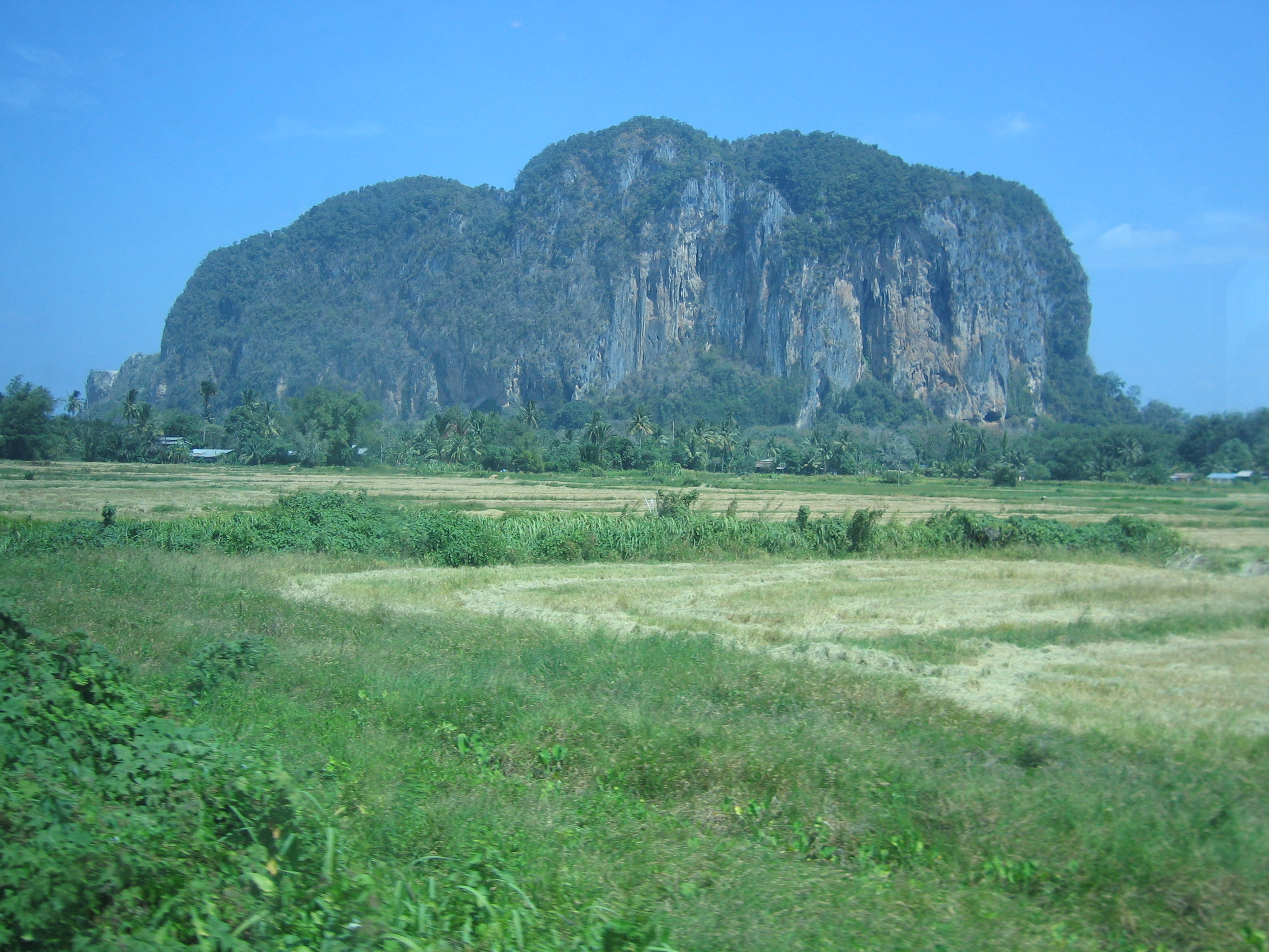 We got back on the bus, back on the ferry to the mainland, and then back on the train. Before we got off the bus, the tour guide informed us that on the island of Penang, 68 people perished in the tsunamis, but that they were all locals, as if that made it better somehow. After getting back on the train we ate lunch, this time by ourselves. After lunch we went back to the observation car, where it was noticeably warmer and also noticeably drier. Also, the scenery had changed, the forests had been replaced by low scrub and rice fields, and every so often there were large limestone outcroppings sticking out dozens of feet above the ground. One couple remarked that it looked like the San Joaquin Valley, so we struck up a conversation with them, figuring they were from northern California. They were from Marin County , but knew all about southern California as well, one of them having grown up in Pasadena . Also, the women's father (grandfather?) had been a trustee at Harvey Mudd College many years back, so it was a small world sort of thing. Crystal got bored of talking, so she went back and took a nap, Justin stayed out talking with the old folks, including a couple from Britain.