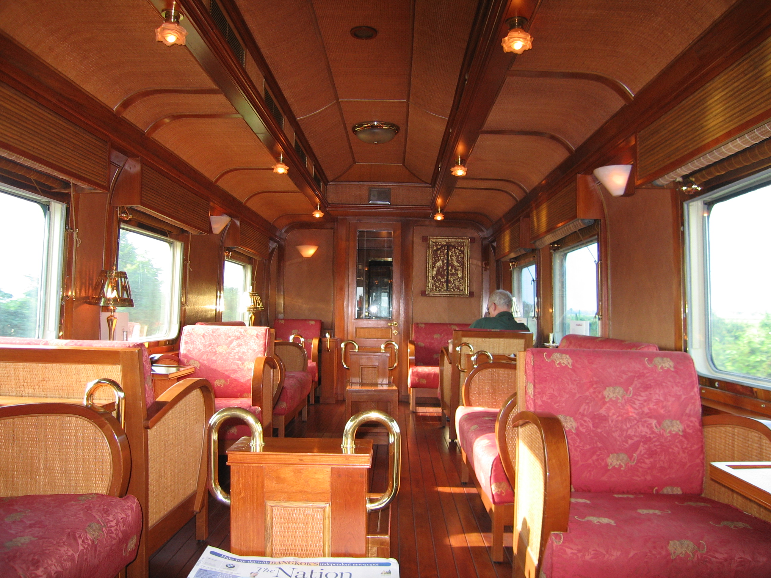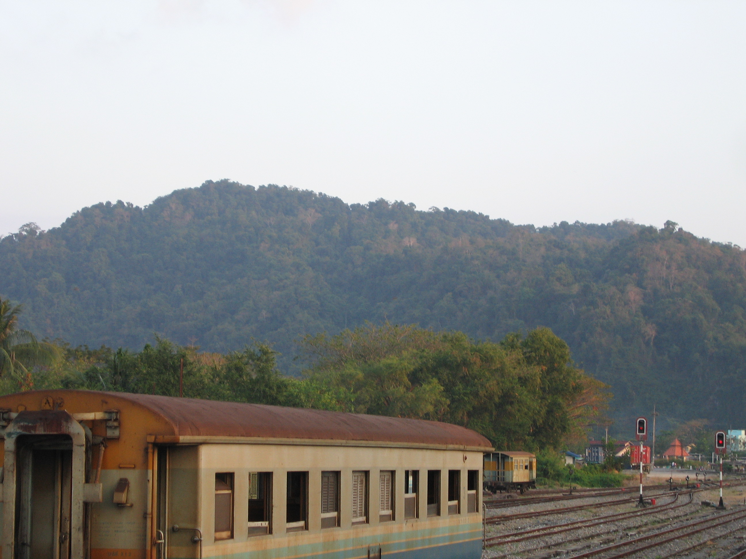 After a short while we passed into Thailand, signaling the end of our ability to read signs. The Thais use a different alphabet, so we wouldn't be able to learn the signs and recognize the words like we had in Malaysia. It became apparent that all the scenery was fields, so Justin, tired from no sleep the night before, went back to the room and took a short nap. We both went back to the observation car, this time with a video camera, as the captain had told us that around 5pm we'd be able to get some good footage of the train snaking up the mountainside. We did get some footage, but the snaking wasn't all that impressive, nor was the mountainside. We passed a number of small towns – Thailand seems to be both more and less developed than Malaysia. There are more developed areas, but the level of development in the developed areas doesn't seem to be as high.