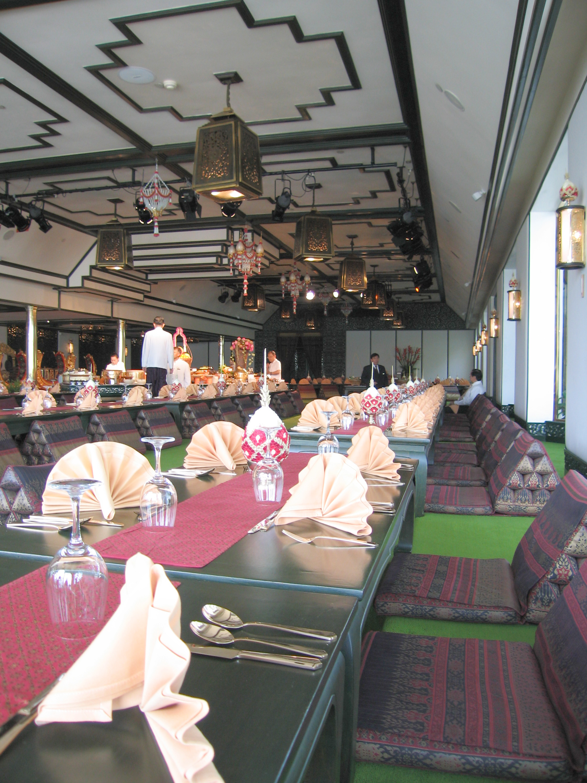 Back at the hotel we ate lunch at the free buffet. Since we were staying at least 3 nights, we got a coupon to have a free lunch at the authentic Thai buffet restaurant, across the river by the gym. Since the Oriental ran out of room on the East side of the river, when it wanted to expand it just built on the opposite side of the river and started having a boat go back and forth all day. The trip across the river is very short. The restaurant had tables about 18" off of the ground, like you see at Sushi restaurants. Fortunately, there was a lowered floor underneath the table so that people with limited flexibility (Justin) could just sit on the floor without any problems.