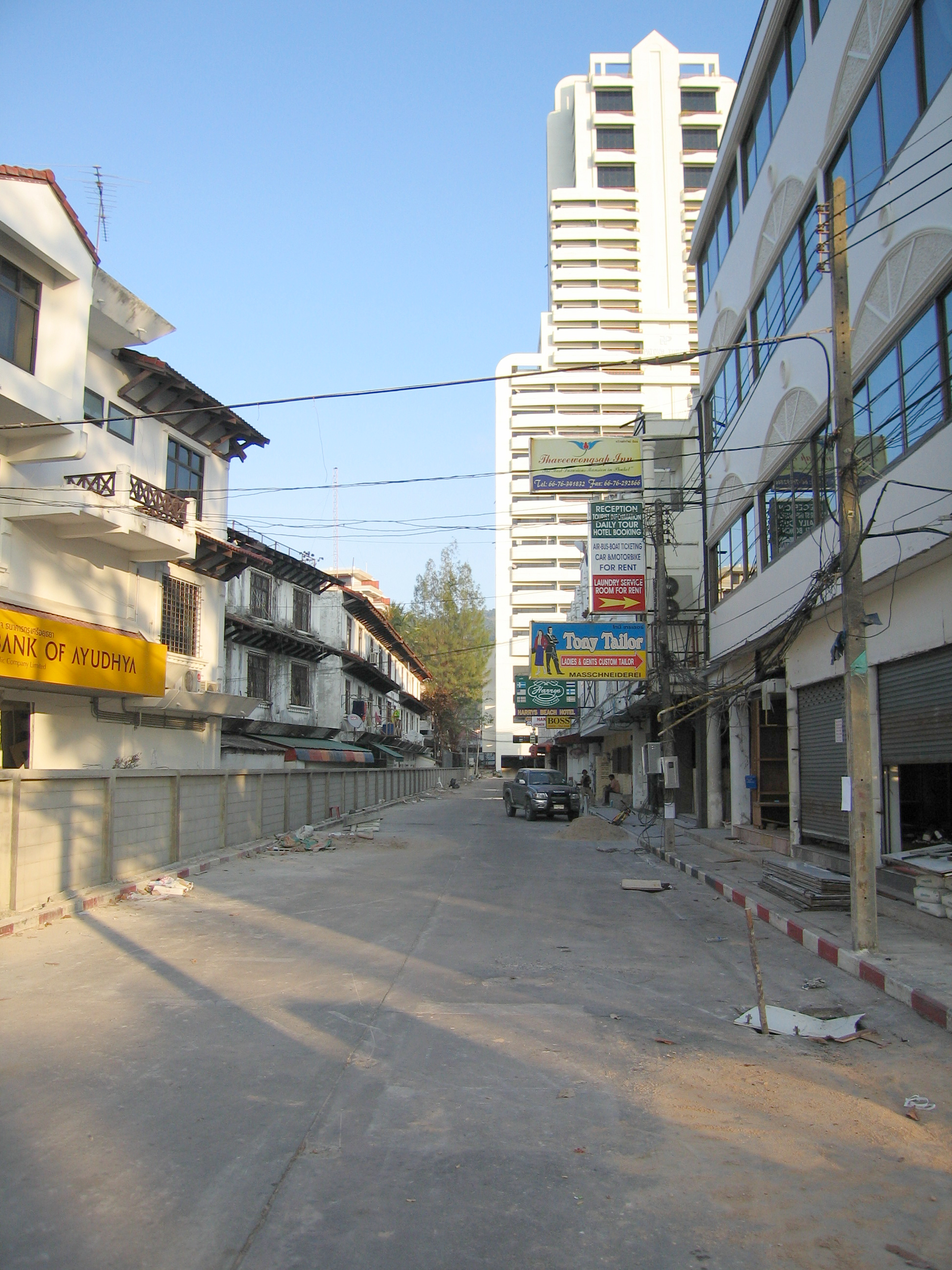 We met up again and had a late lunch. Since there wasn't much to do at the resort and we wanted to buy some souvenirs, we went to Patong Beach, which is one of the most popular beaches on Phuket, about 20 minutes south of Amanpuri. Patong Beach is the beach that was hardest hit by the tsunami. The streets and shops were empty. Some of the shops were open, some were still closed but had almost completed their repairs, and others still looked demolished. The Amanpuri employee that took us to Patong told us that it is usually hard to get through the streets of Patong during a normal high season. We did find one market area that was open (we were literally the only customers), so we opted to get out of the car there. Since bargaining is expected in Thailand , we bargained for the souvenirs. Justin proved to be a better bargainer than Crystal (although we may have both been horrible), but the best deal we got was by not bargaining – walking out of the store, only to have the owner call a price out to us on the street.
